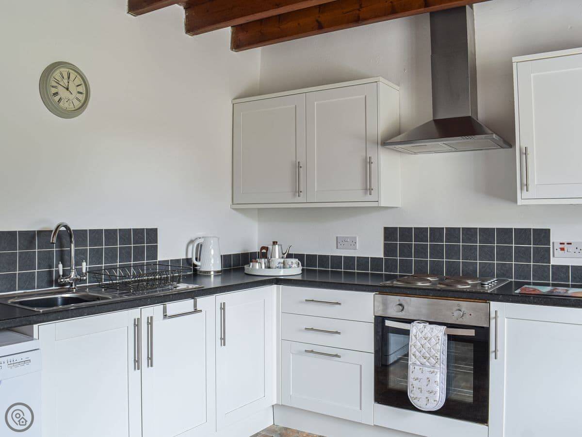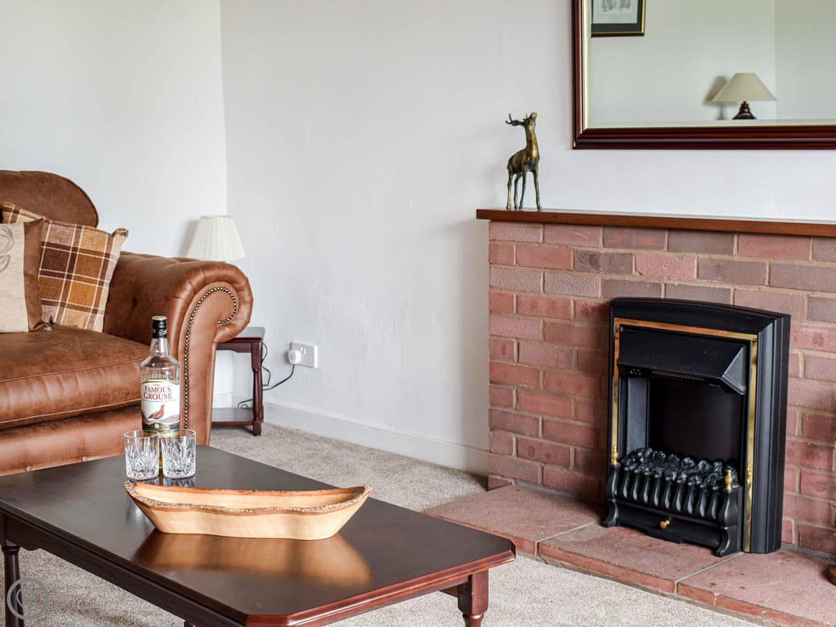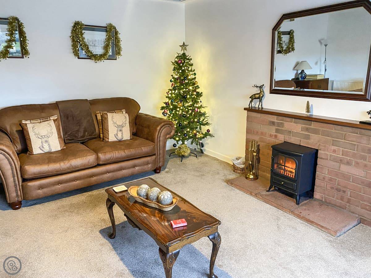 Inside, it's straightforward. Two sofas, a TV, a wood burner effect stove, and a cupboard with books and games. The kitchen has what you need. There's a highchair and a cot if required. Both bathrooms are on the ground floor.