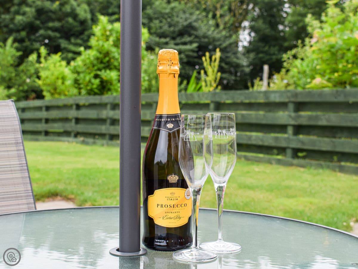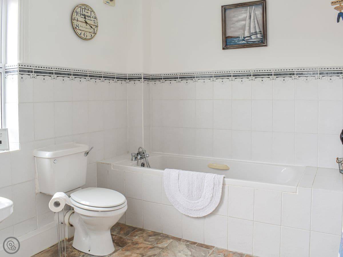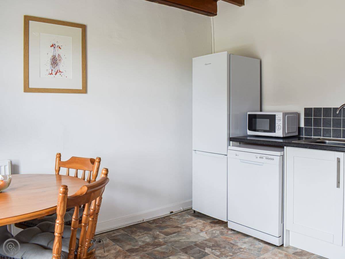 Inside, it's straightforward. Two sofas, a TV, a wood burner effect stove, and a cupboard with books and games. The kitchen has what you need. There's a highchair and a cot if required. Both bathrooms are on the ground floor.