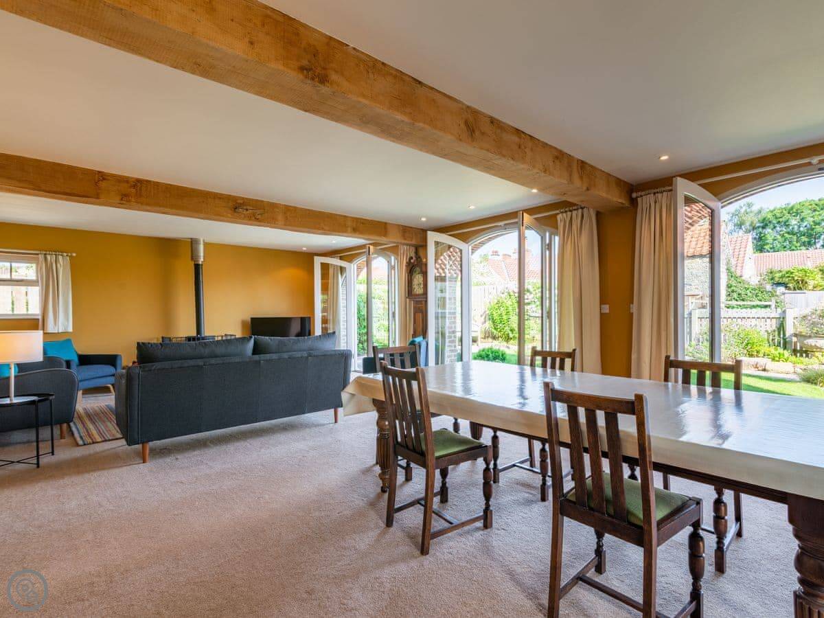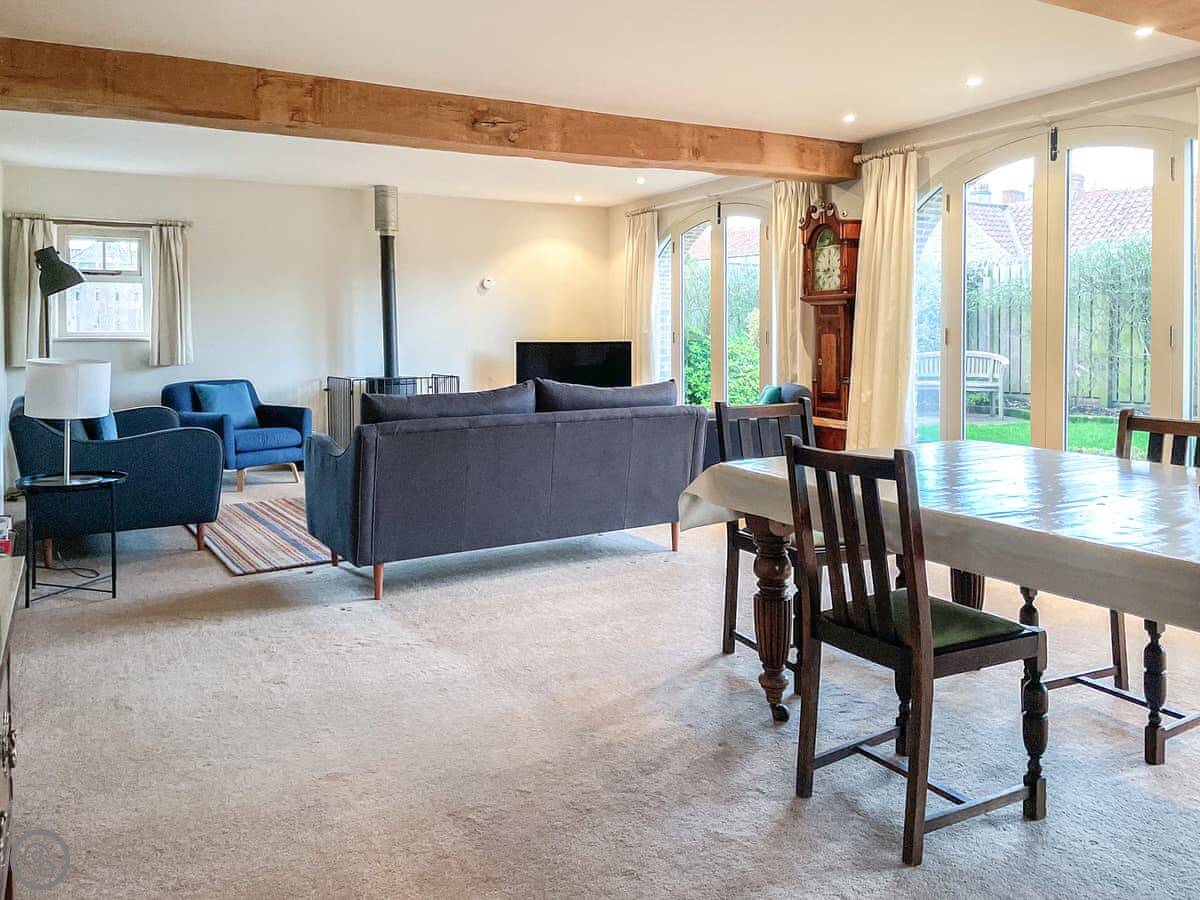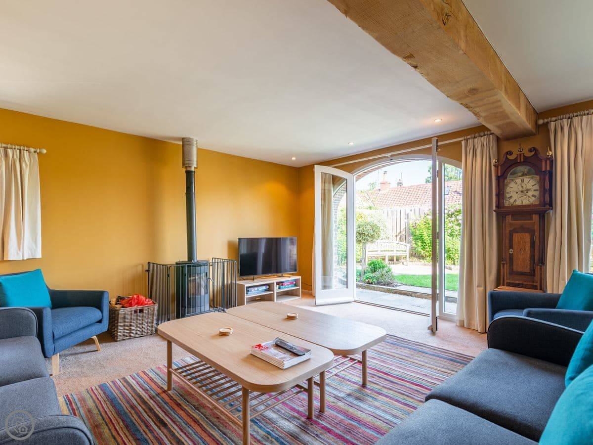 The main living room is open plan, with glass doors looking onto the garden. There are comfy sofas, a TV, and a wood burning stove. It's a light room.