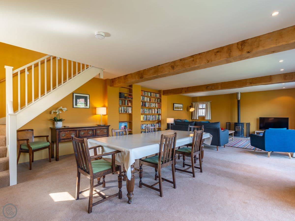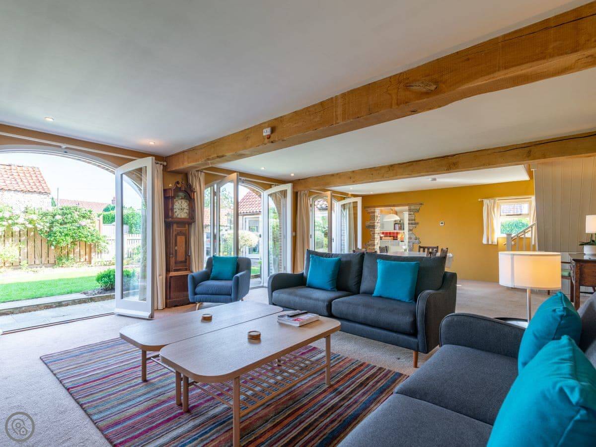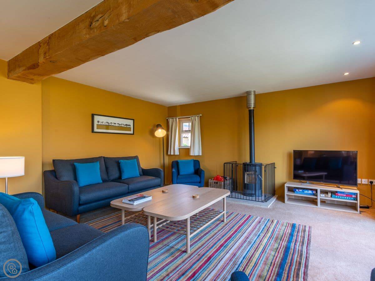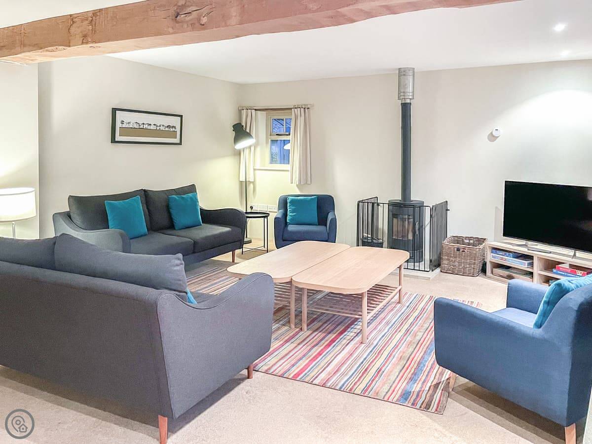 The main living room is open plan, with glass doors looking onto the garden. There are comfy sofas, a TV, and a wood burning stove. It's a light room.