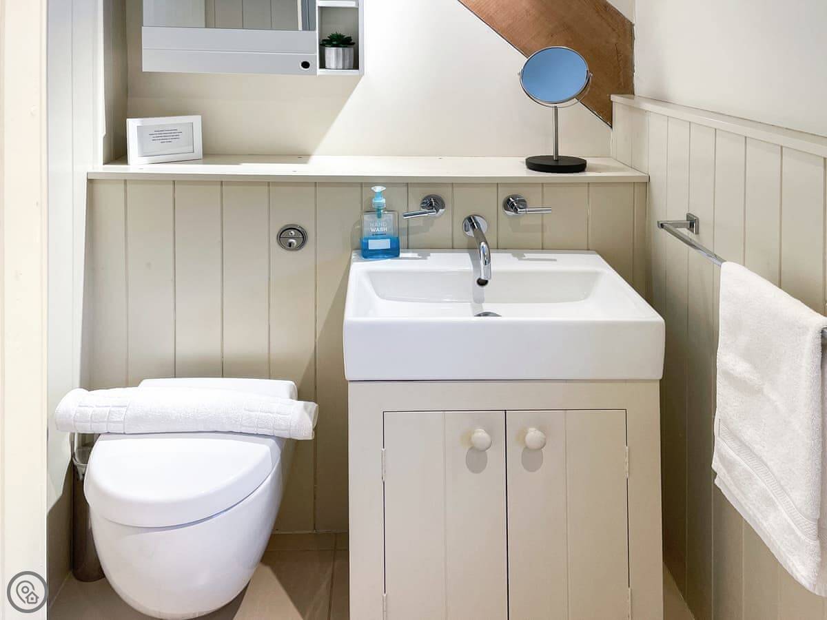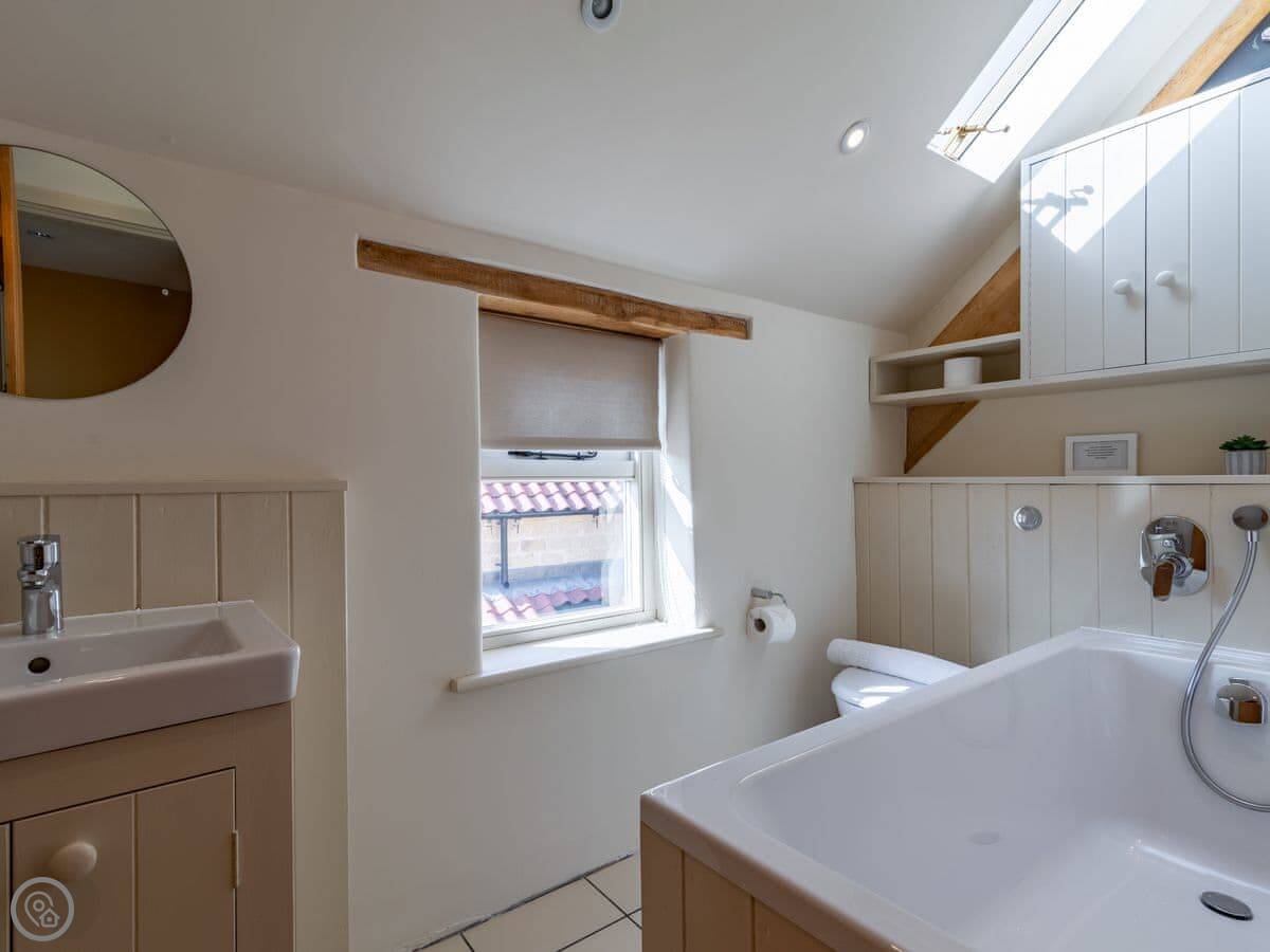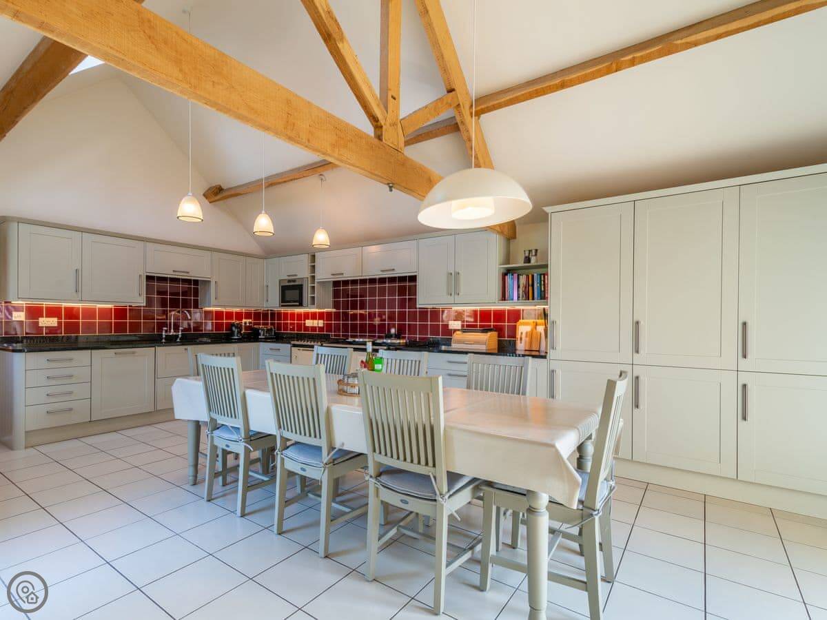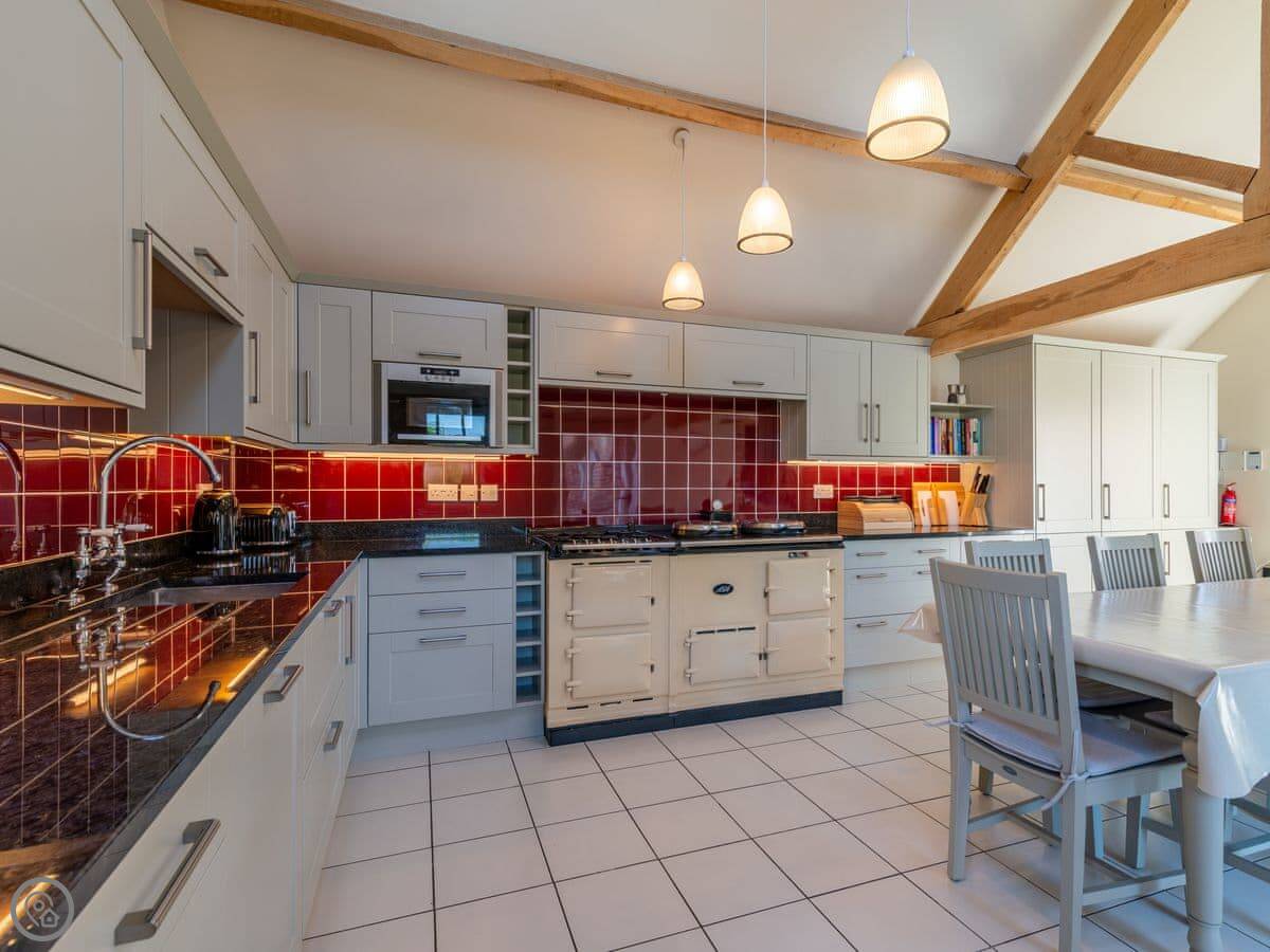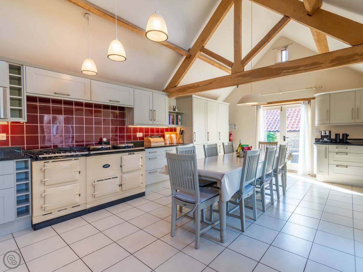 The kitchen is big and modern, with an Aga. There's also a gas stove and oven next to it, as a back-up. The underfloor heating is good. Doors lead out to a private courtyard and the garden. There's a separate utility room with a washing machine and a toilet.