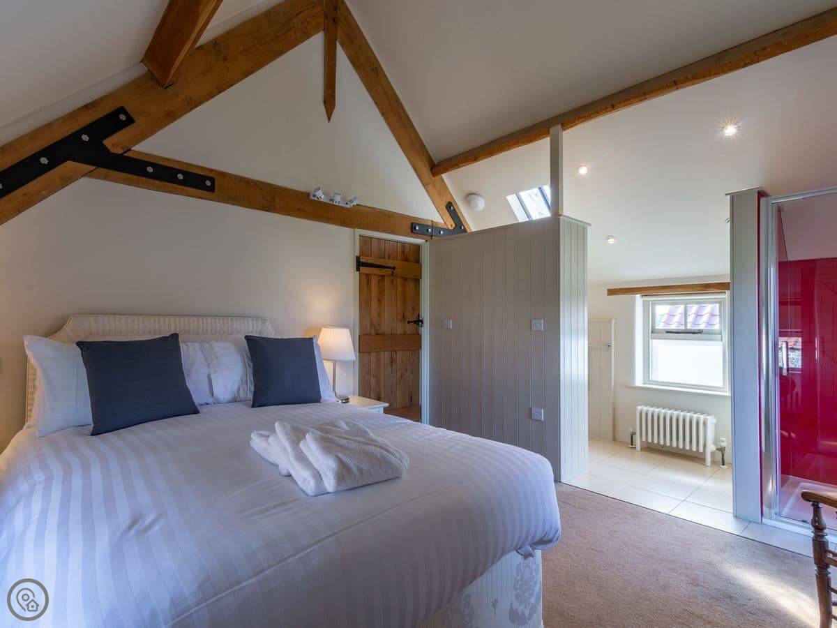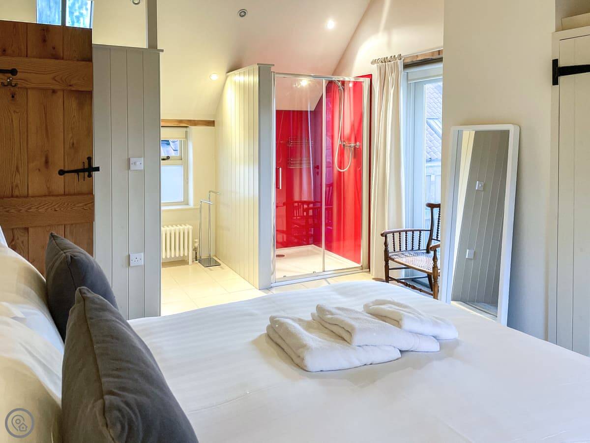 It sleeps six, with three bedrooms and two bathrooms. One double has an en-suite shower. There's a twin room that can be made into a king bed if you ask us first. It's a 4 Star place, which means it's comfortable and well finished.