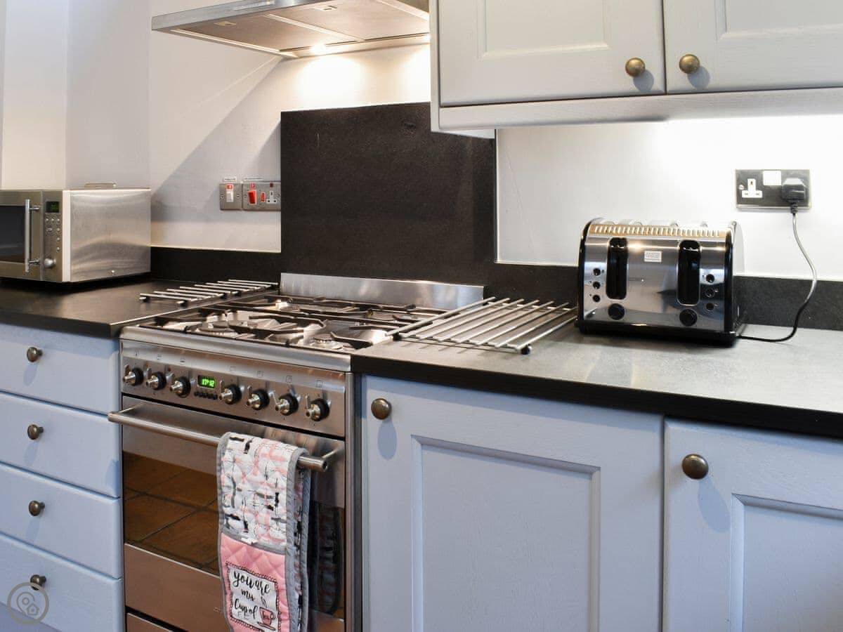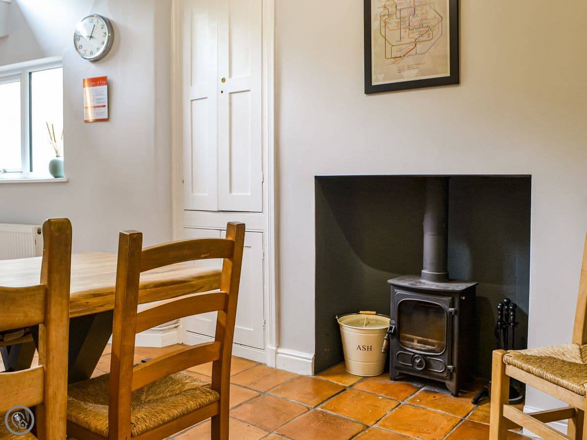 The living room has a gas fire. The kitchen has a wood burning stove, which is nice. The garden is out the back. It's on a few different levels with some steps, but it gets the sun in the afternoon.