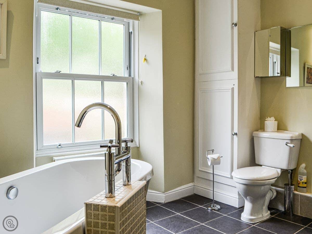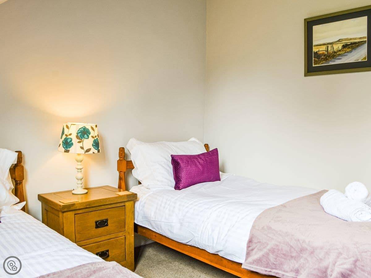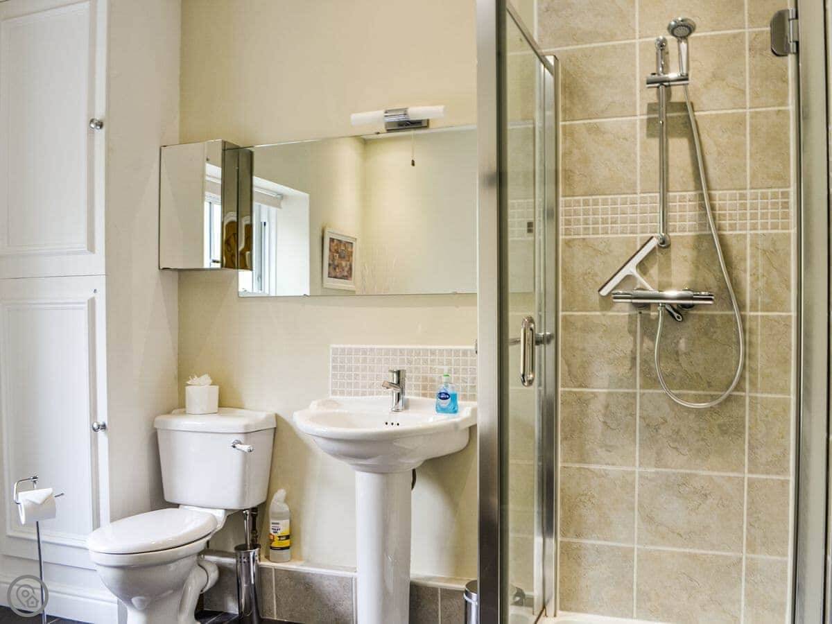 It sleeps six. Three bedrooms, one bathroom. The bathroom is on the first floor and has a bath and a separate shower. Two bedrooms are up another flight of stairs. The stairs are steep, as you'd expect. It's a 4 Star place, so it's in good order.