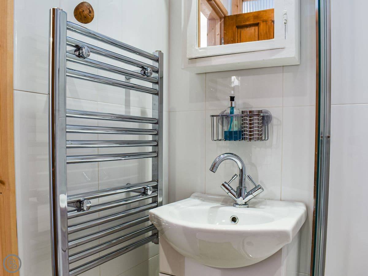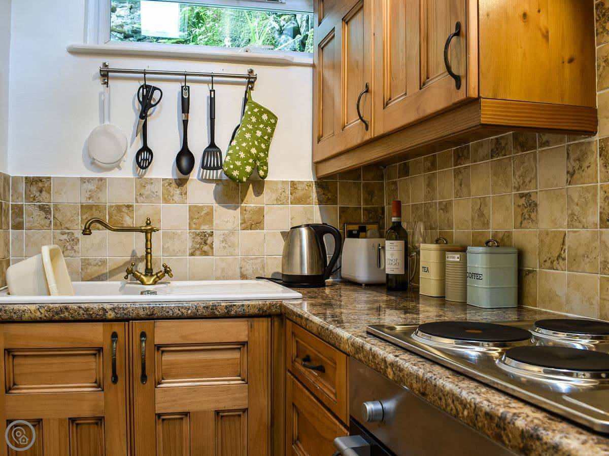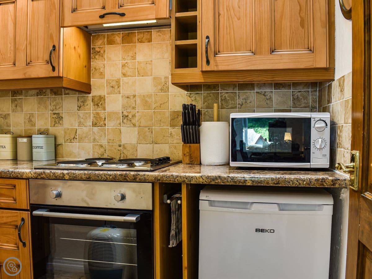 The bedroom and shower room are on the lower ground floor. The stairs inside are fairly steep, just so you know. Upstairs is the living room, dining area, and kitchen. There's a wood burner. The kitchen has what you need, nothing fancy.