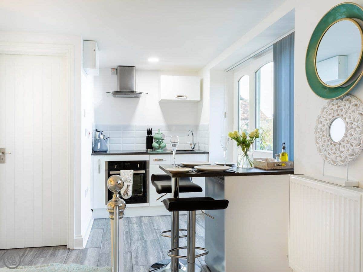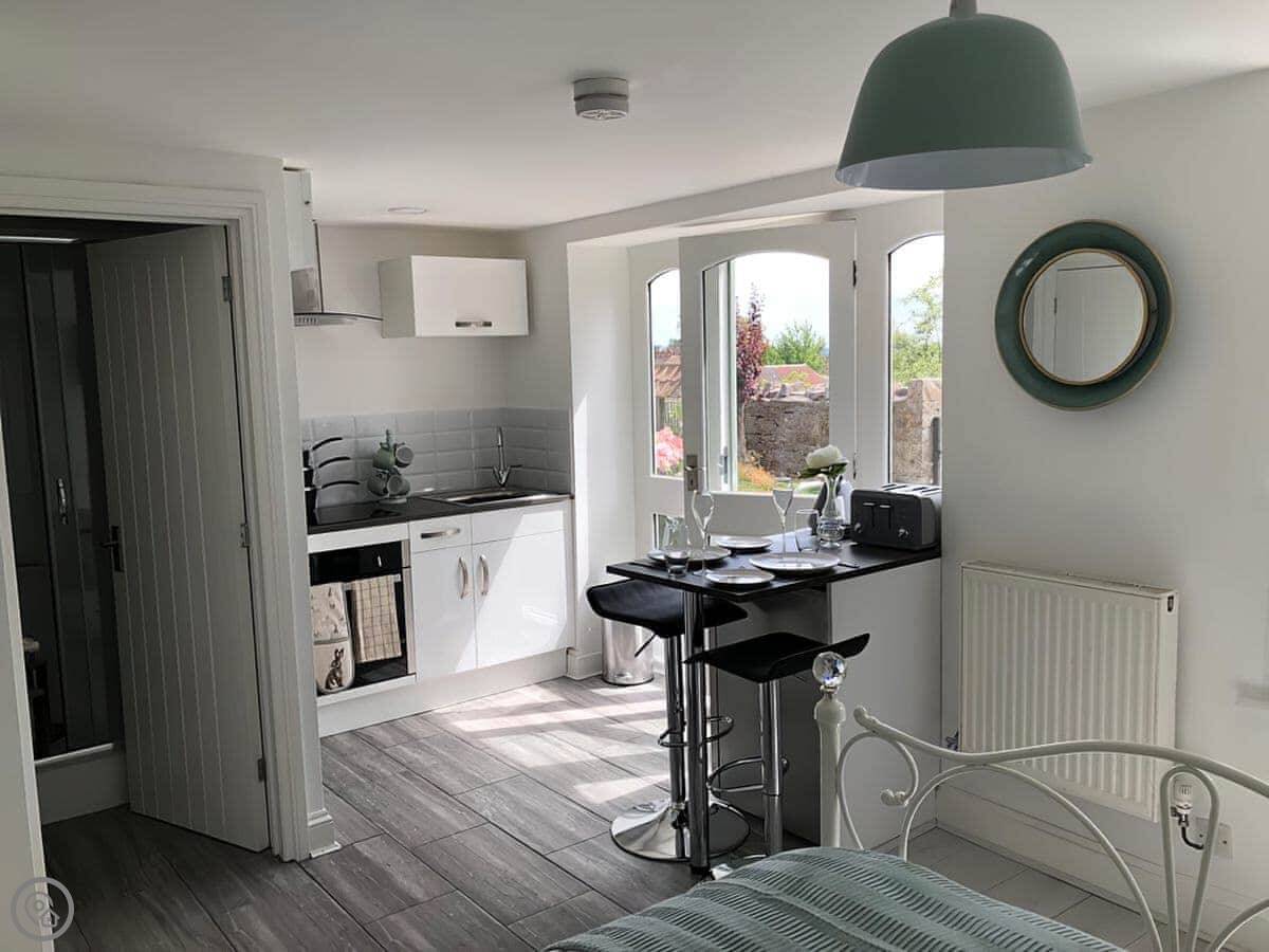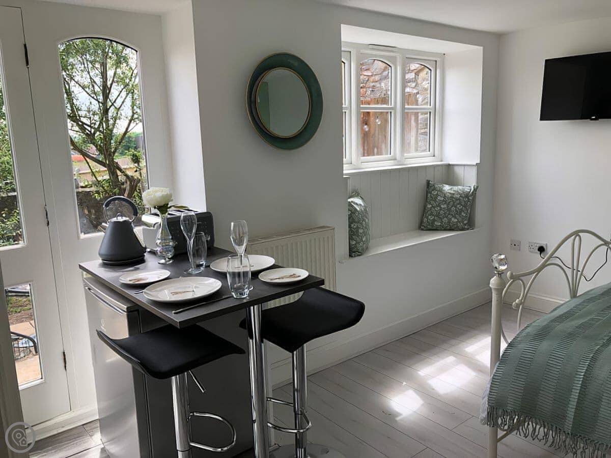 Meadow View is a studio apartment. It's part of a converted barn on the edge of Cheddar. We live next door. The barn is old, from 1708.