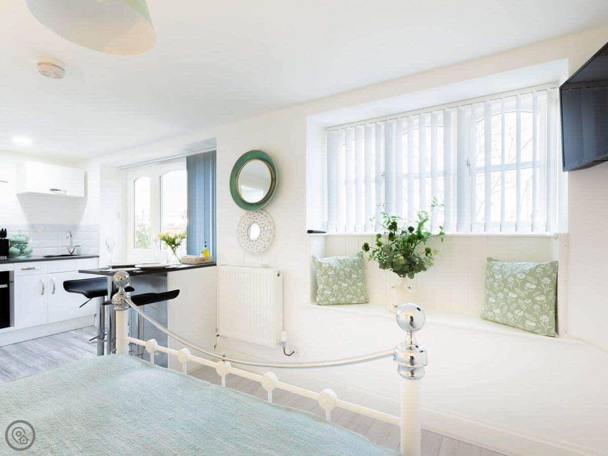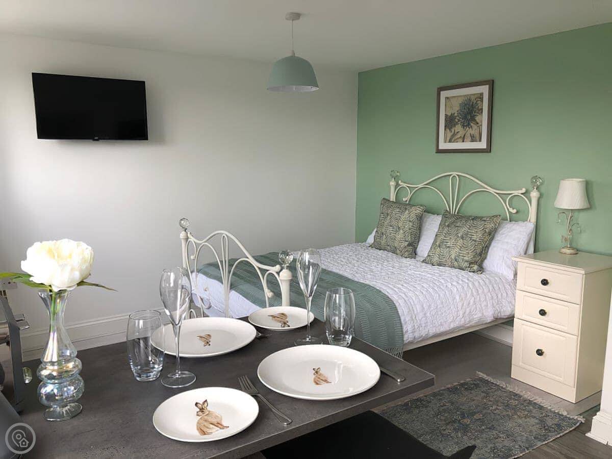It's for two people. One open-plan room with a double bed, kitchen area and shower room. There's a smart TV. It's got a 4 Star rating. It's clean. The finish is nice.