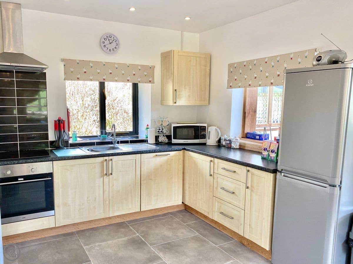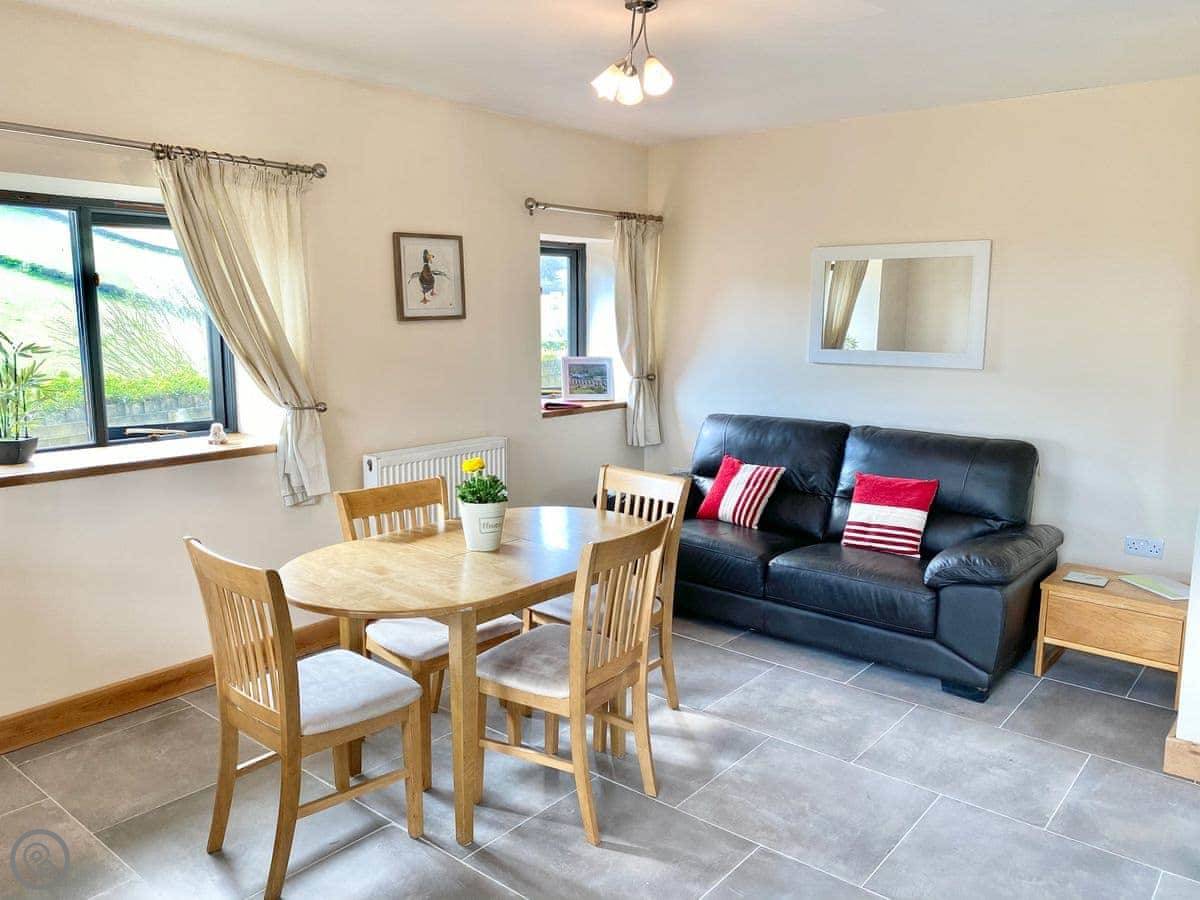 It sleeps four. Two bedrooms, one bathroom, all on the ground floor. It's got a 4 Star rating. It's comfortable and clean. The layout is open plan, with the living room, dining area and kitchen all in one space.