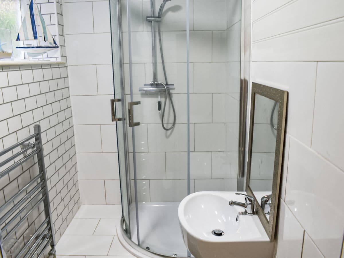 It's for two people. One bedroom with an en-suite shower. The living area is open plan with the kitchen. Outside, you have a private courtyard, and then there are about three acres of grounds to walk in. The view is over the valley, mostly fields and hop vines.