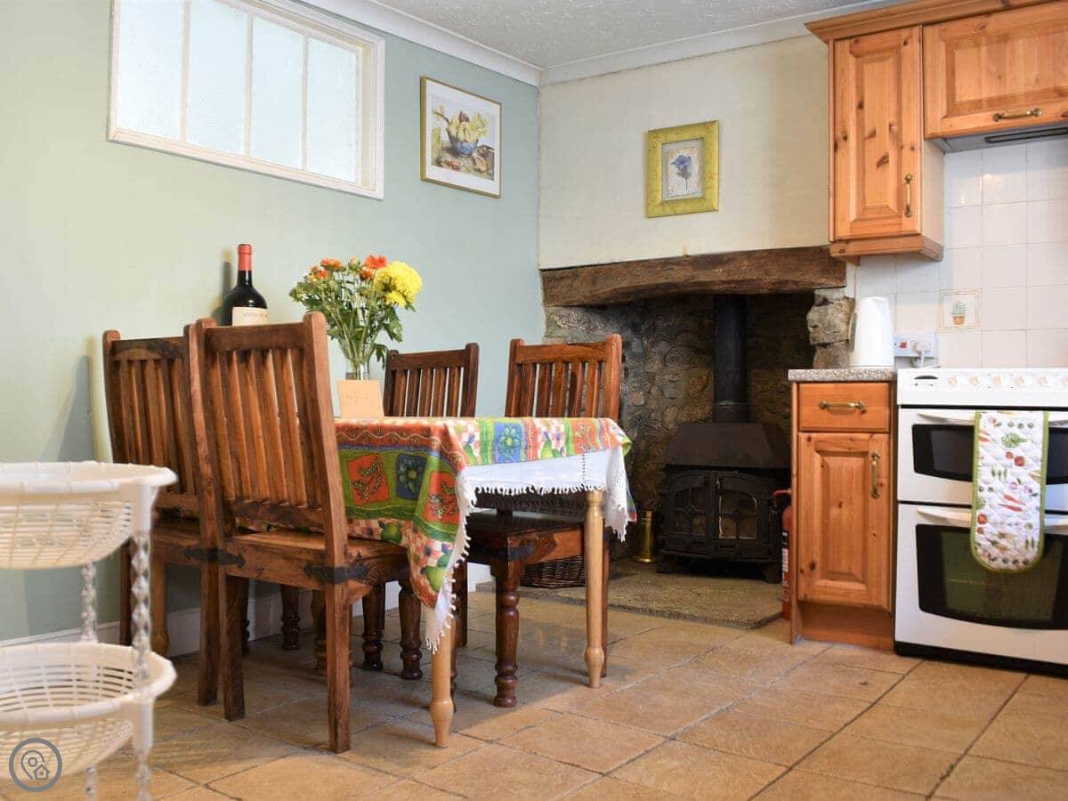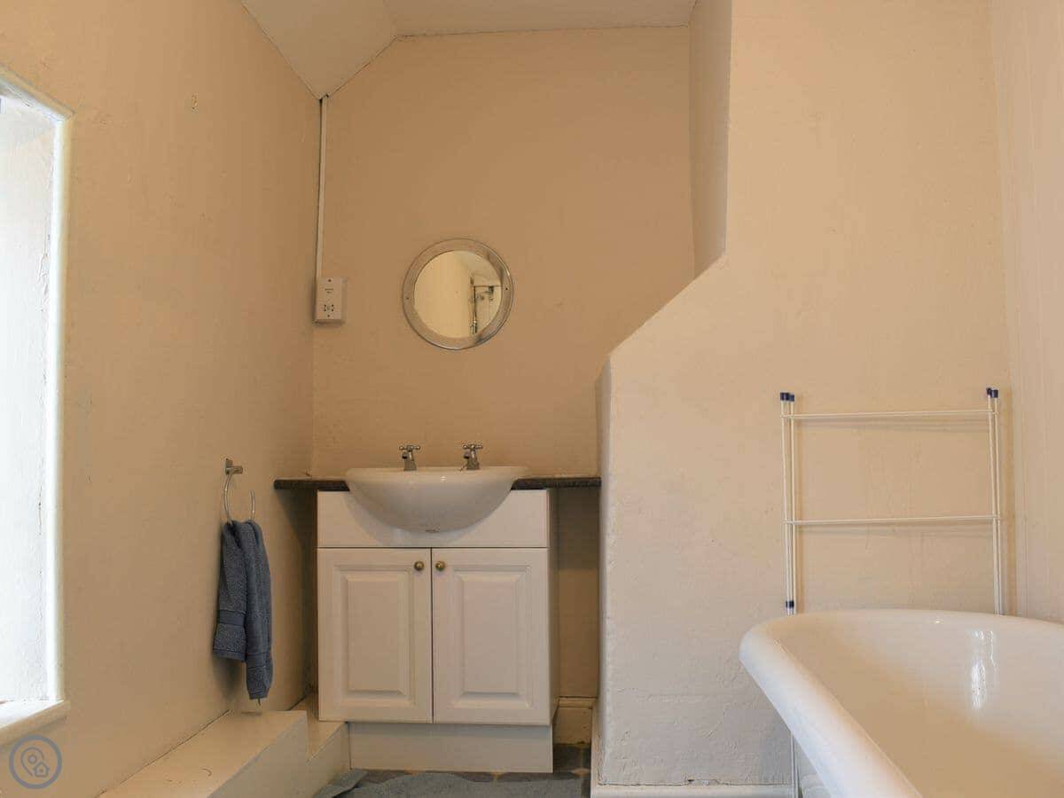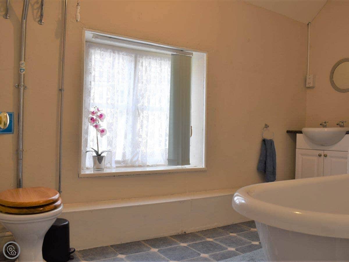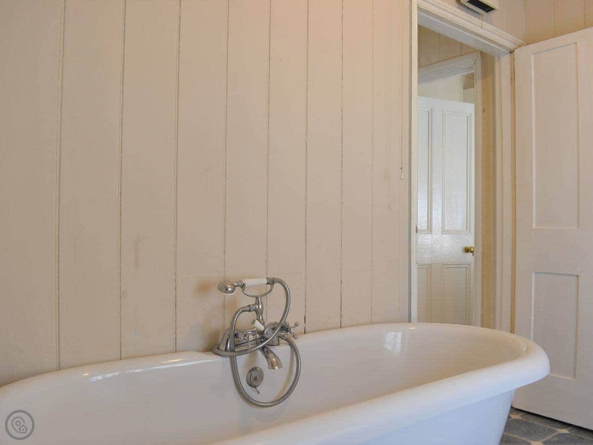You've got a kitchen with a dining table and a wood burner. The living room has a sofa and a TV. Upstairs there are two bedrooms, one double and one twin. There are two bathrooms, one is en-suite to the double room with a shower, and there's a family bathroom with a freestanding bath.