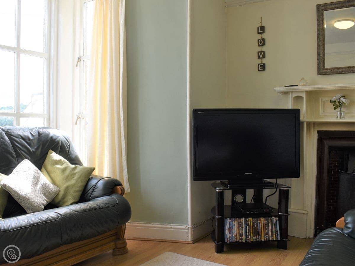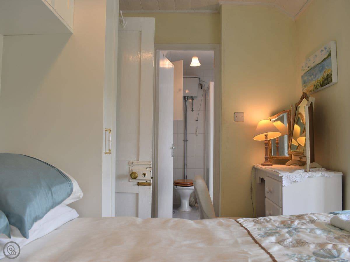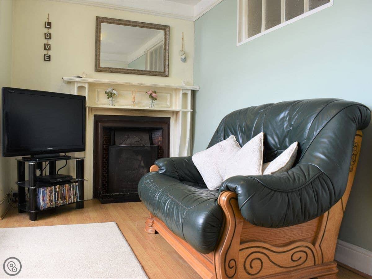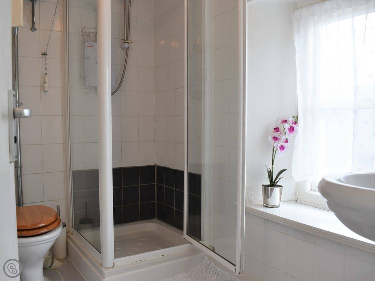 You've got a kitchen with a dining table and a wood burner. The living room has a sofa and a TV. Upstairs there are two bedrooms, one double and one twin. There are two bathrooms, one is en-suite to the double room with a shower, and there's a family bathroom with a freestanding bath.