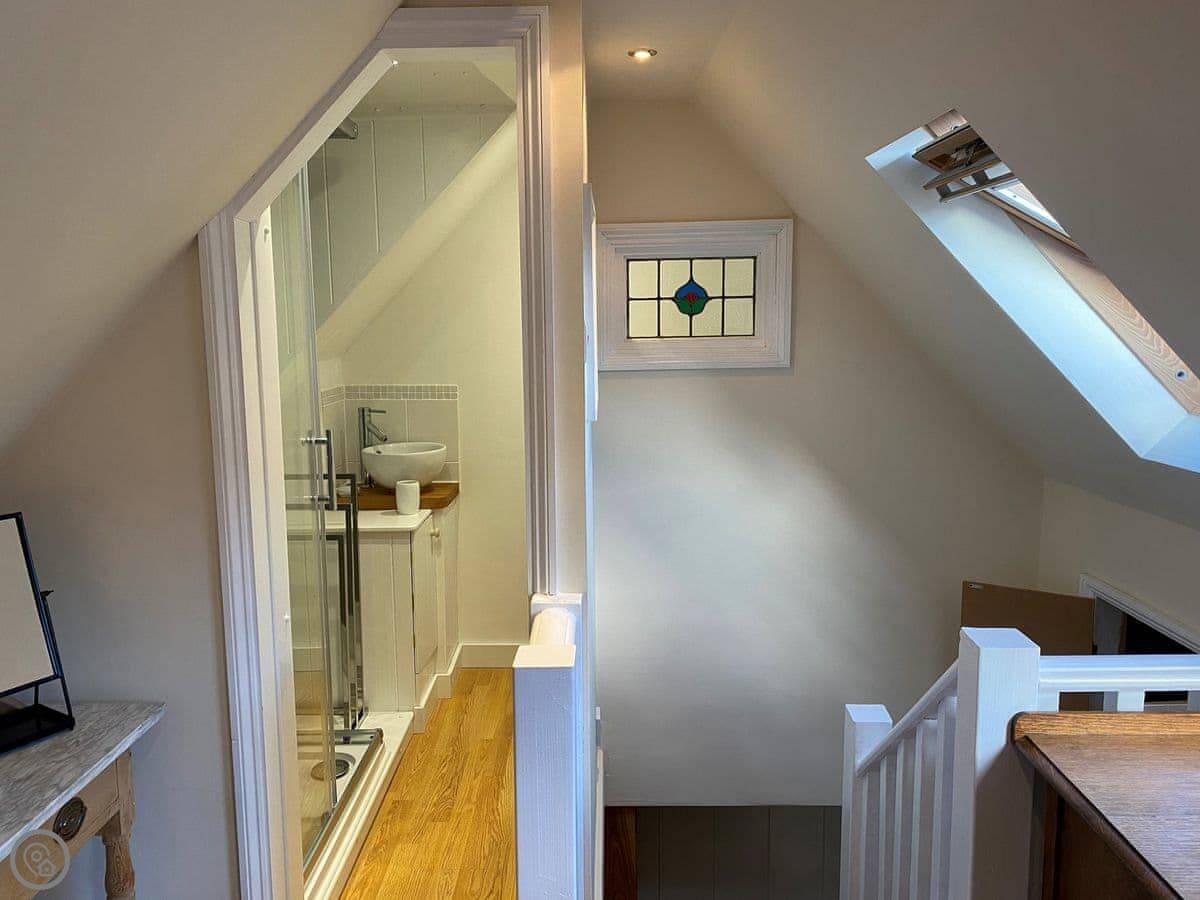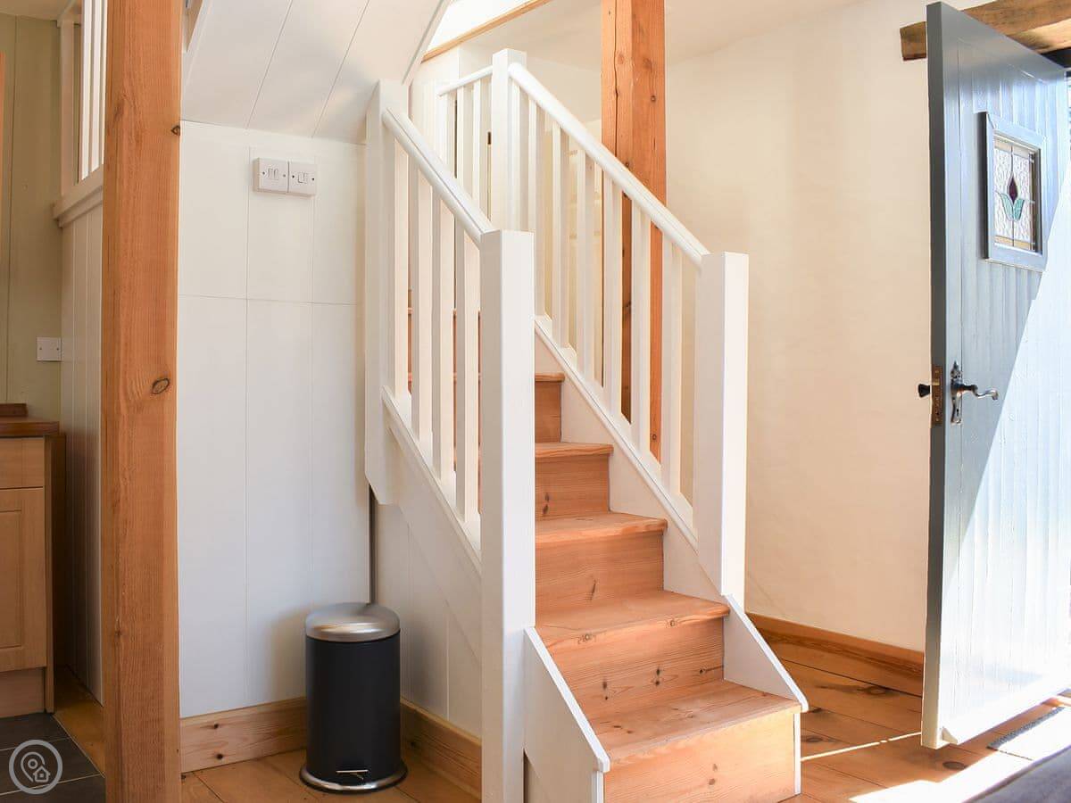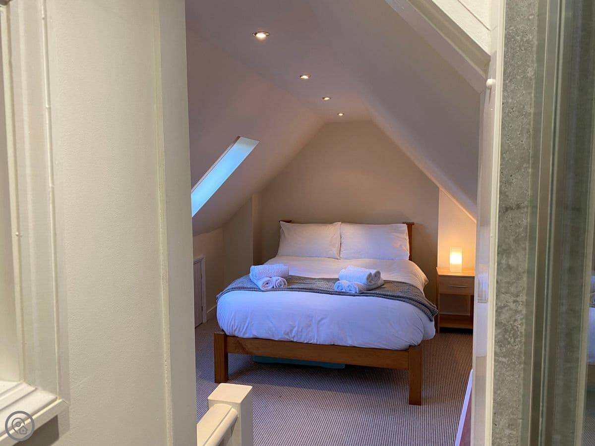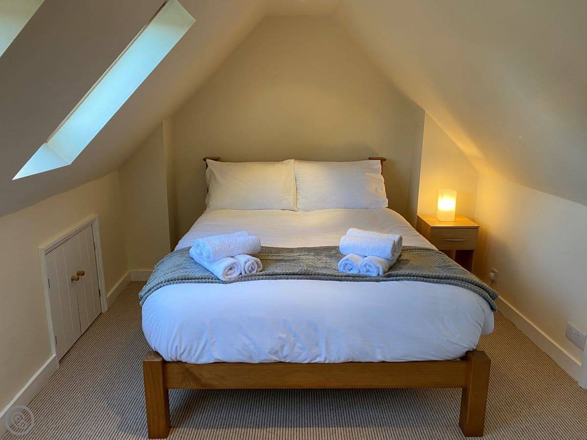 Heading up to the first floor, you will find a beautifully furnished bedroom with a double bed. Guests should be aware that there are sloping ceilings upstairs, so the height is limited.