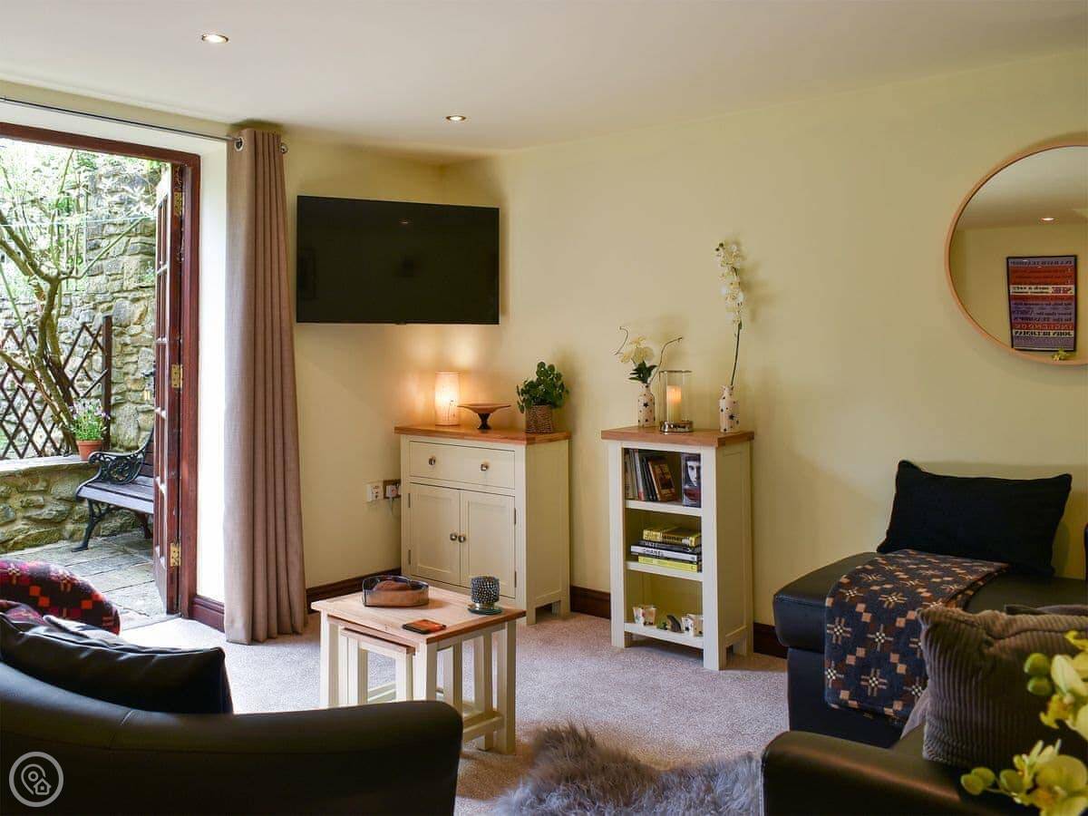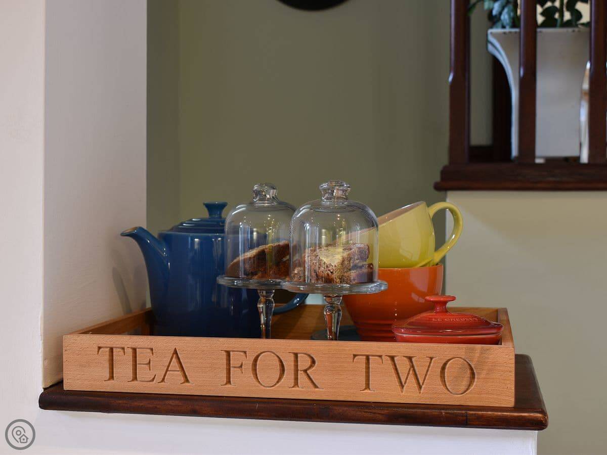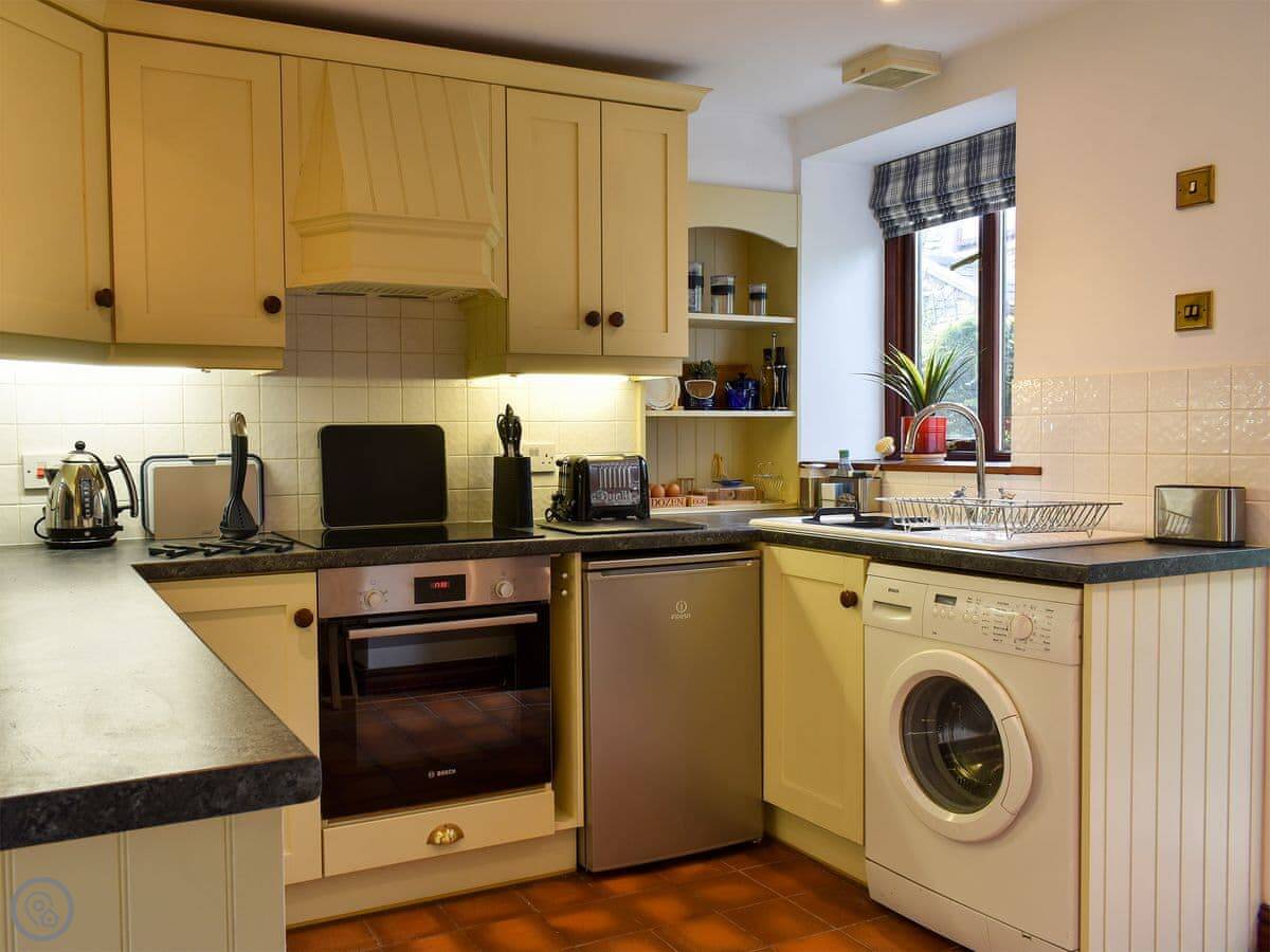 It's for two people. One bedroom, one bathroom. It's got a 4 Star rating, which means it's comfortable and well-fitted, but it's still just a cottage in a garden. You come through a shared courtyard to get to it. The kitchen is nice, and there are patio doors from the living room out to your terrace.