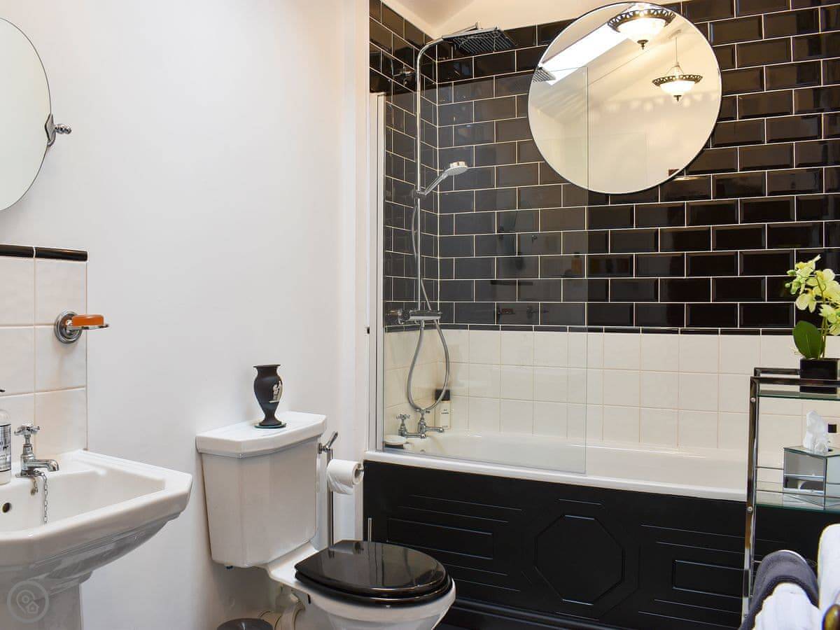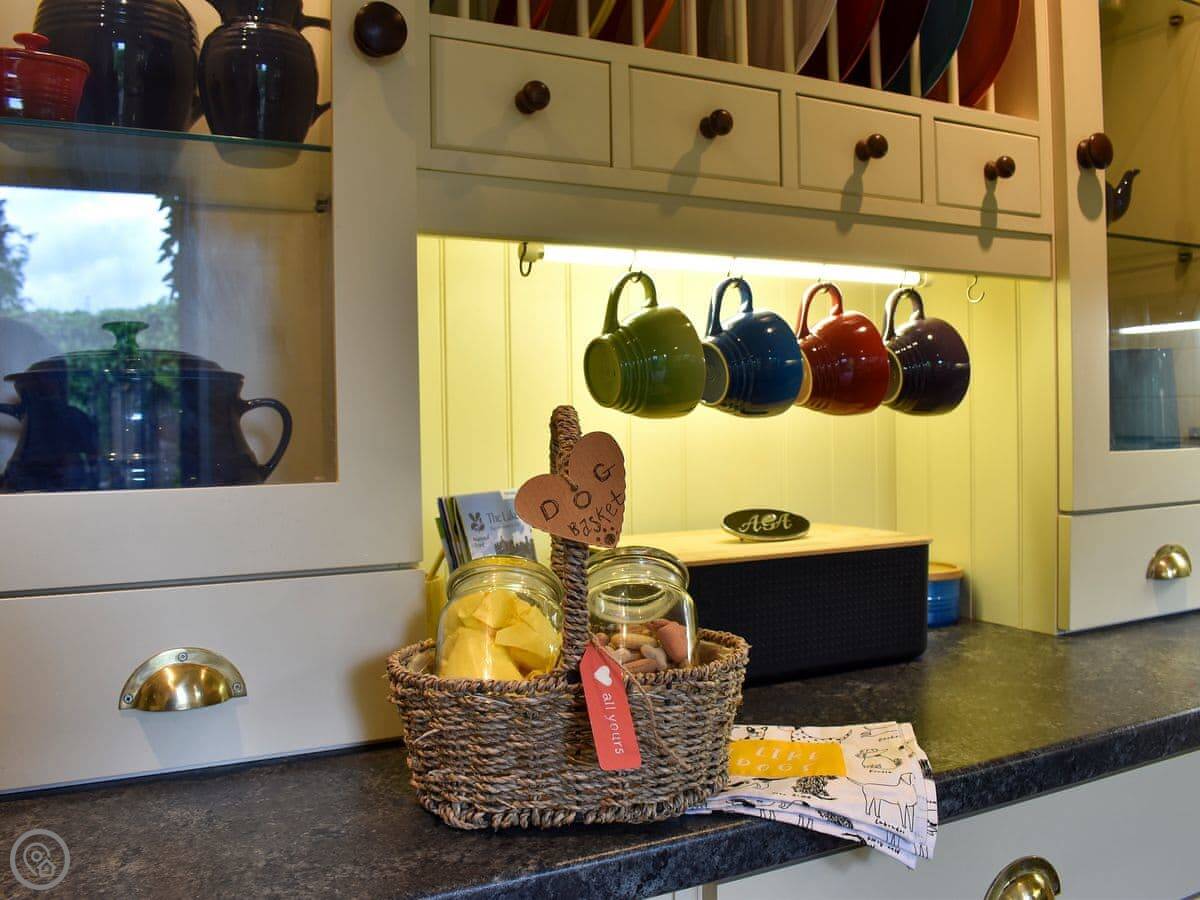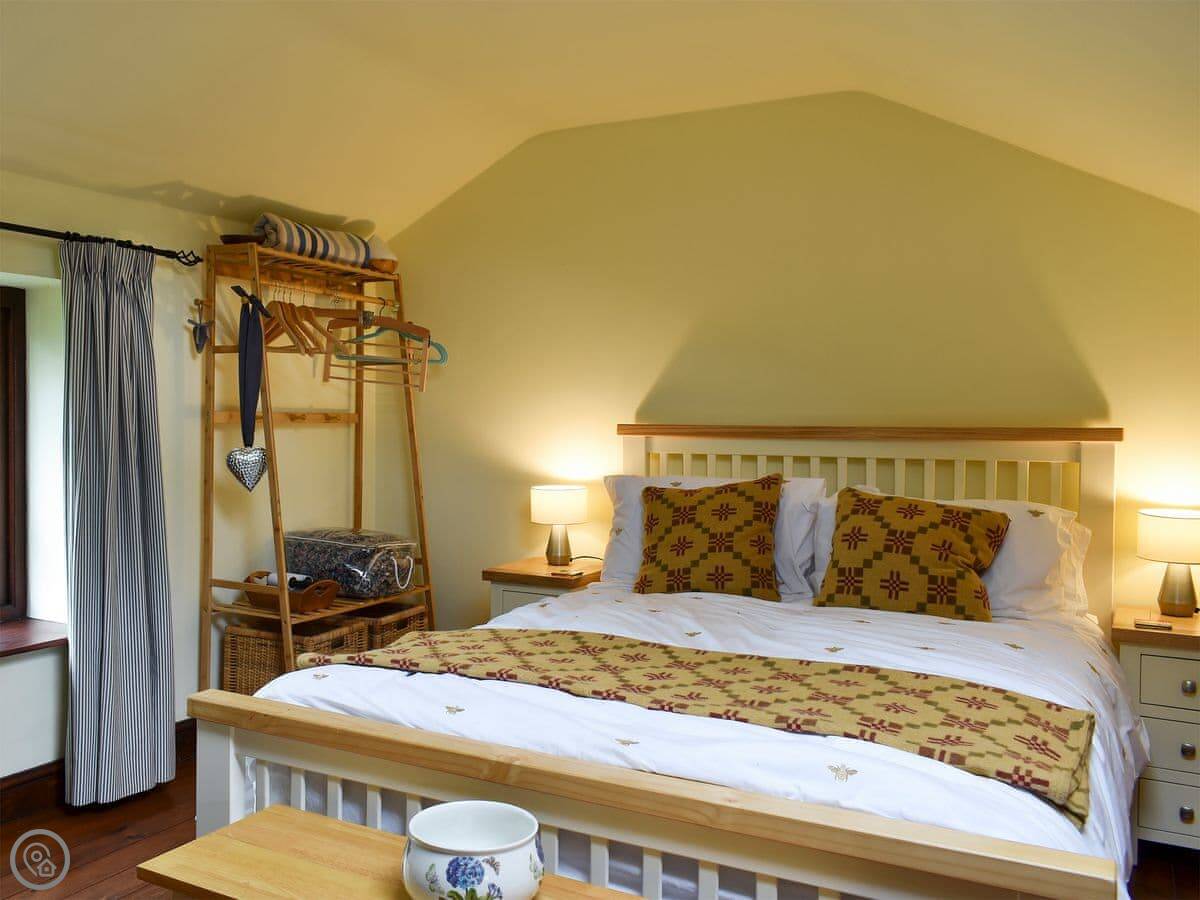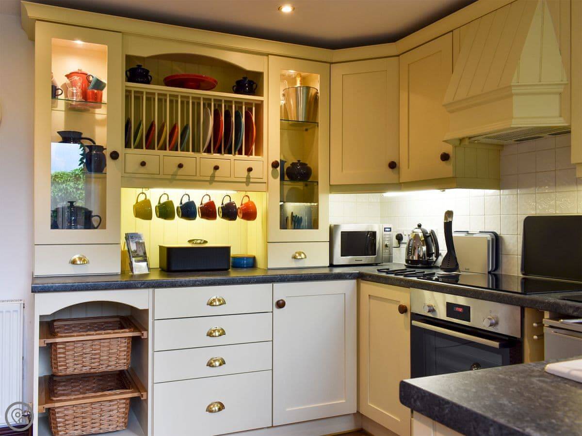 It's for two people. One bedroom, one bathroom. It's got a 4 Star rating, which means it's comfortable and well-fitted, but it's still just a cottage in a garden. You come through a shared courtyard to get to it. The kitchen is nice, and there are patio doors from the living room out to your terrace.
