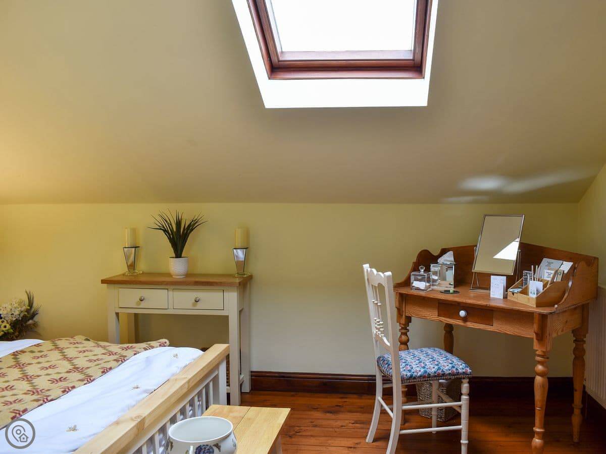 The bedroom has a skylight. You can lie in bed and see the stars if it's clear. The stairs are a normal flight, nothing too steep.