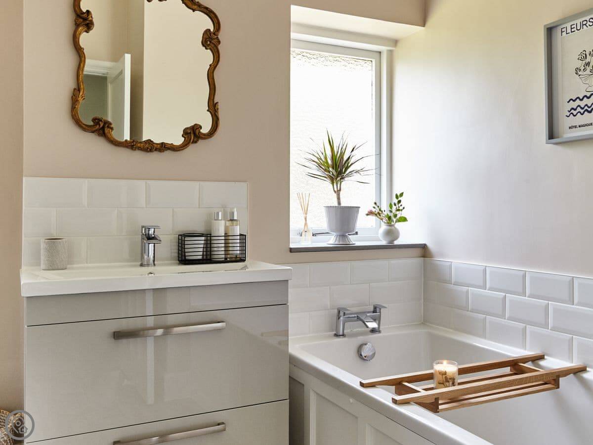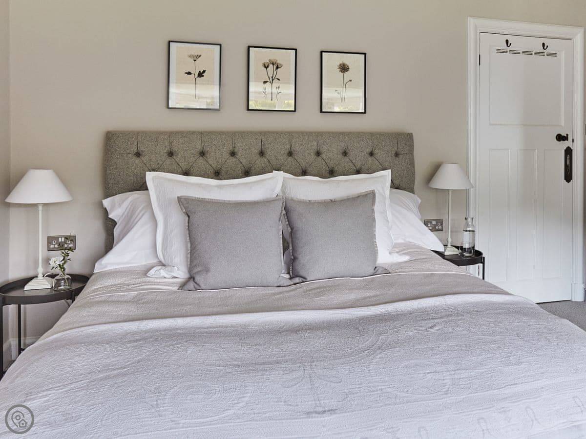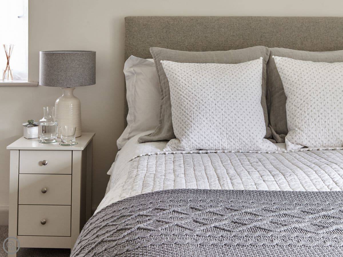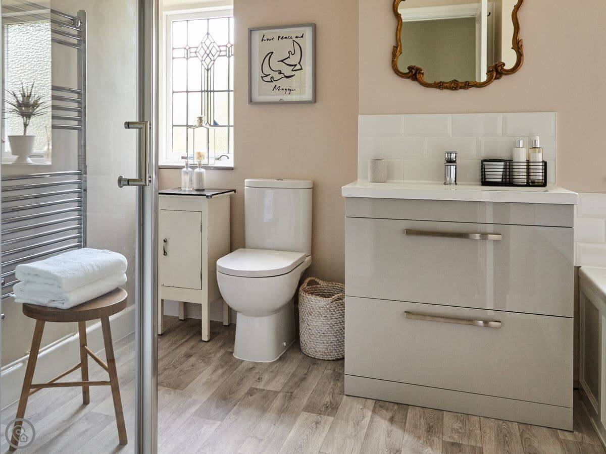 It sleeps six. There are three bedrooms and, unusually for round here, three bathrooms. It's a 5 Star place, which means it's been done up to a good standard. We've used White Company stuff for the furniture and linen. The main bathroom has grab rails and a shower seat.
