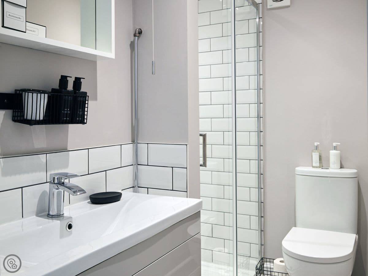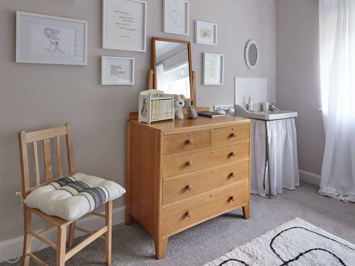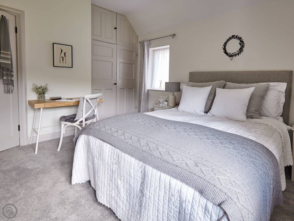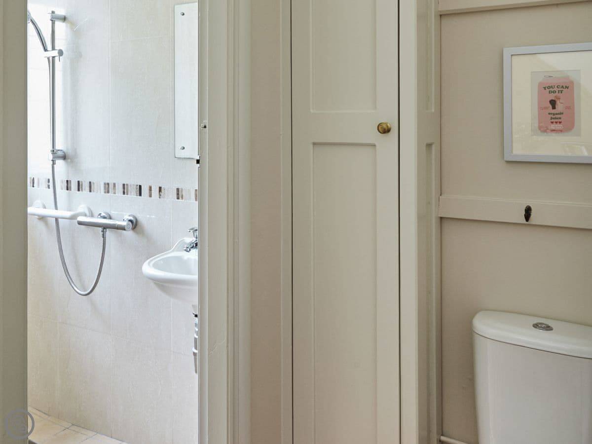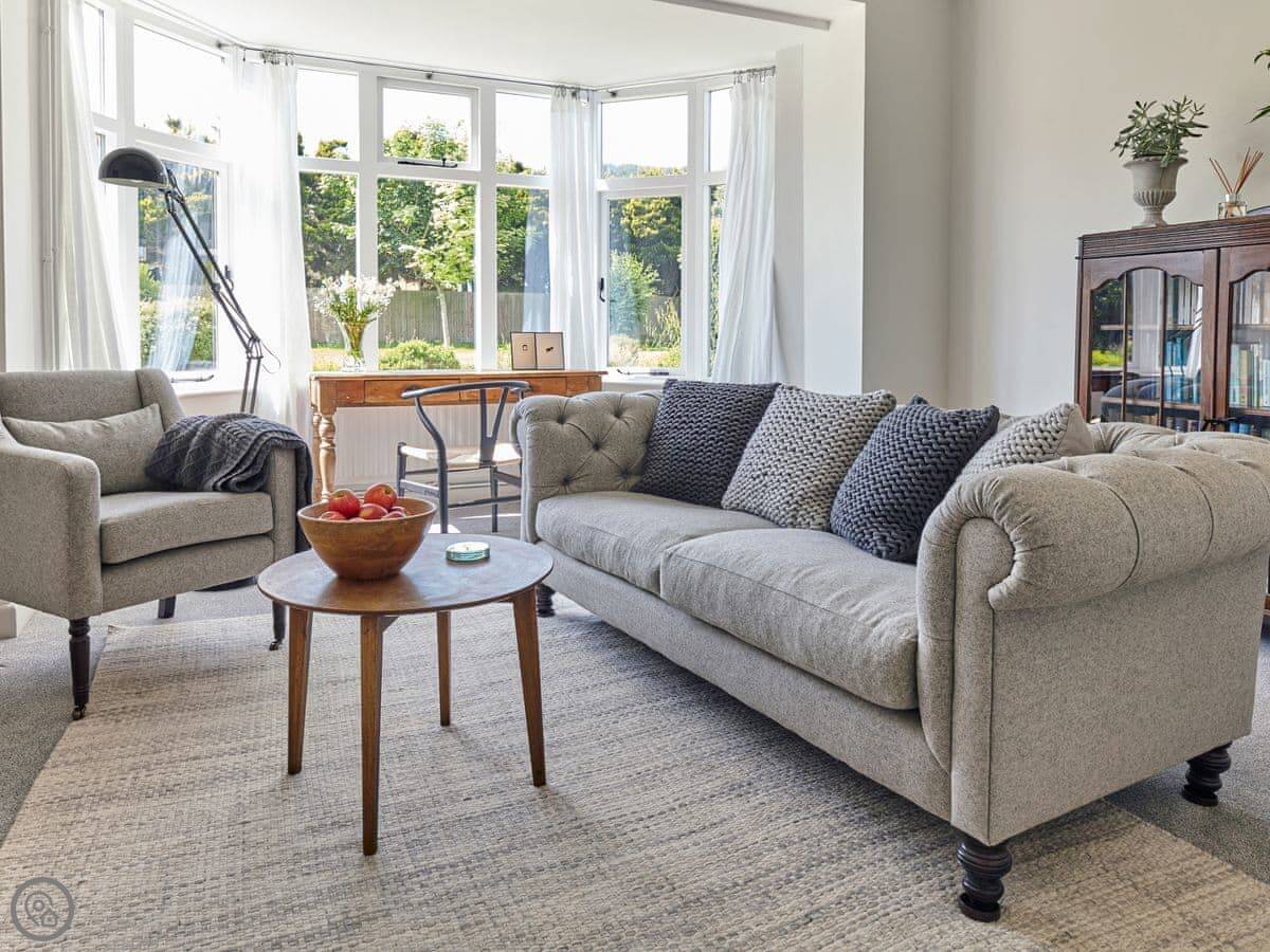 It sleeps six. There are three bedrooms and, unusually for round here, three bathrooms. It's a 5 Star place, which means it's been done up to a good standard. We've used White Company stuff for the furniture and linen. The main bathroom has grab rails and a shower seat.