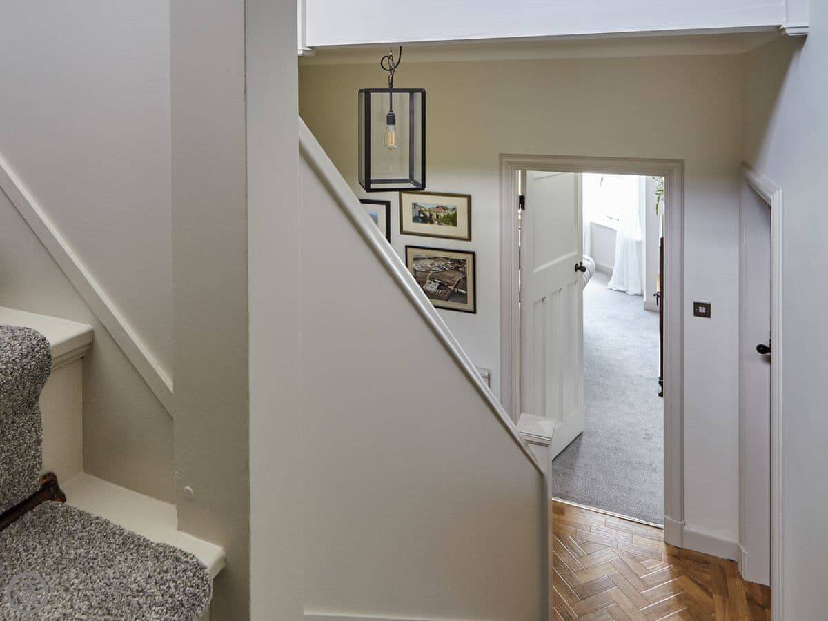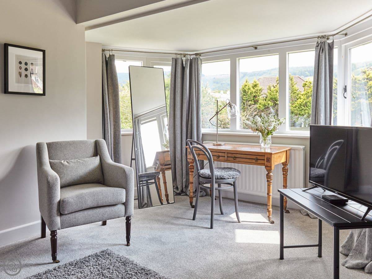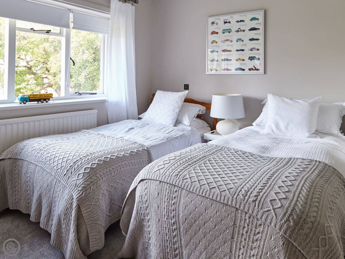 The kitchen is open plan with a table for six. The living room is bright and looks out over the back garden. All the bedrooms are upstairs. The master has a super king bed and an en-suite. There's another king room and a twin room with two full-sized single beds. The twin has a small basin in the corner.