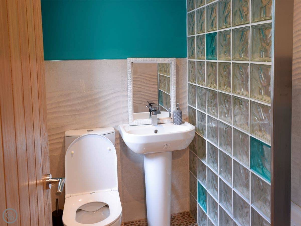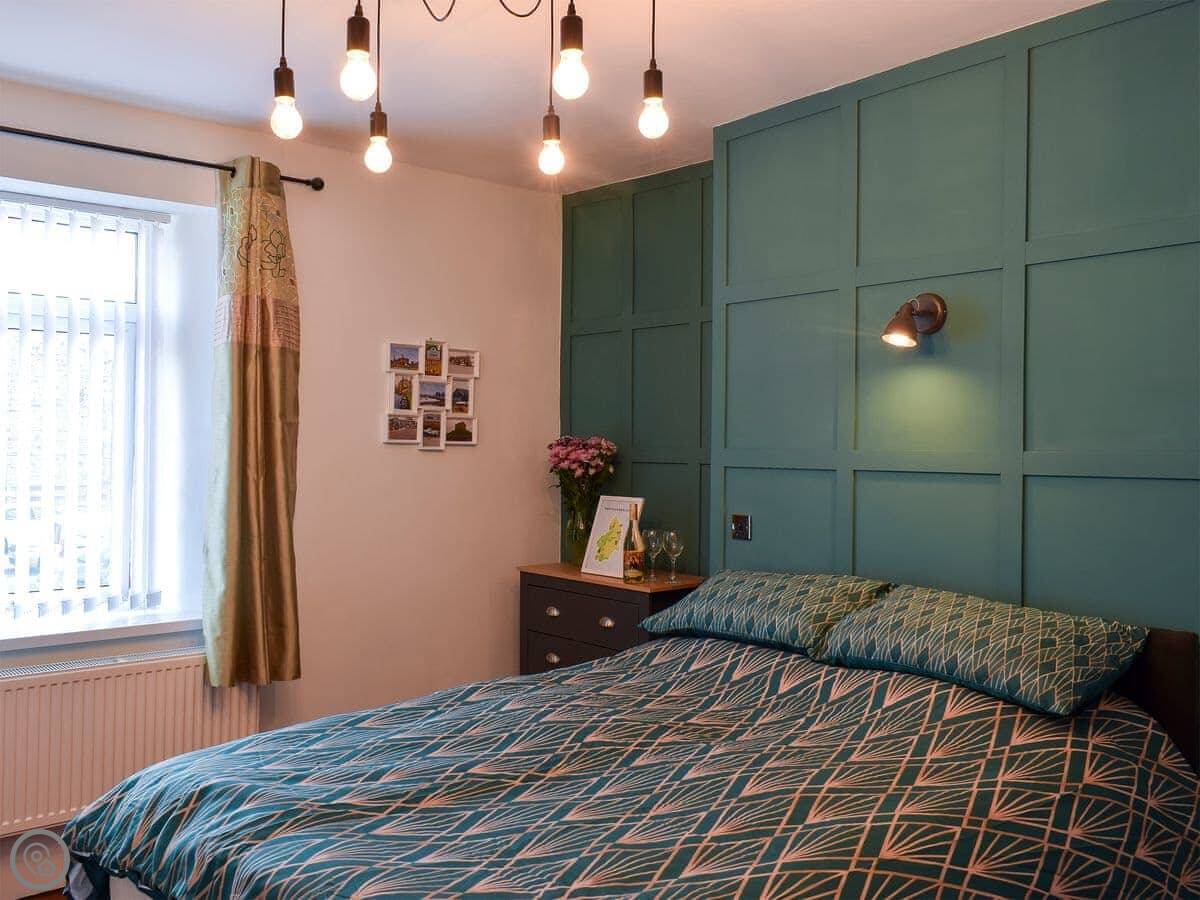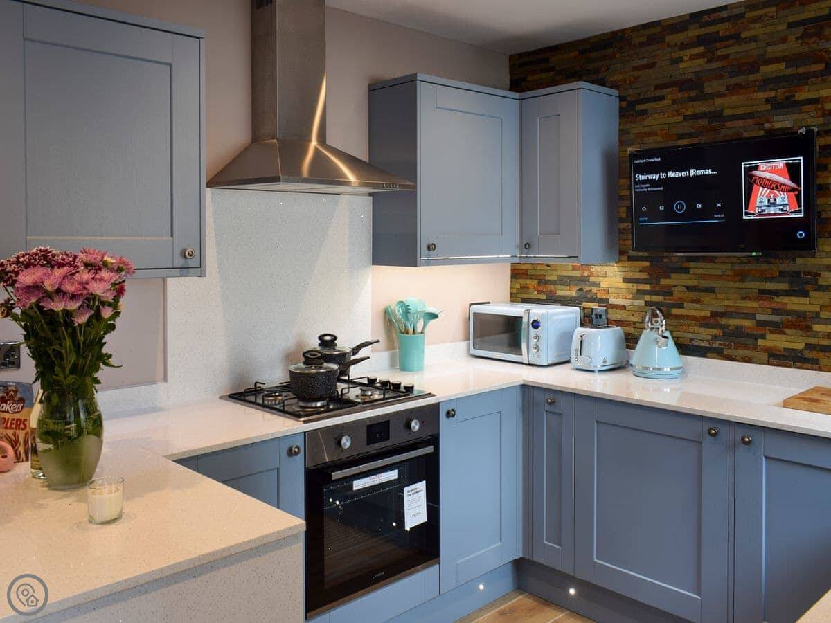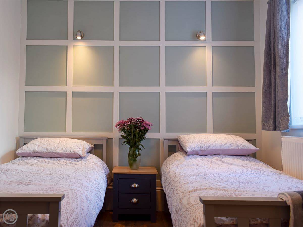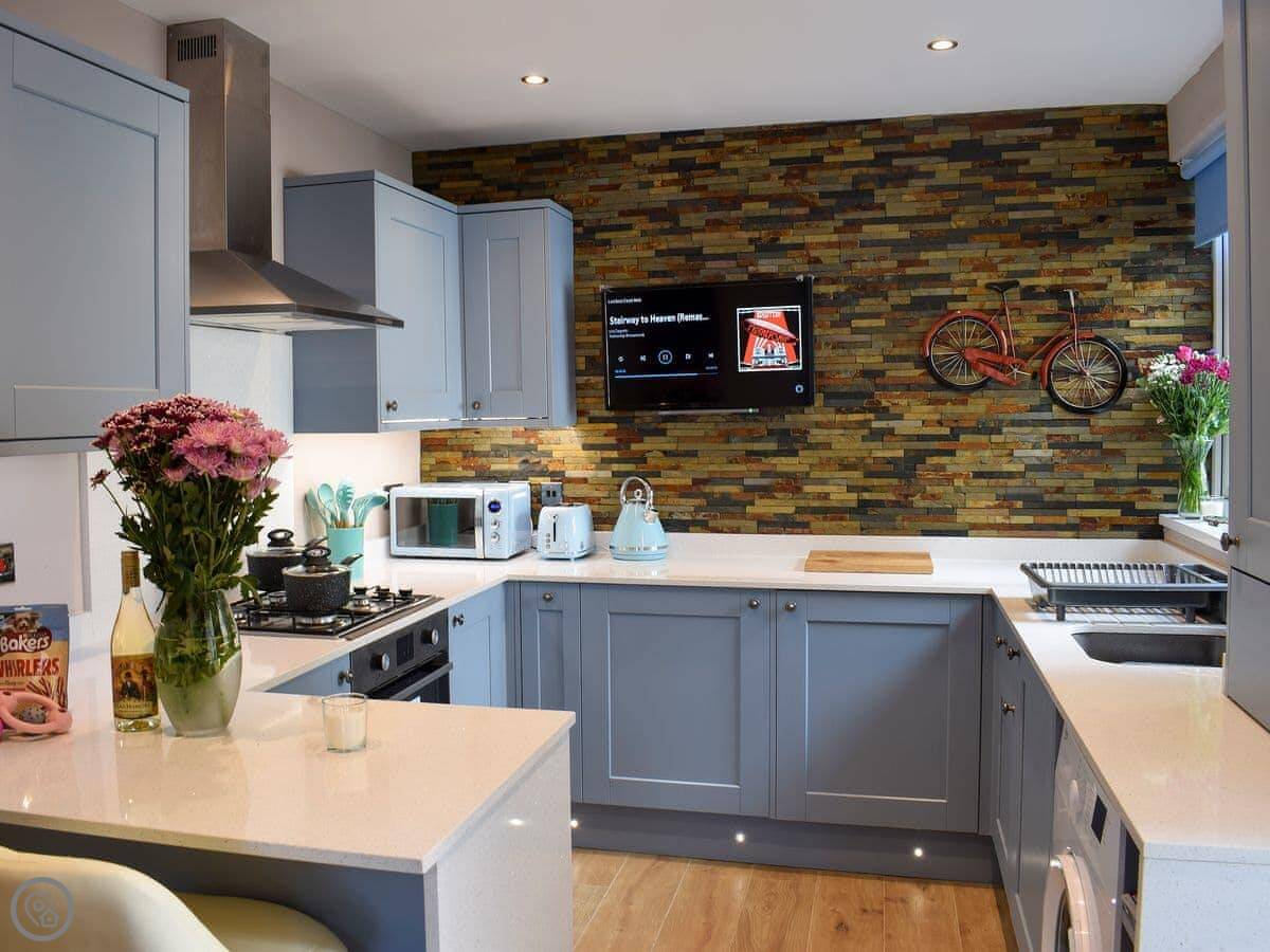 Inside, the living room has a wood burner in a big inglenook fireplace. The kitchen is a good size, with integrated appliances. It works well. Upstairs, there's a king size room and a twin room, both with a TV on the wall. The shower room is new.