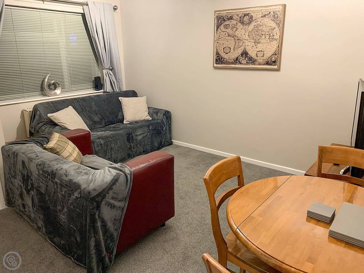 You walk straight into the main room. It's all open plan, so the kitchen and sitting area are together. The TV and wifi work fine. There's a washing machine too. Bedding and towels are included.