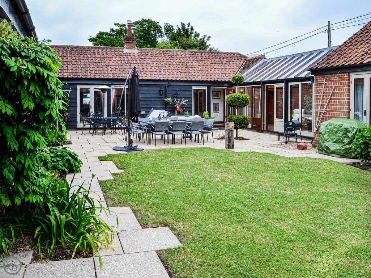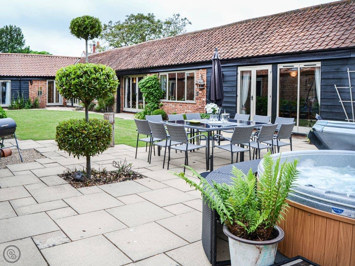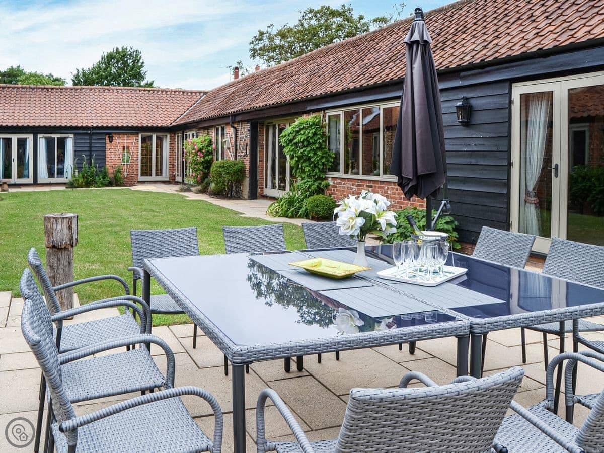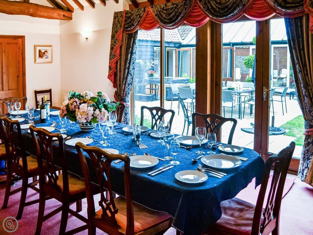 A wonderful home ideal for social gatherings and any special occasion. Boasting a hot tub and large wrap-around landscaped gardens with enclosed central courtyard garden, offer complete privacy. Perfectly positioned to explore all the delights of Norfolk, with its amazing coastline, wide sandy beaches and the famous Norfolk Broads National Park, a natural haven and habitat for wildlife. Sleeping 12 guests in 6 bedrooms, some with views of the courtyard, it is an ideal retreat for all generations, benefiting from no stairs. All doors open to the central courtyard garden. The kitchen has a breakfast table and extended lounge seating area, and the formal dining room is the perfect place to host any family celebration. There is a conservatory with great outlook across the garden. You can find games and seat cushions for the garden inside the utility room.