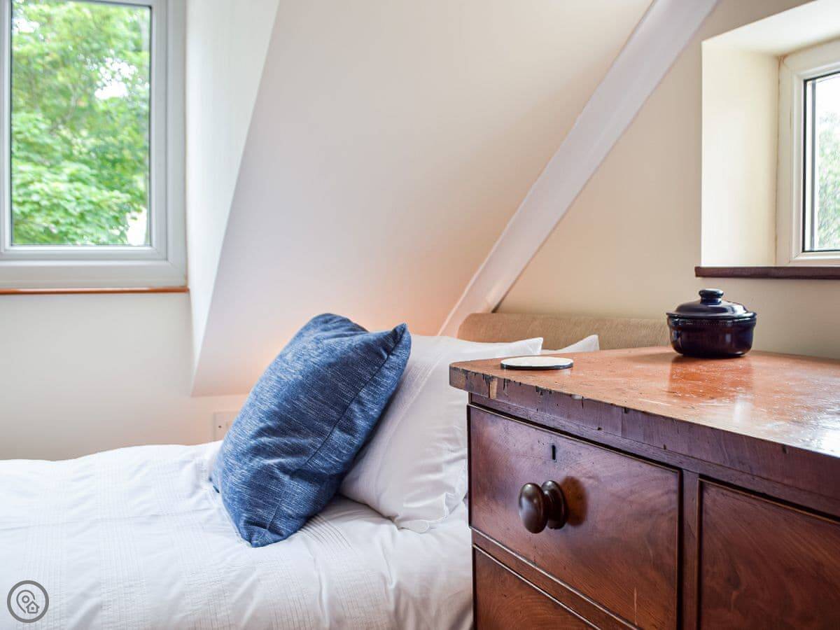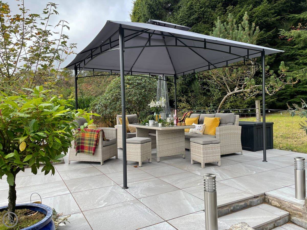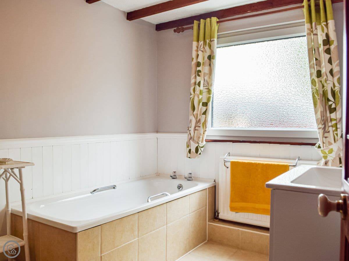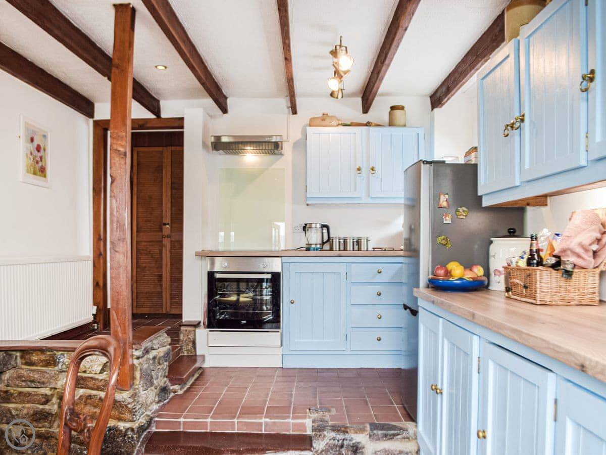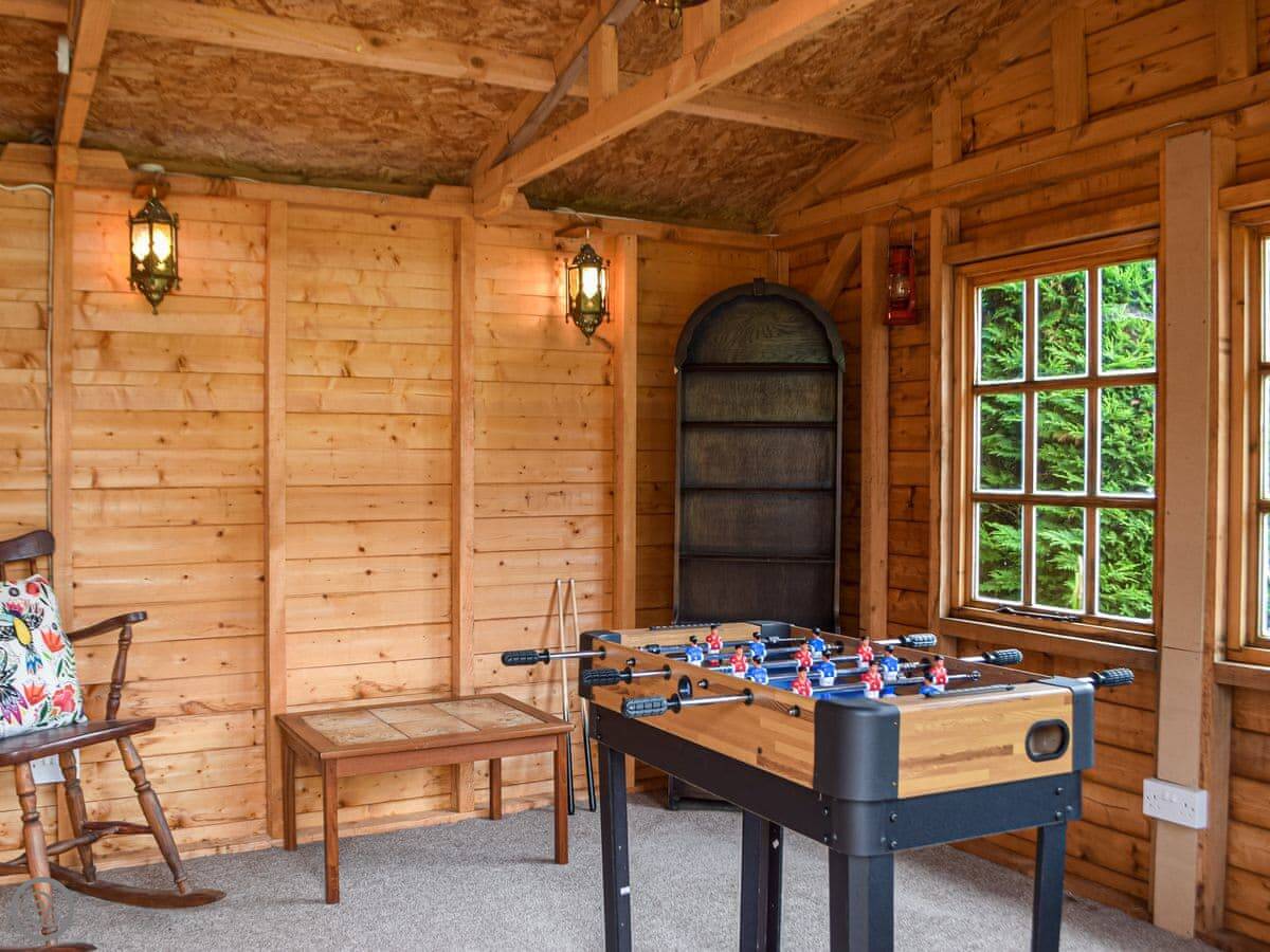 It sleeps seven in four bedrooms. There are two bathrooms, and the main one is shared between two of the bedrooms. It's got a 4 Star rating. There's a wood burner in the living room, which is handy in winter. The kitchen’s big and has all the usual things. The garden is enclosed and has a fishpond and a summer house with some games inside.