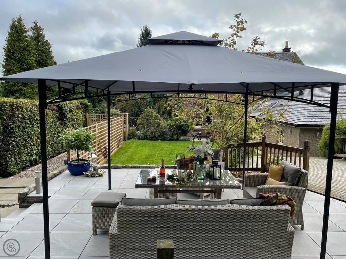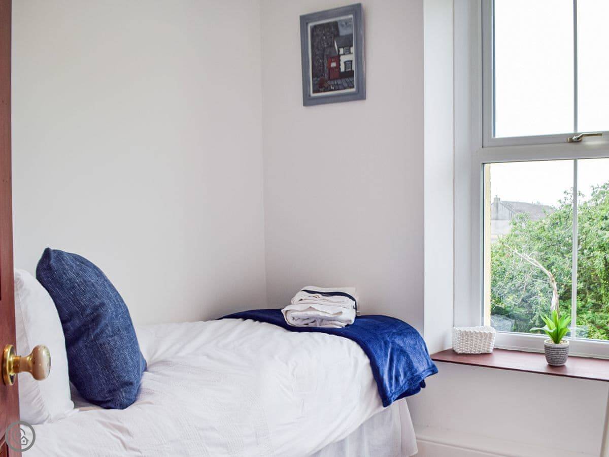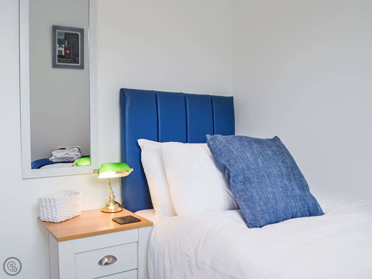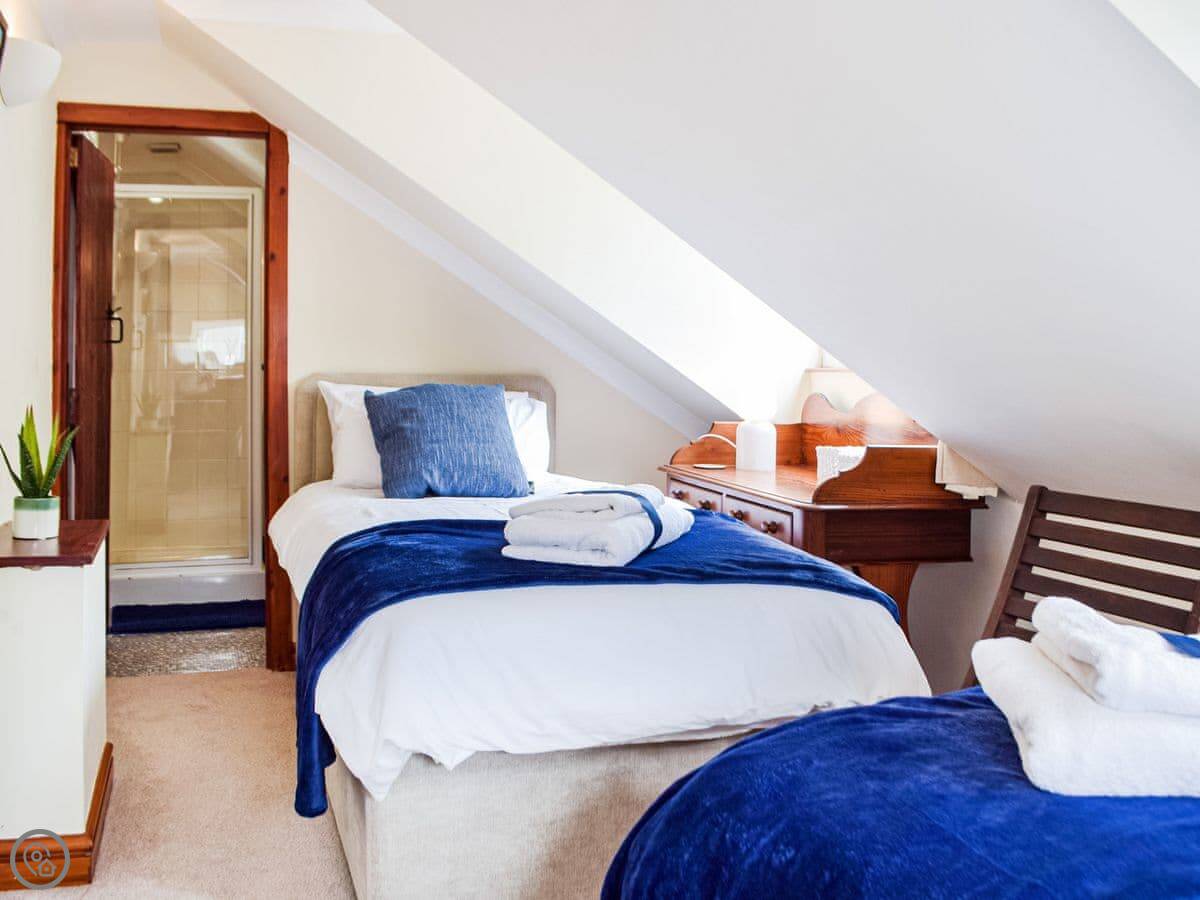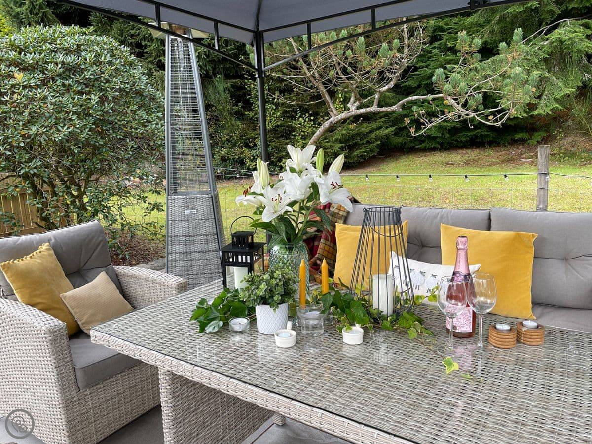 It sleeps seven in four bedrooms. There are two bathrooms, and the main one is shared between two of the bedrooms. It's got a 4 Star rating. There's a wood burner in the living room, which is handy in winter. The kitchen’s big and has all the usual things. The garden is enclosed and has a fishpond and a summer house with some games inside.