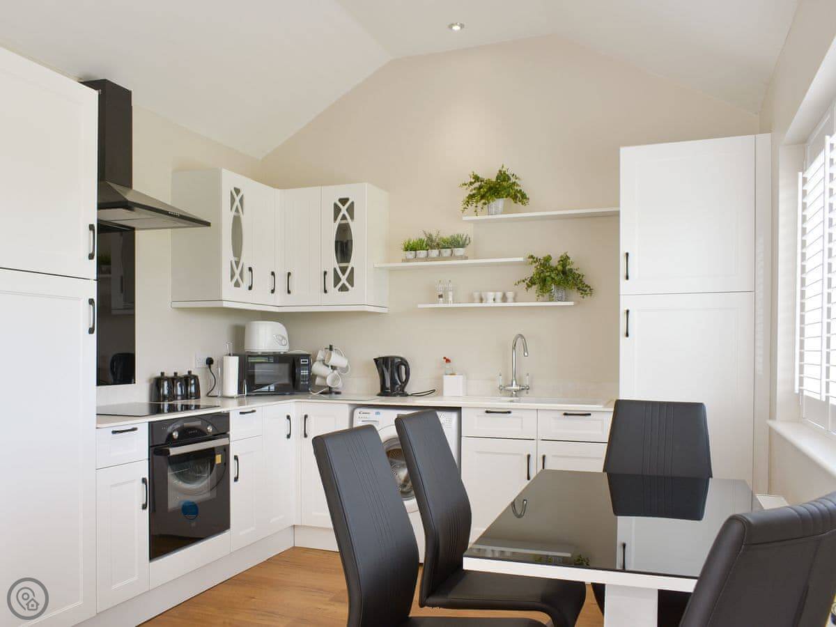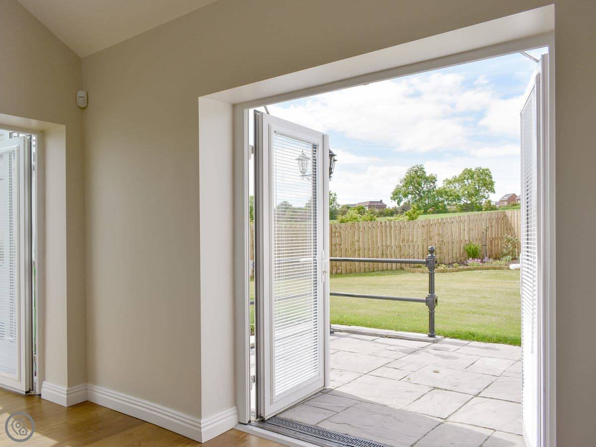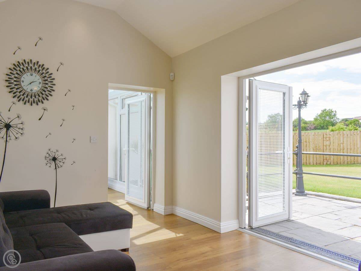 A beautiful light filled open plan living space with fitted kitchen, dining area and corner sofa which opens out as a double sofa bed if needed. Patio doors lead from here into the lovely private garden and sun filled patio set with table and chairs. To the front is a terraced area with seating looking out across the beautiful meadow. All adaptations are discreet, making this suitable for all uses. Guests will be able to use the electric full height, adjustable profiling beds and hoist, please bring your own sling or harness.