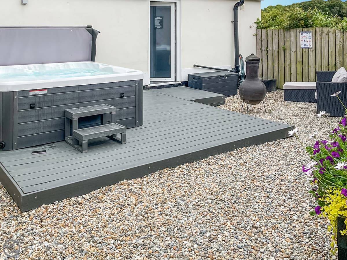 The living space is open plan. Patio doors open to your own private garden with a table and chairs. There's also a terrace at the front with seats that look out over the meadow.
