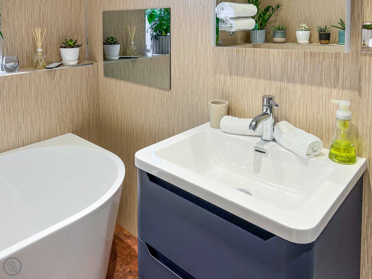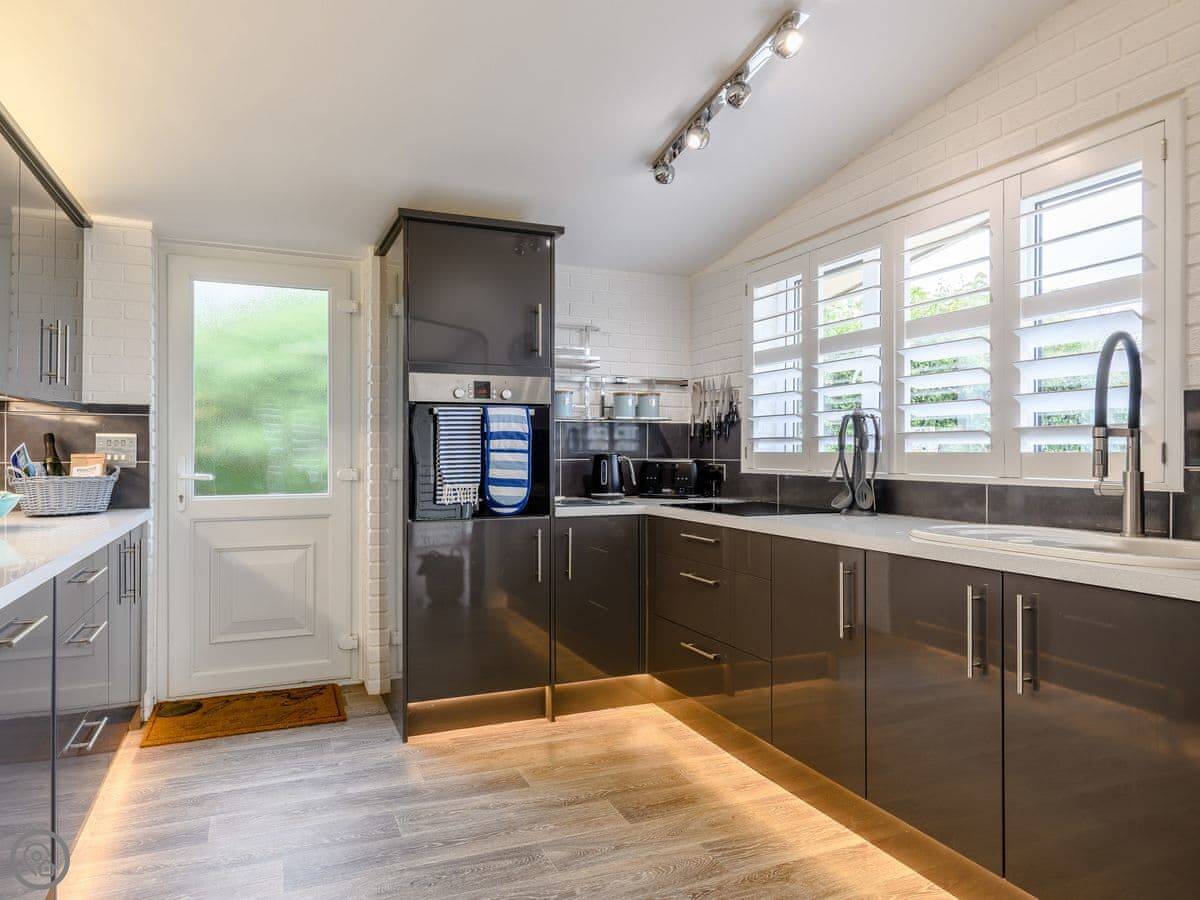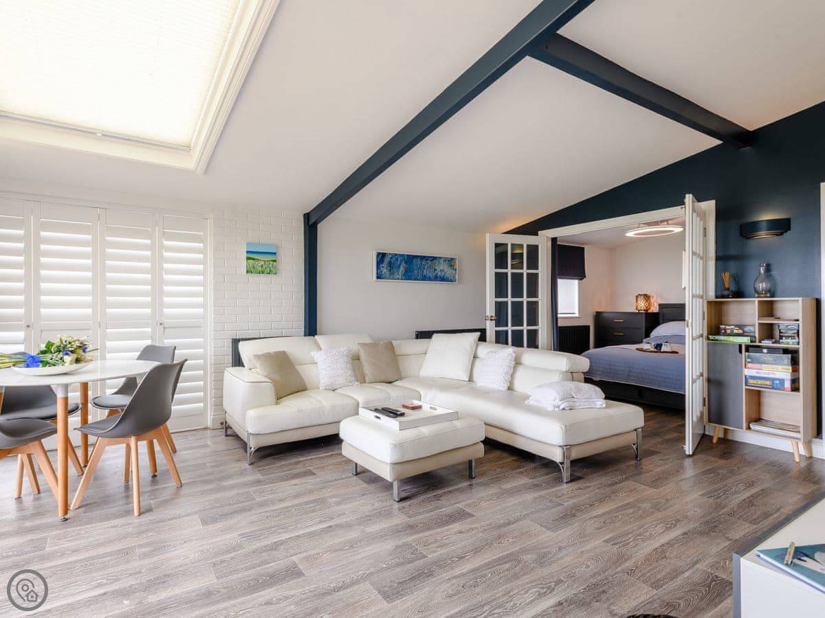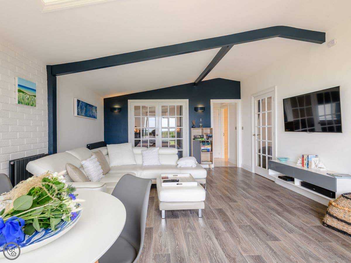 It sleeps four. Two bedrooms, both en-suite. It has a 5 Star rating, which means it's high spec. The big bifold doors at the back open right up onto the garden.