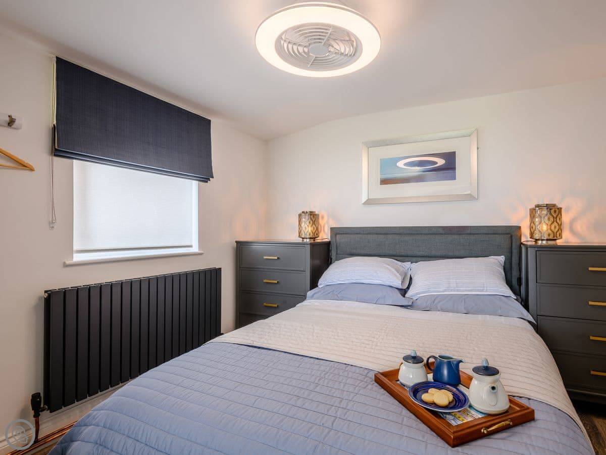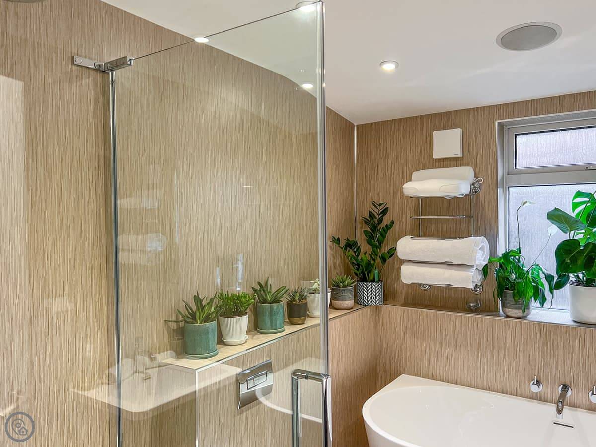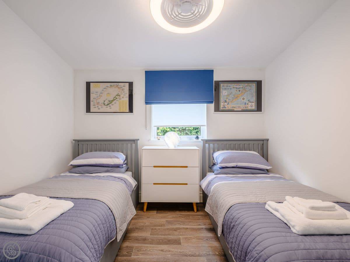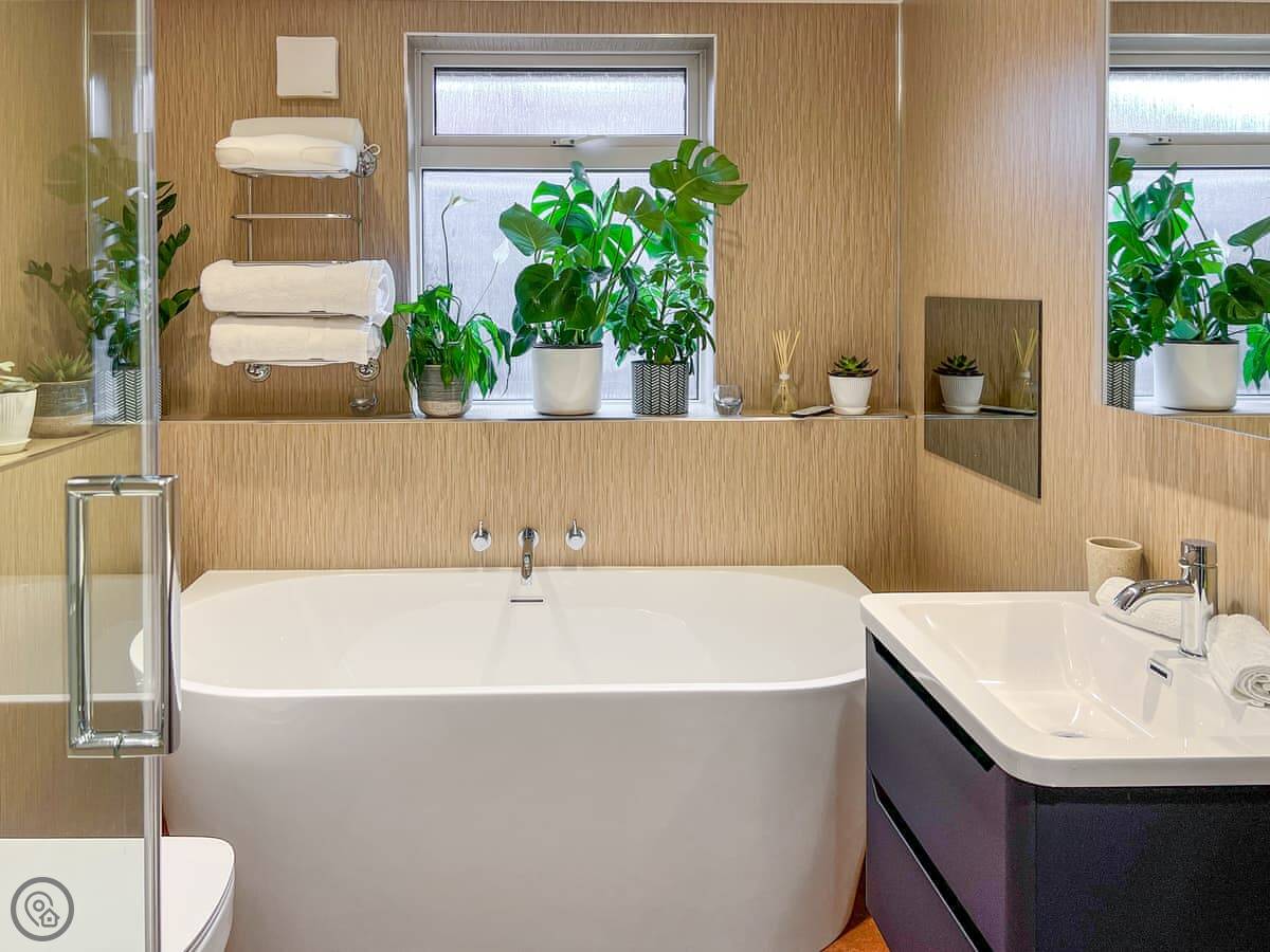 It sleeps four. Two bedrooms, both en-suite. It has a 5 Star rating, which means it's high spec. The big bifold doors at the back open right up onto the garden.