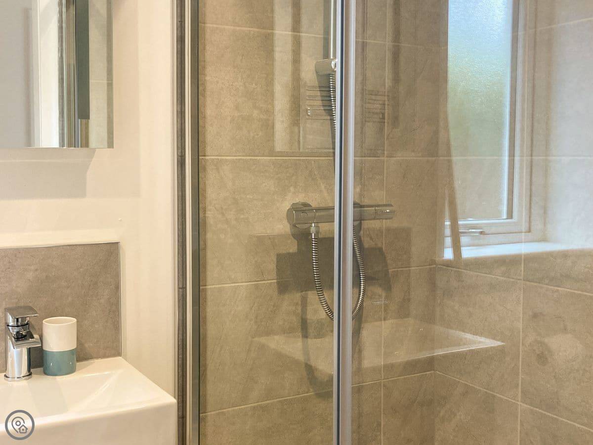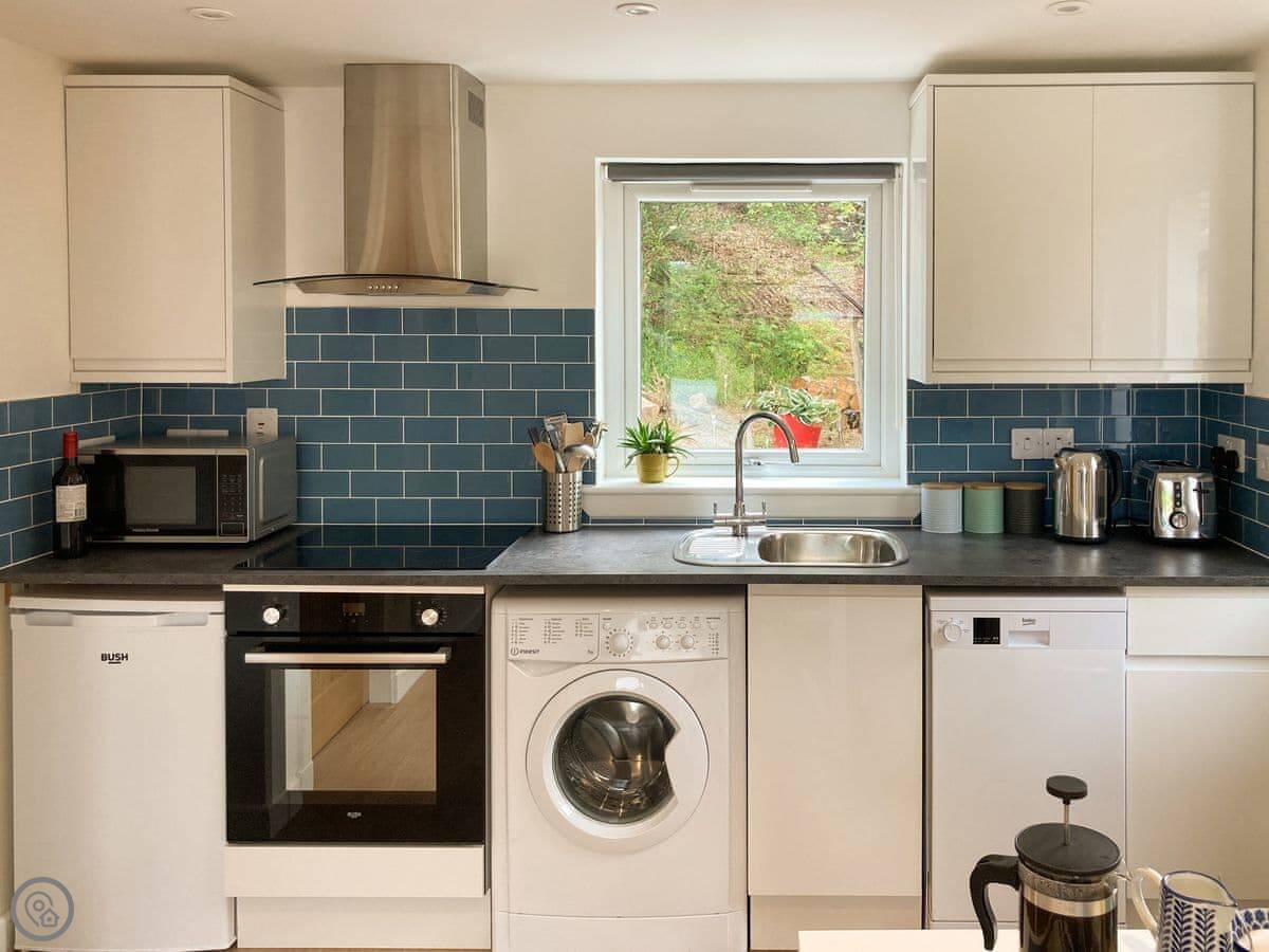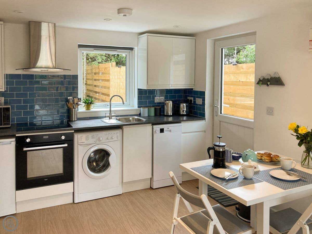 It’s all on the ground floor and it’s wheelchair friendly. There’s a walk-in shower. The layout is open plan, so the living, kitchen and dining areas are together. There’s a washing machine, a dishwasher, and WiFi. Bedding and towels are included. There’s parking right there and an electric vehicle charger.