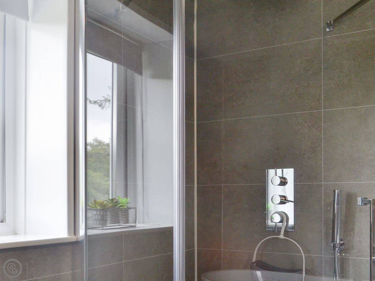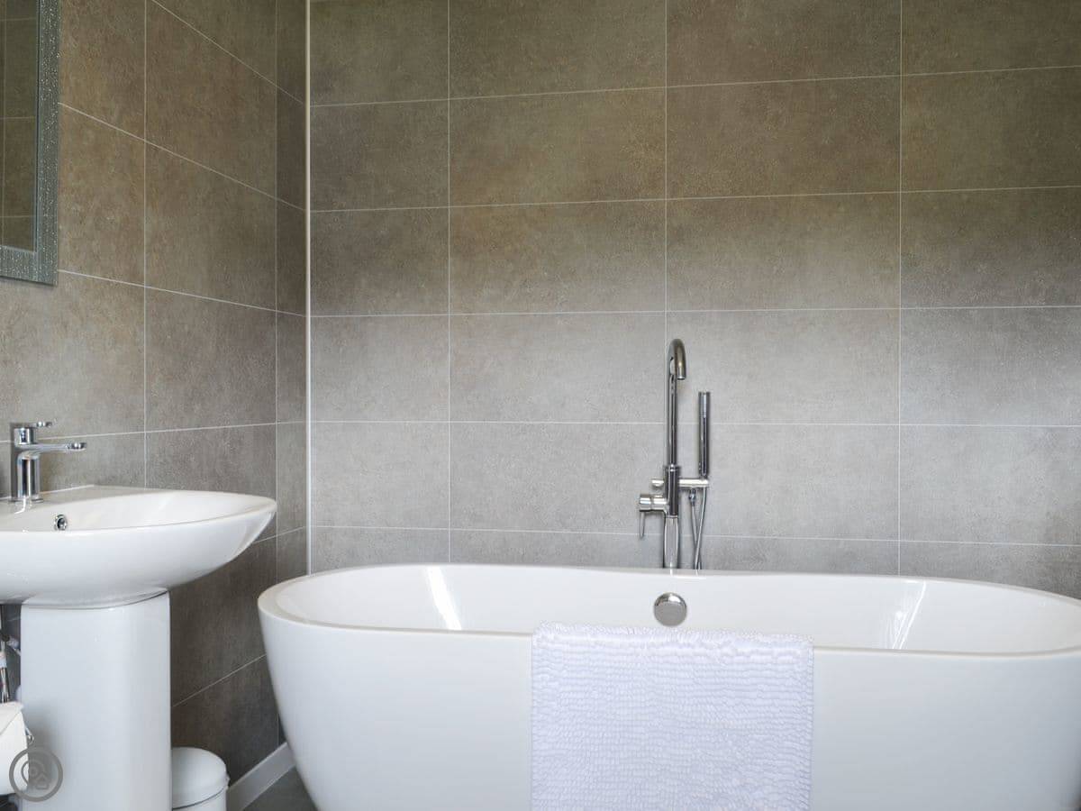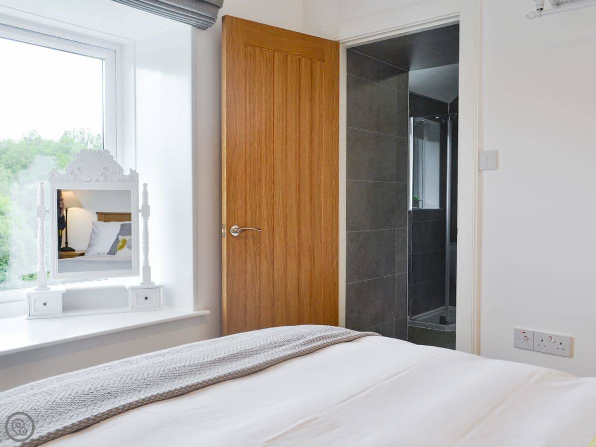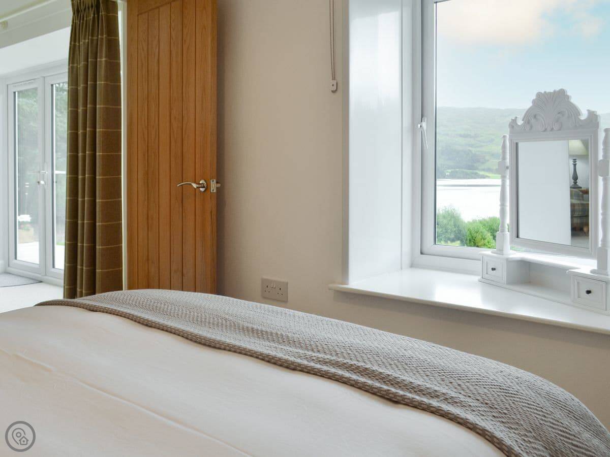 The living room is almost all glass at the front, looking straight down the loch. You can walk straight out onto a little terrace. The main bedroom has the same view. Its bathroom has a walk-in shower and one of those big double bathtubs. The second bedroom is a single.