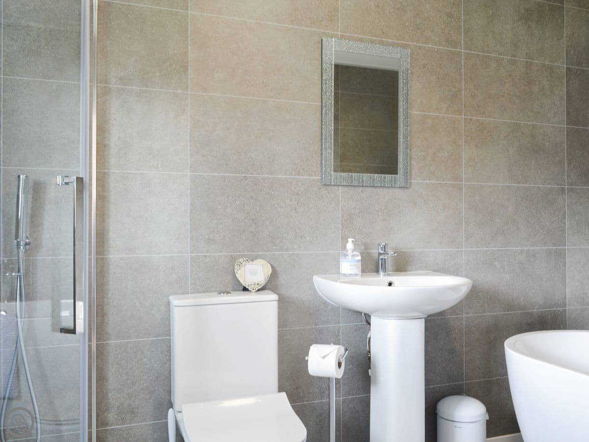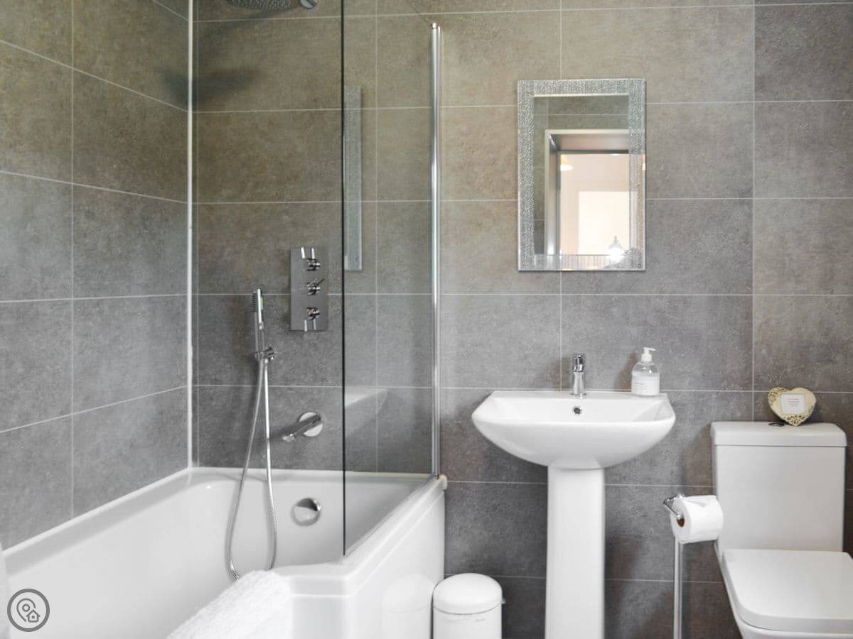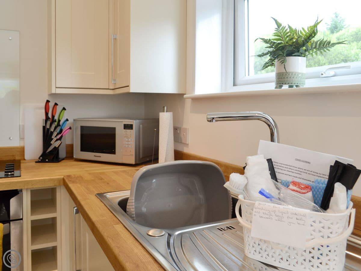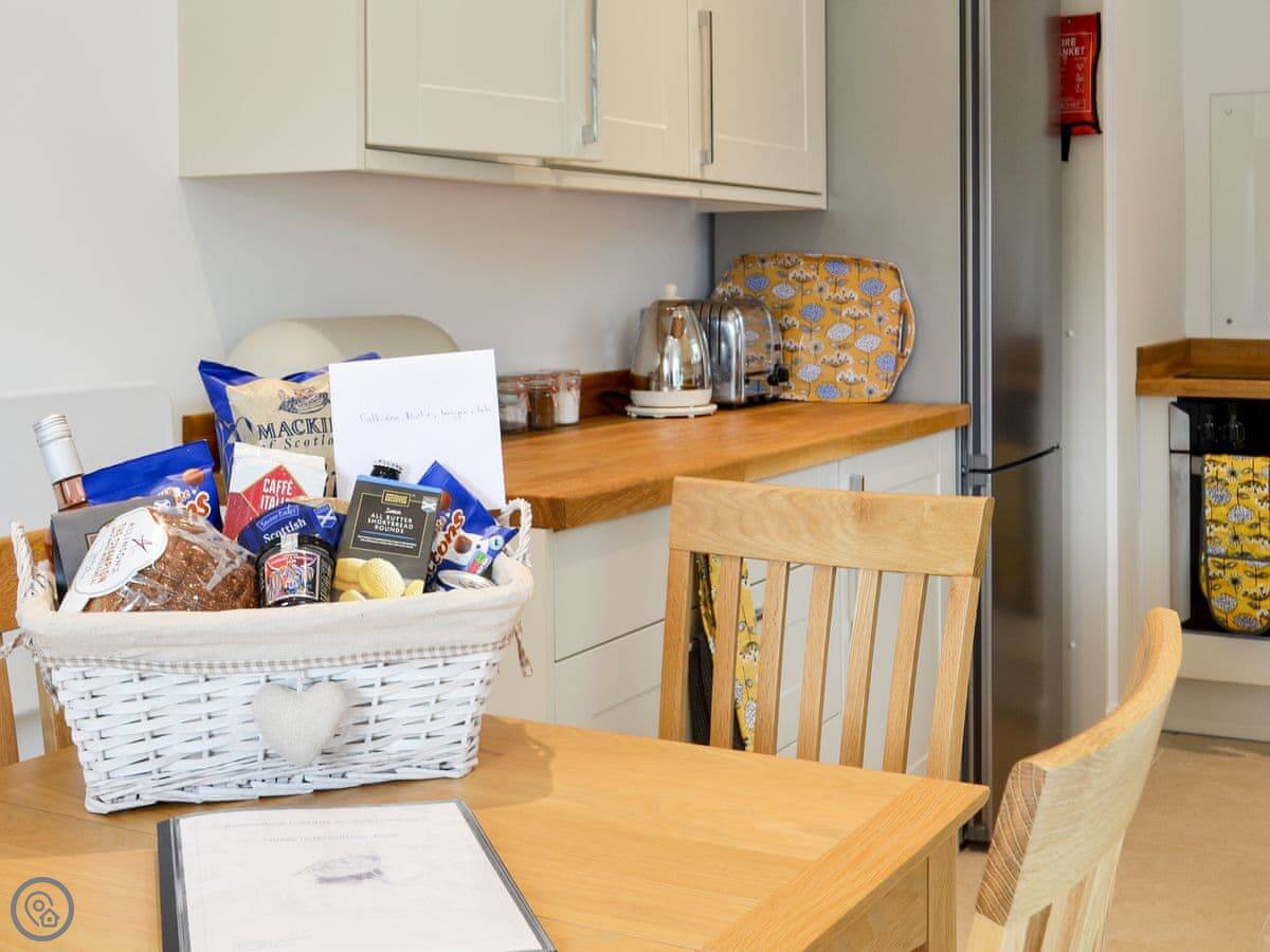 The living room is almost all glass at the front, looking straight down the loch. You can walk straight out onto a little terrace. The main bedroom has the same view. Its bathroom has a walk-in shower and one of those big double bathtubs. The second bedroom is a single.