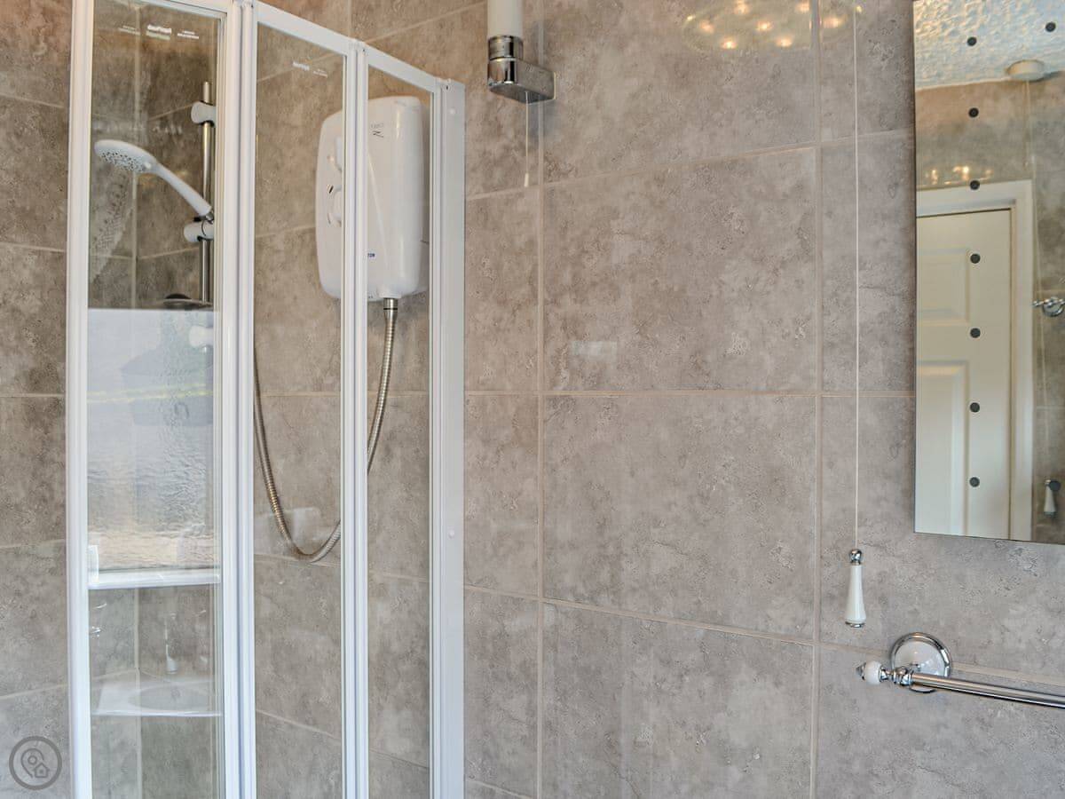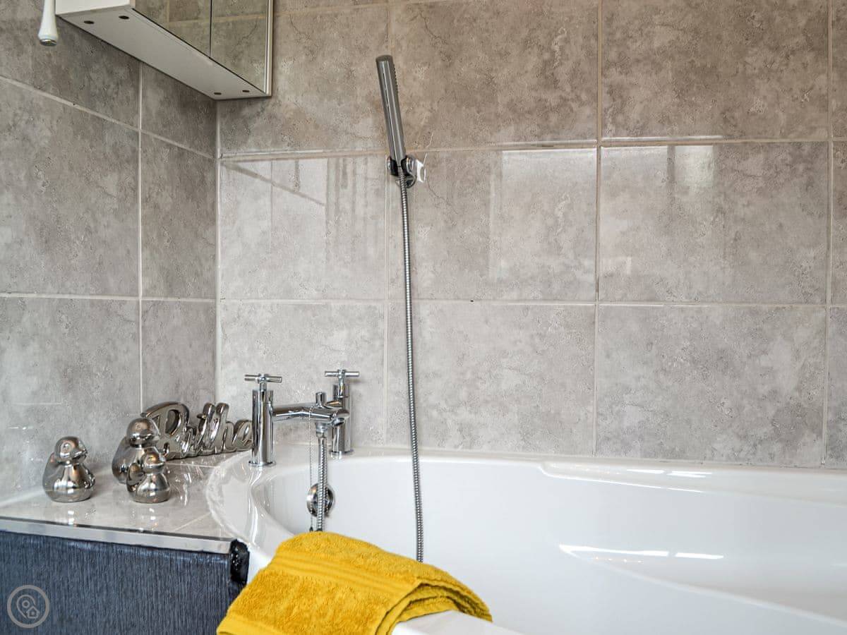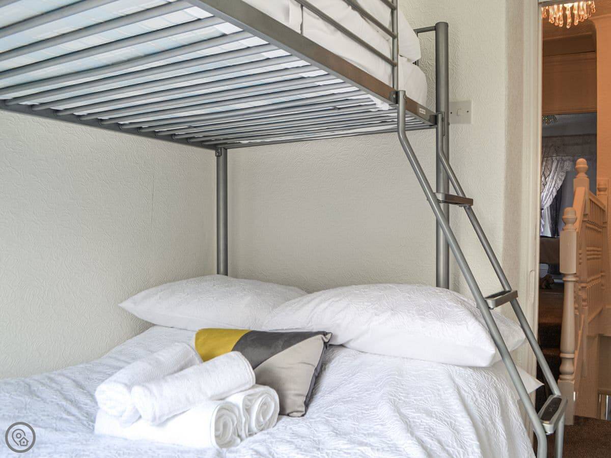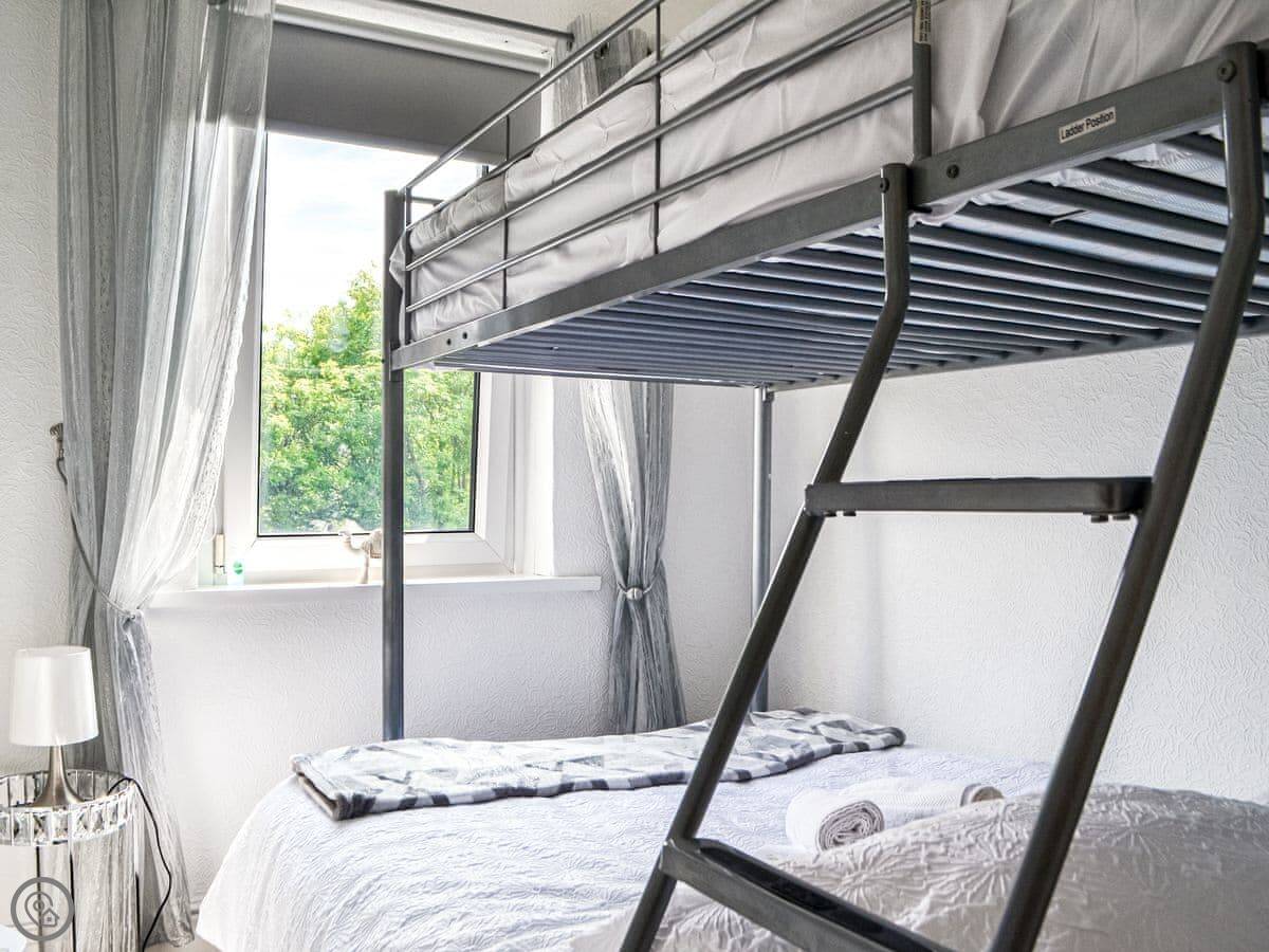 It sleeps seven people. There are three bedrooms. Two are doubles. The third has a bunk bed, a double on the bottom and a single on top. So it's good for a family. There's one bathroom with a bath and a shower over it.