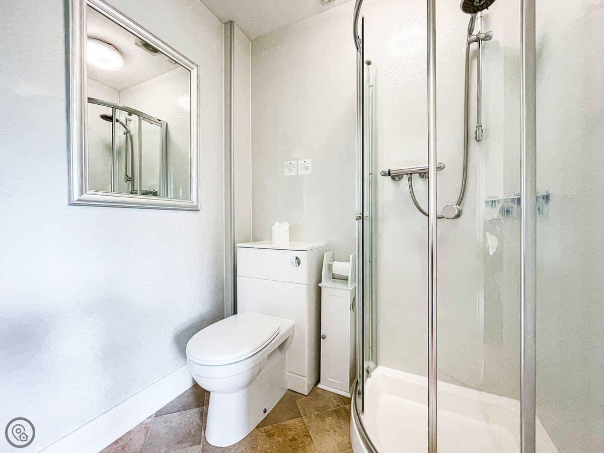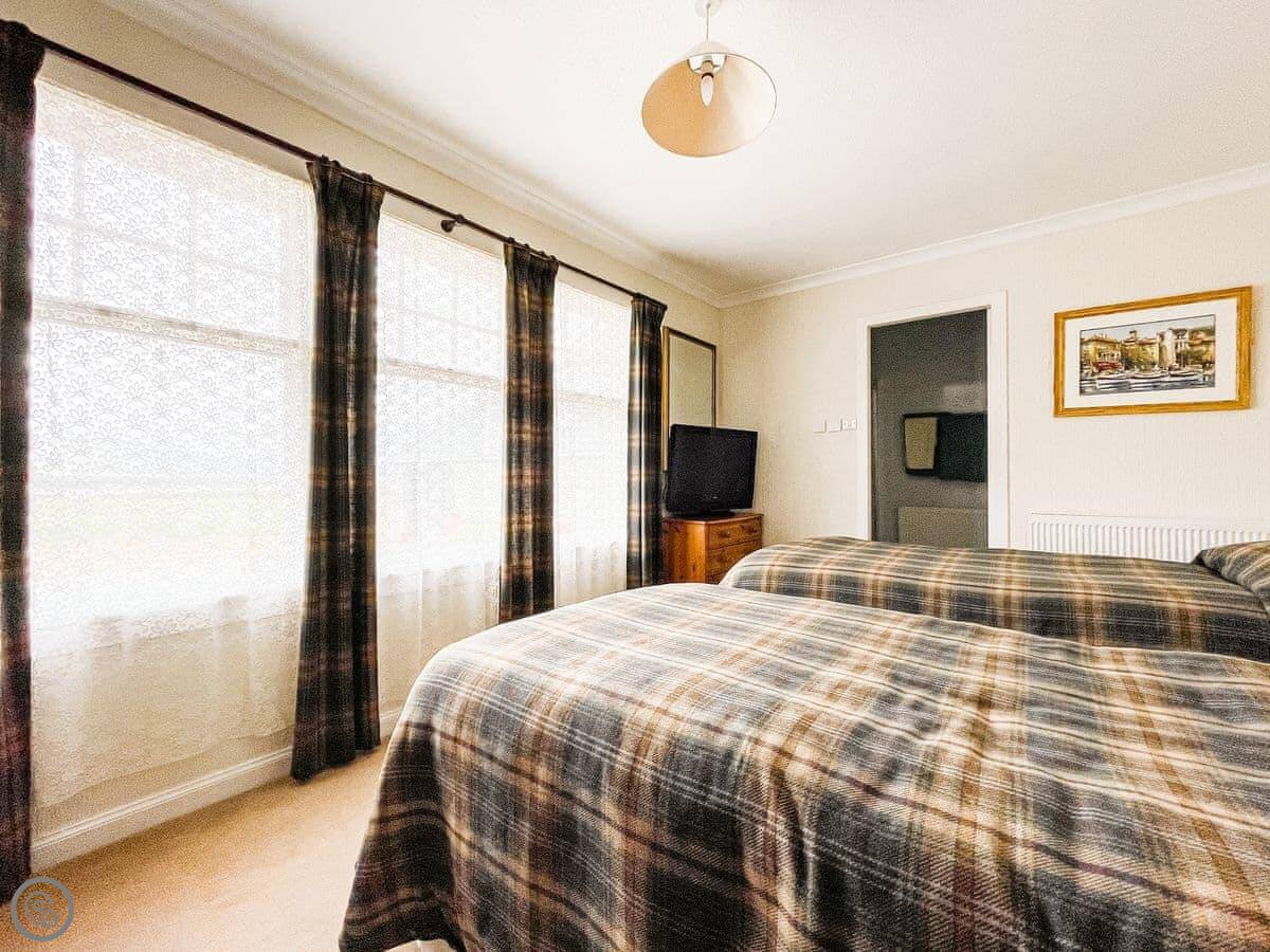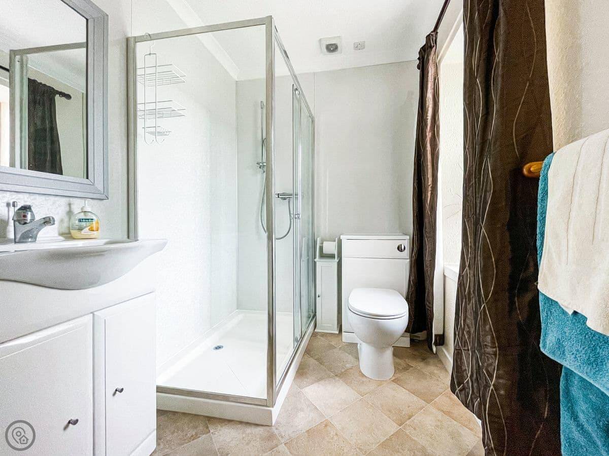 It sleeps eight. Four bedrooms, all with their own shower room. It's got a 3 Star rating. It's clean and comfortable, but the decor is a bit old-fashioned. The layout is upside down, so the living room and kitchen are upstairs to get the view.