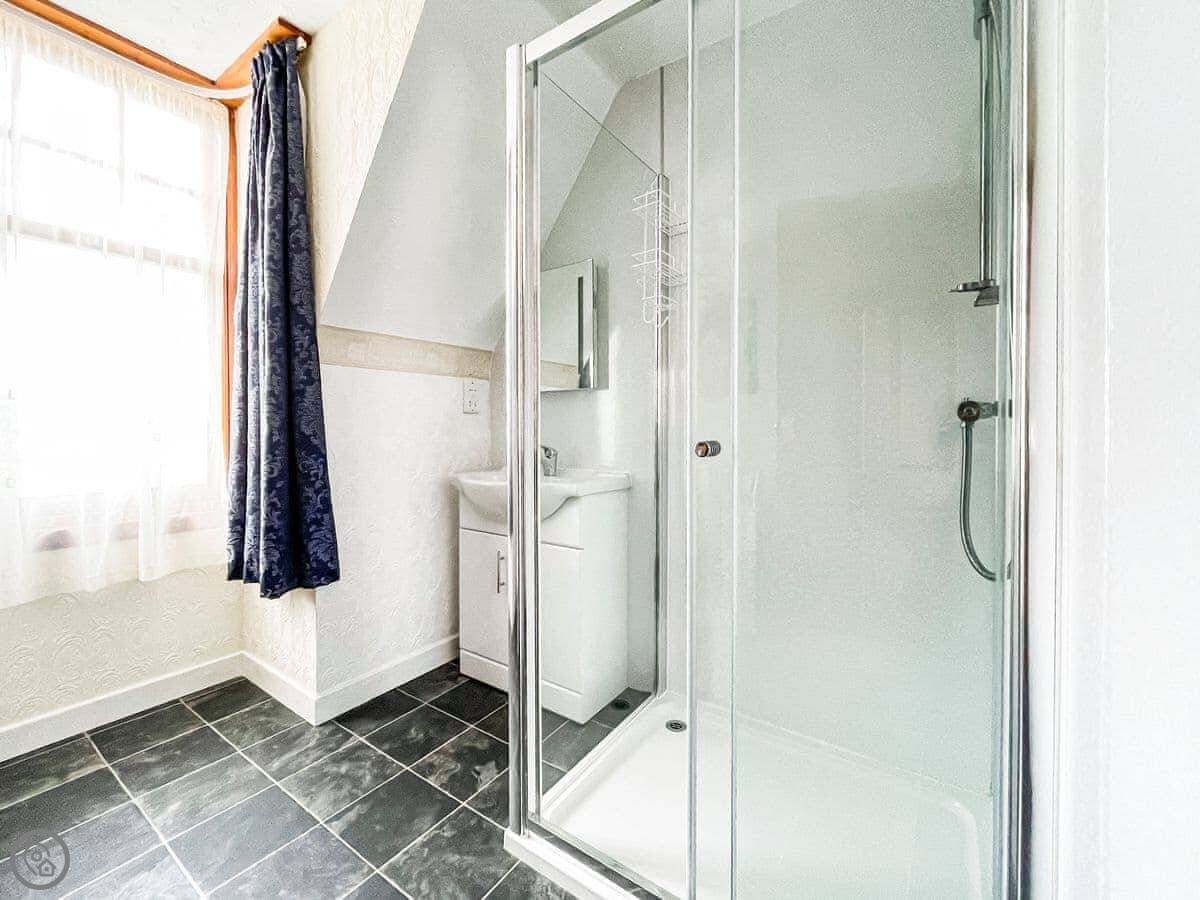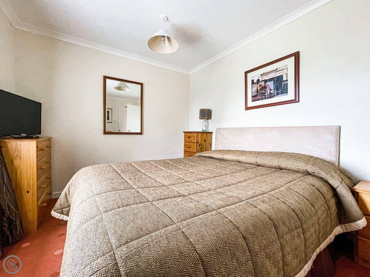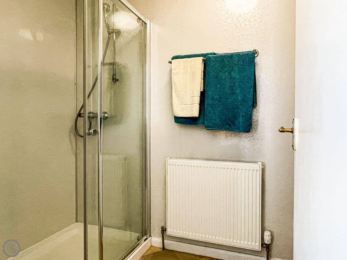 It sleeps eight. Four bedrooms, all with their own shower room. It's got a 3 Star rating. It's clean and comfortable, but the decor is a bit old-fashioned. The layout is upside down, so the living room and kitchen are upstairs to get the view.