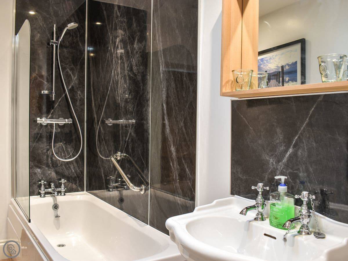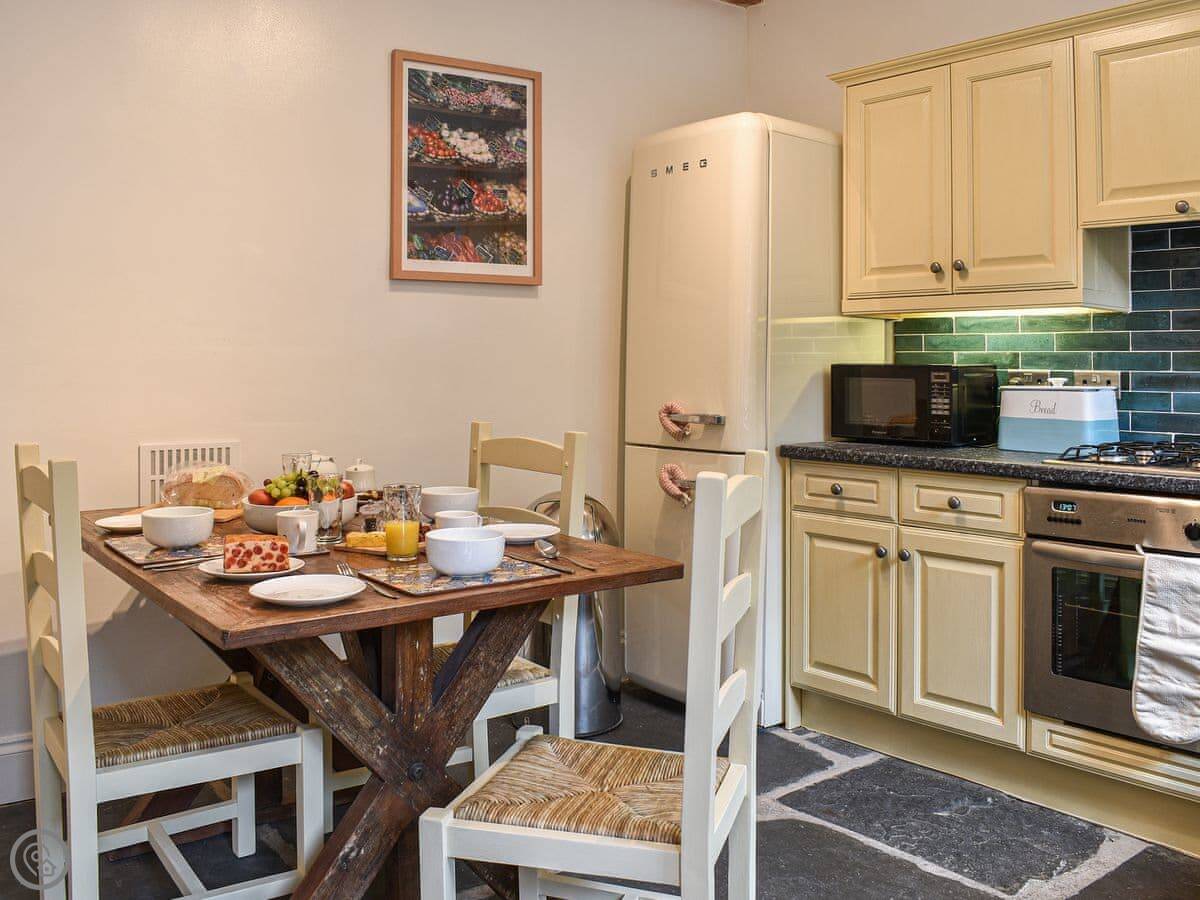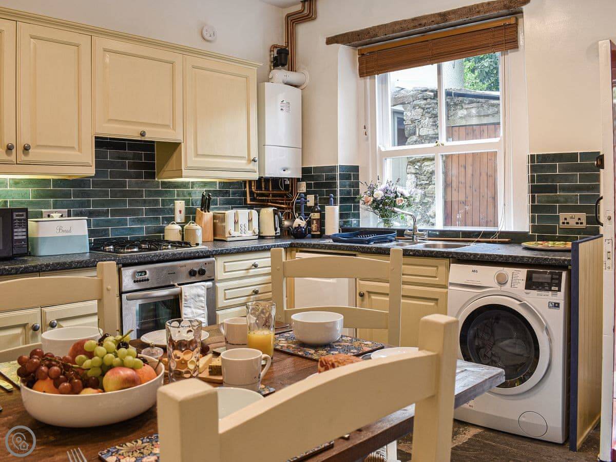 Inside, there's a kitchen and dining area. There's a wood burner in the living room. It's got a TV, WiFi, a washing machine, and a dishwasher. All bedding and towels are included. You can bring one dog.