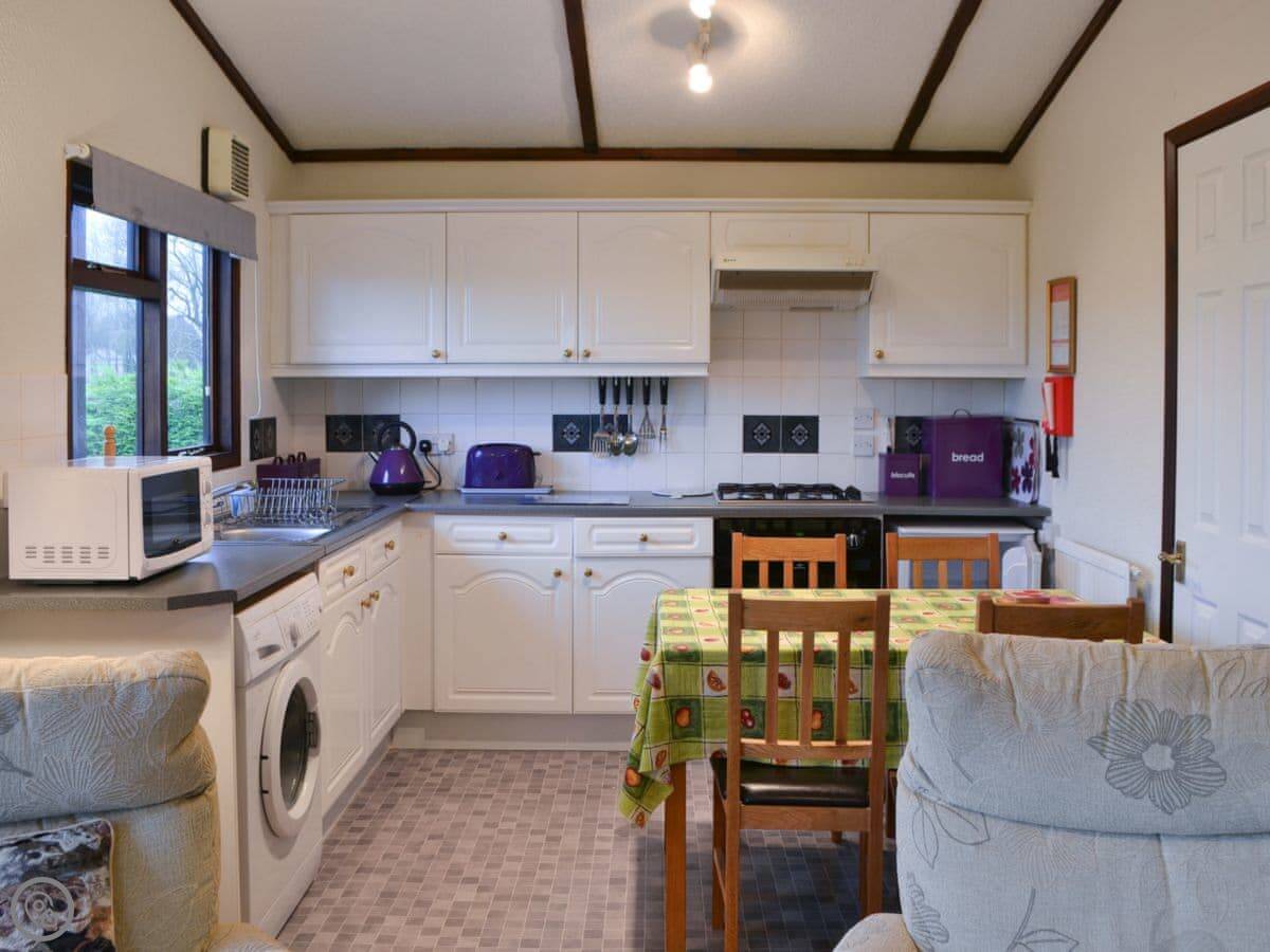 It's a compact bungalow, open plan inside, so the living area, kitchen and dining space are all one room. It sleeps two people. There are two bedrooms but they're both small doubles, so it's really just for a couple. One bathroom with a shower.