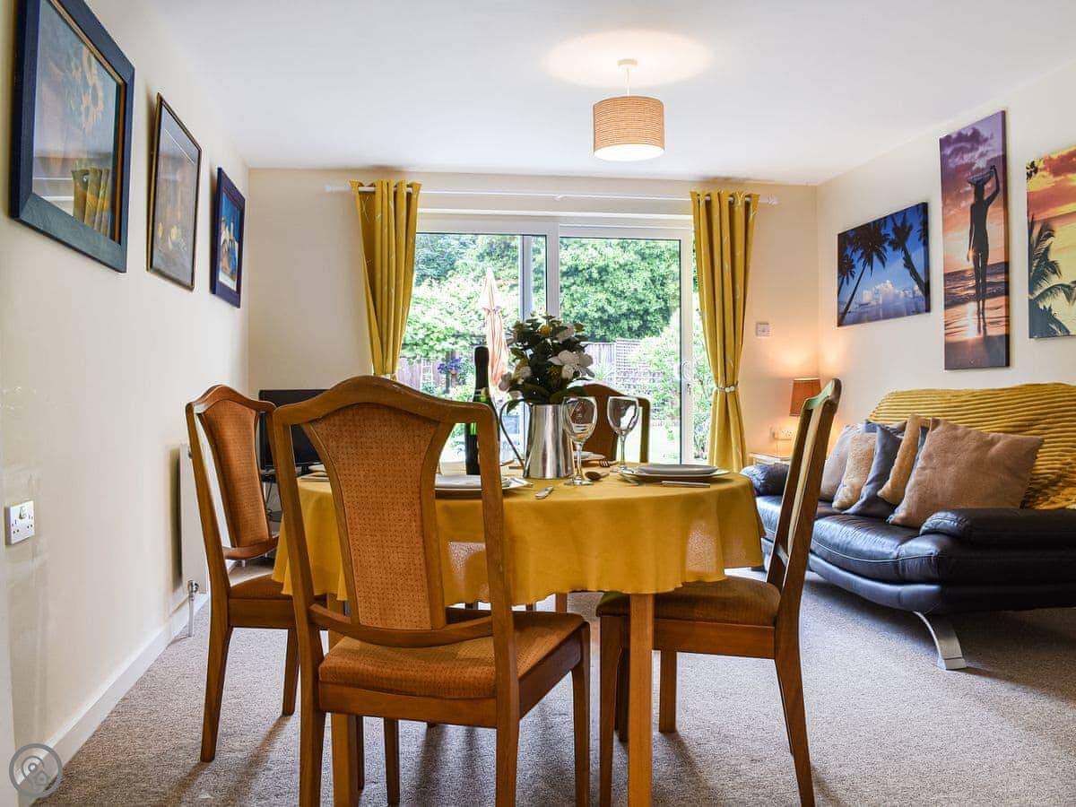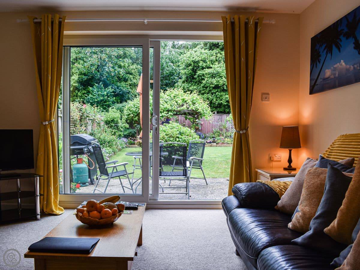 The main room is open plan: kitchen, dining table, living area. Doors go out to the garden. The garden is mostly private, but it's open to ours on one side with a fence in between. You can sit out there.