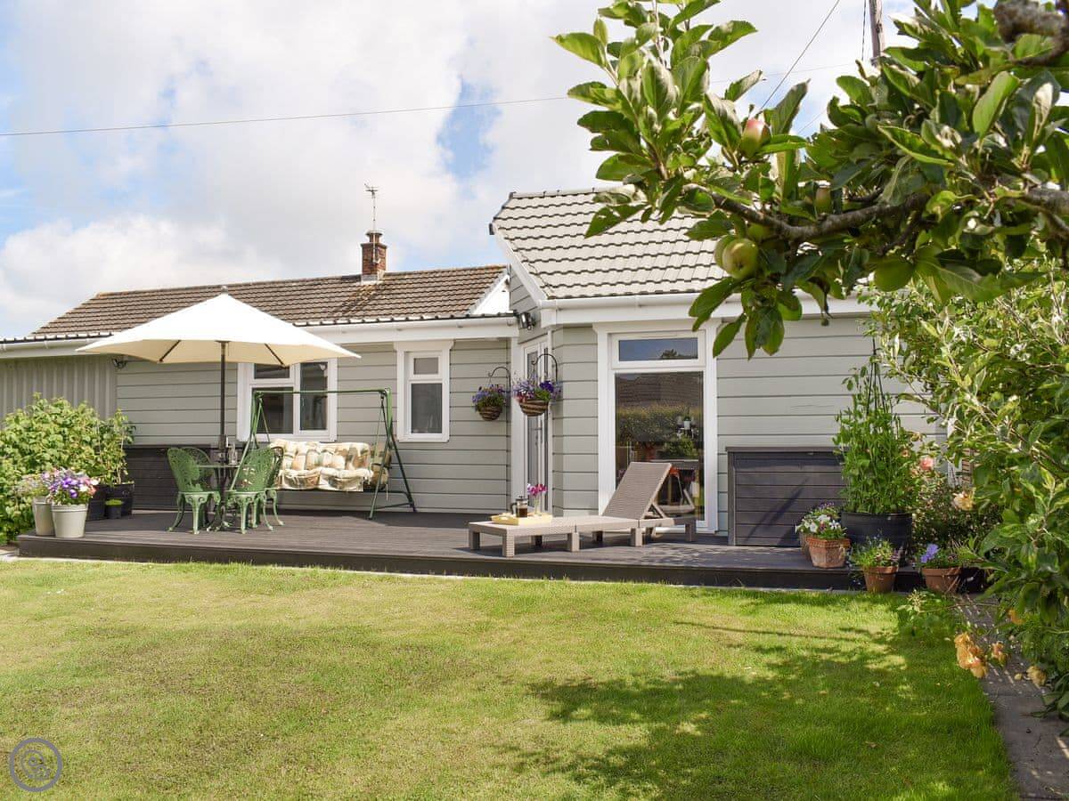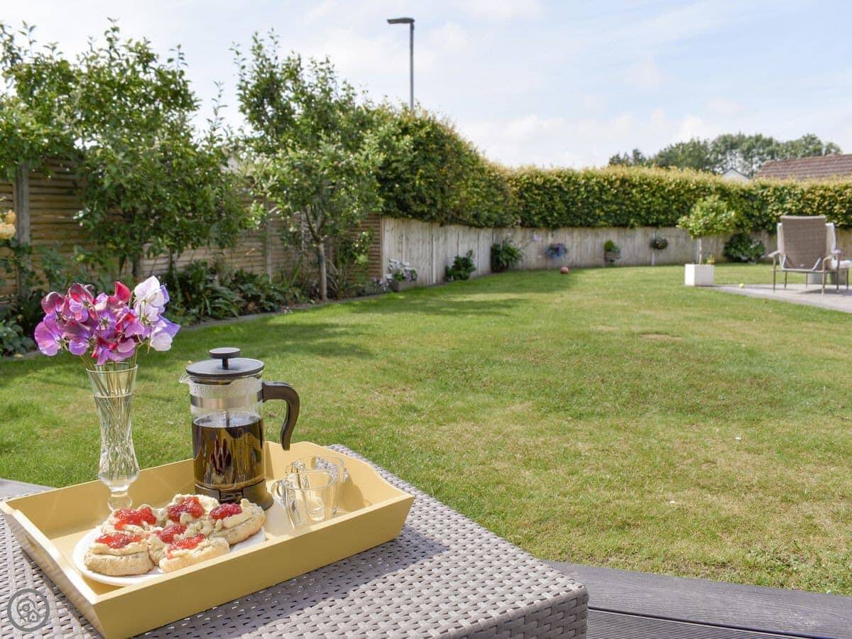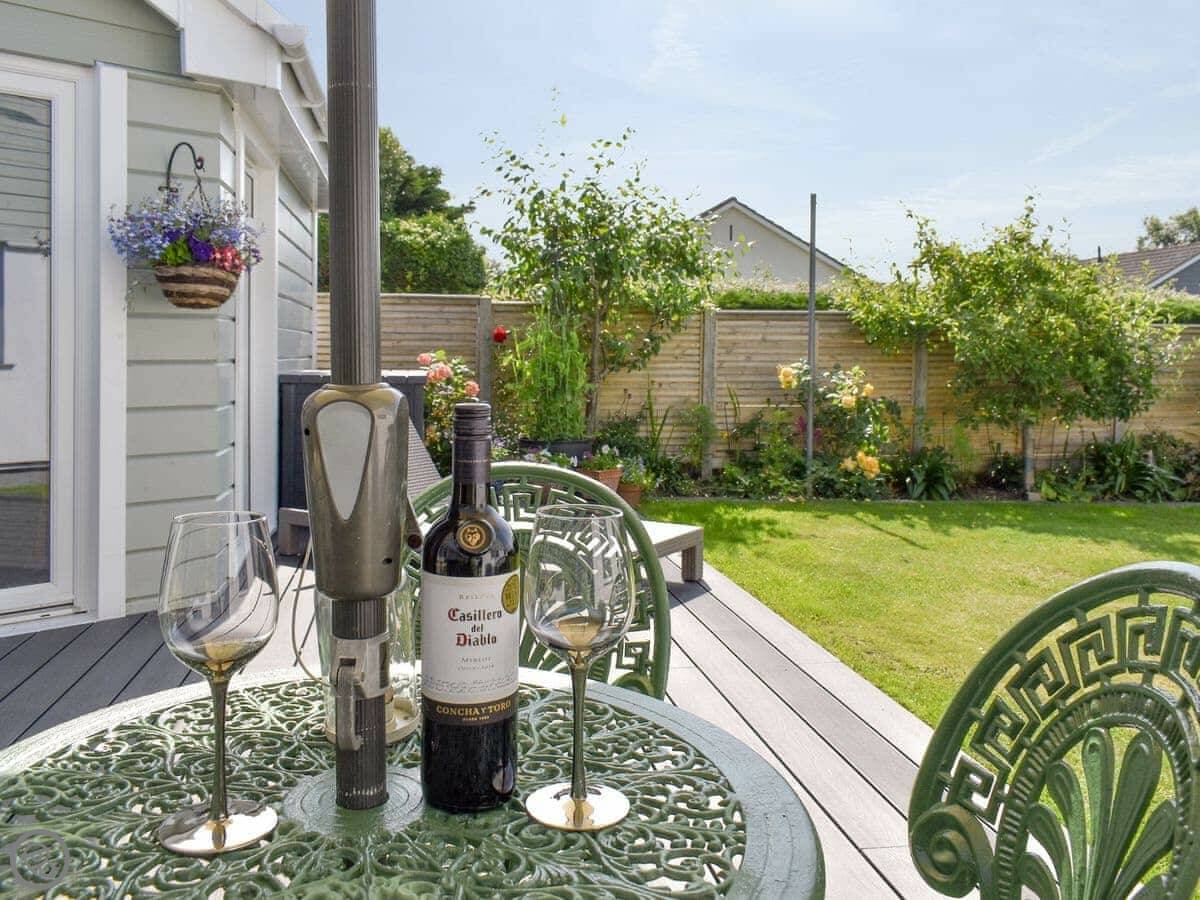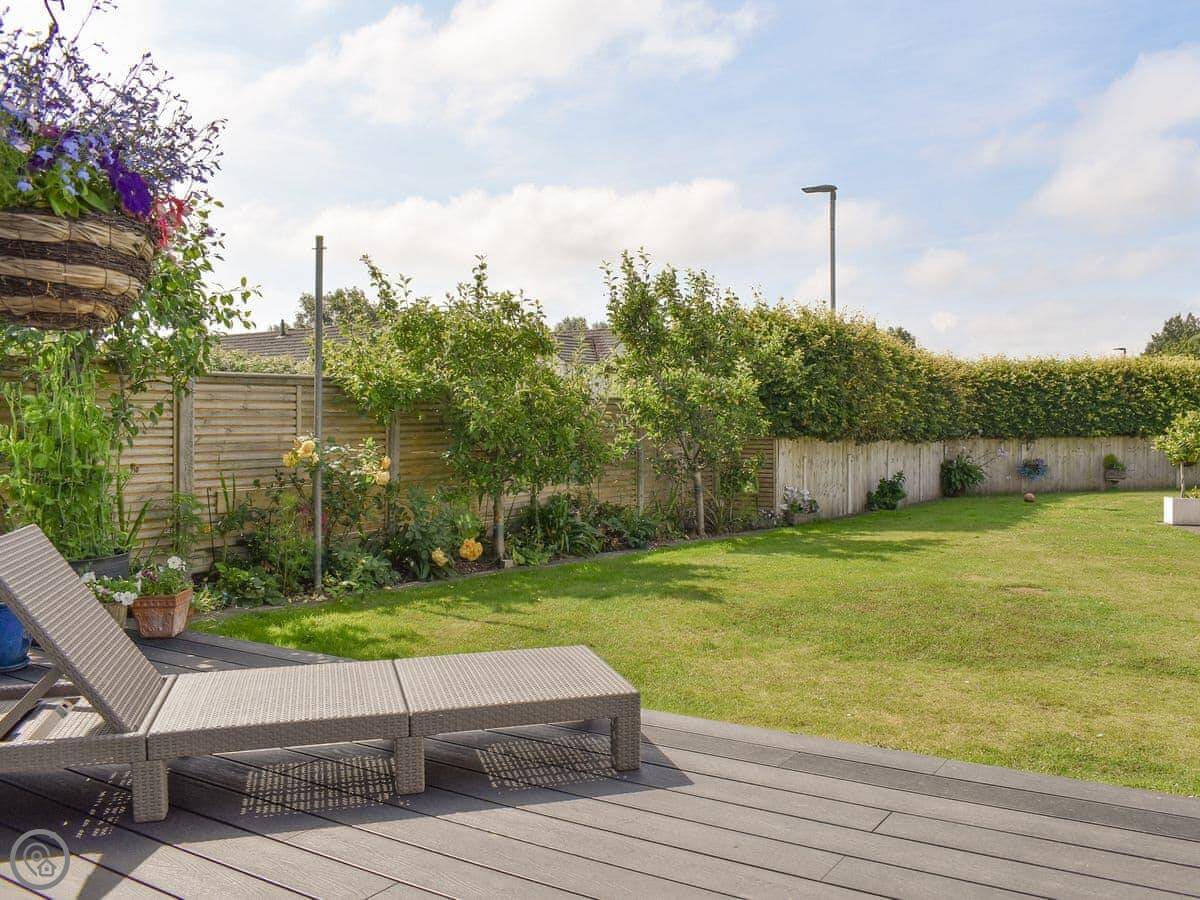 Outside is your own deck with a table, chairs, and loungers. There’s also a shared lawn you can use if you want.