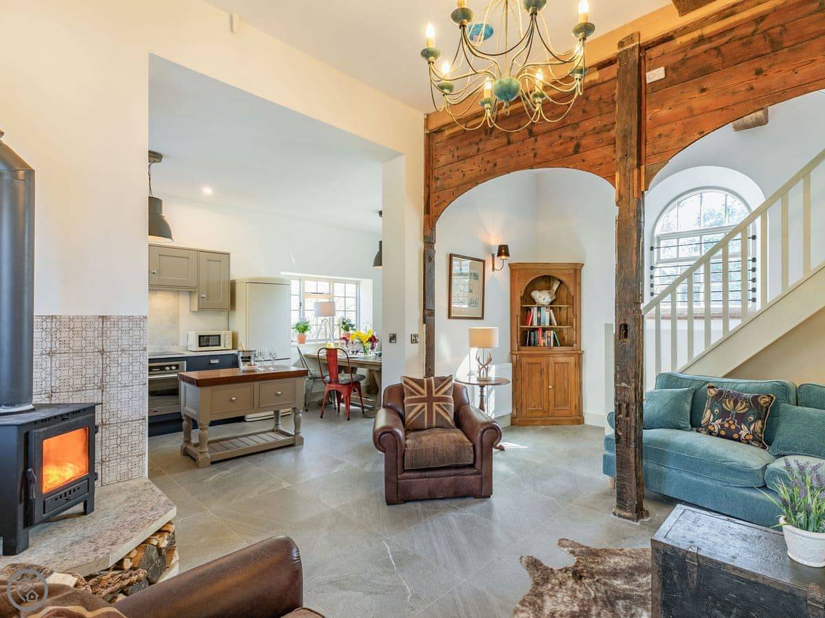 The main room downstairs is open plan. Tile floors, a wood burner. It gets a good view out the back over our lake and the woods. The two bedrooms are upstairs. Both have king size beds. Useful if two couples are sharing.