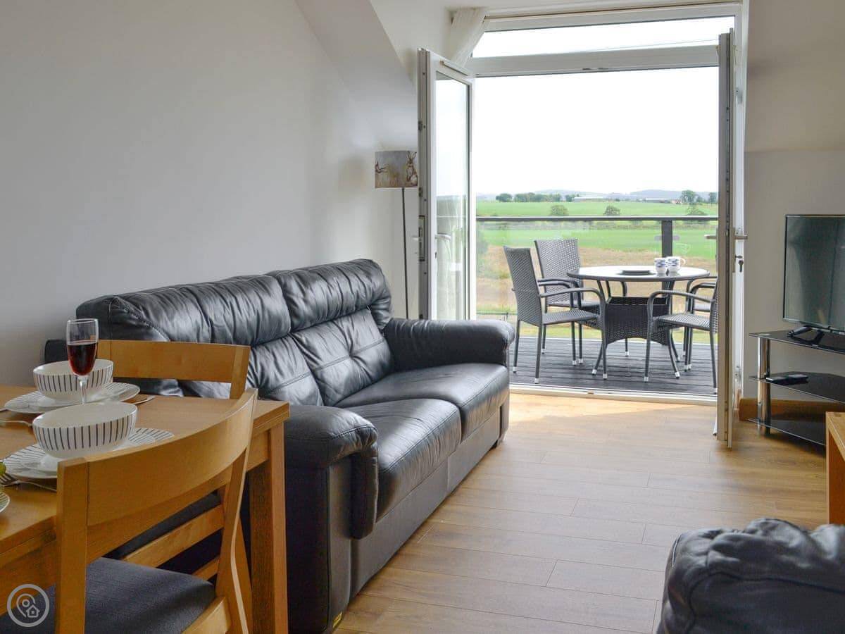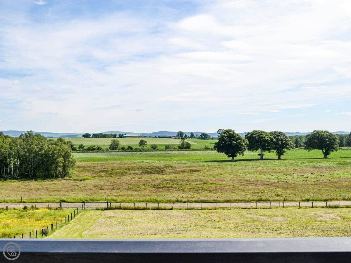 It sleeps four. Two bedrooms and a bathroom downstairs. The living room, dining area and kitchen are all upstairs. That's so you get the best of the view. Patio doors open onto a balcony. You look straight out over farmland towards the Moffat hills. It's a good spot to sit.