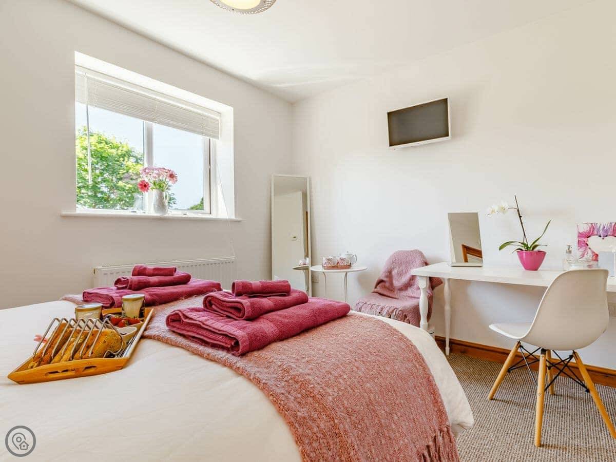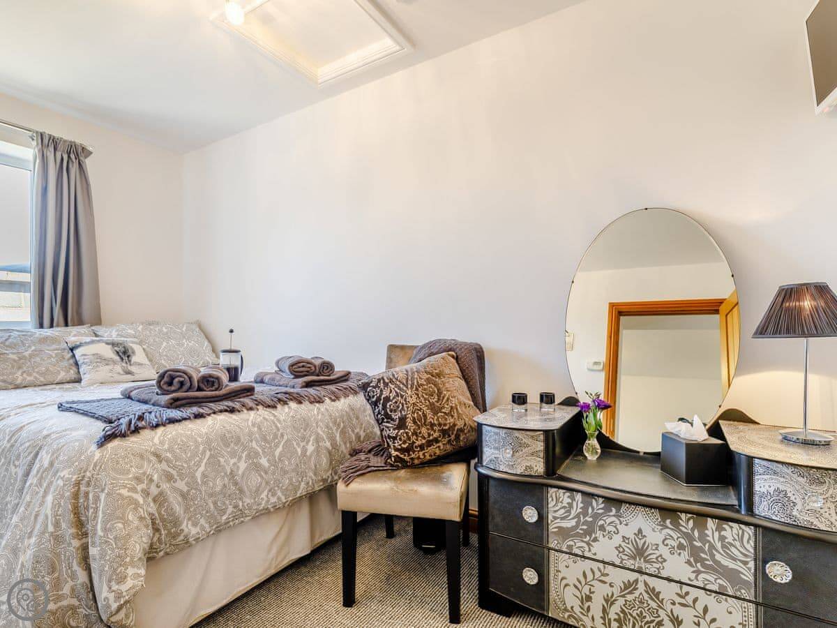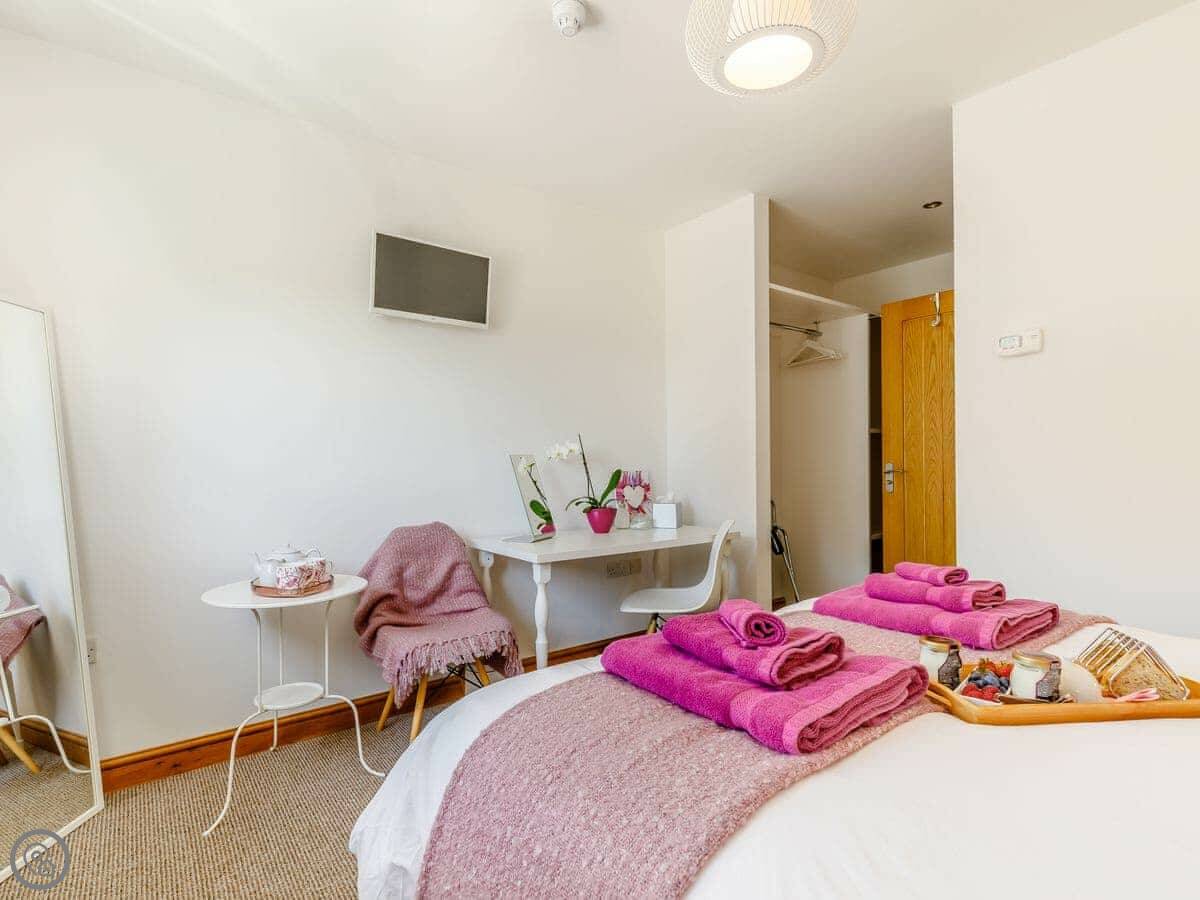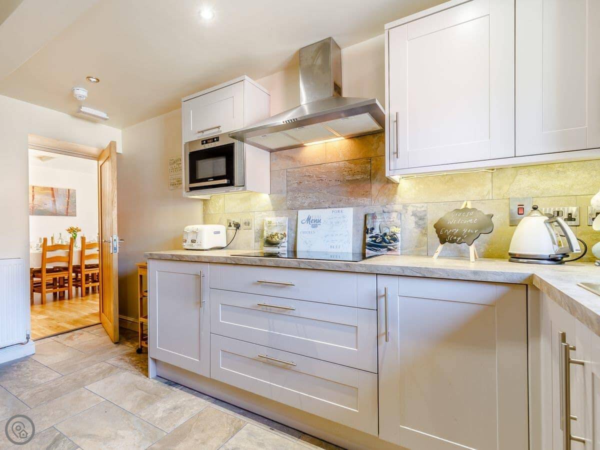 The garden is enclosed, which is good if you're bringing dogs. There's a hot tub and a barbecue. It has a 4 Star rating. It's comfortable and well-equipped. It's not overly fancy.
