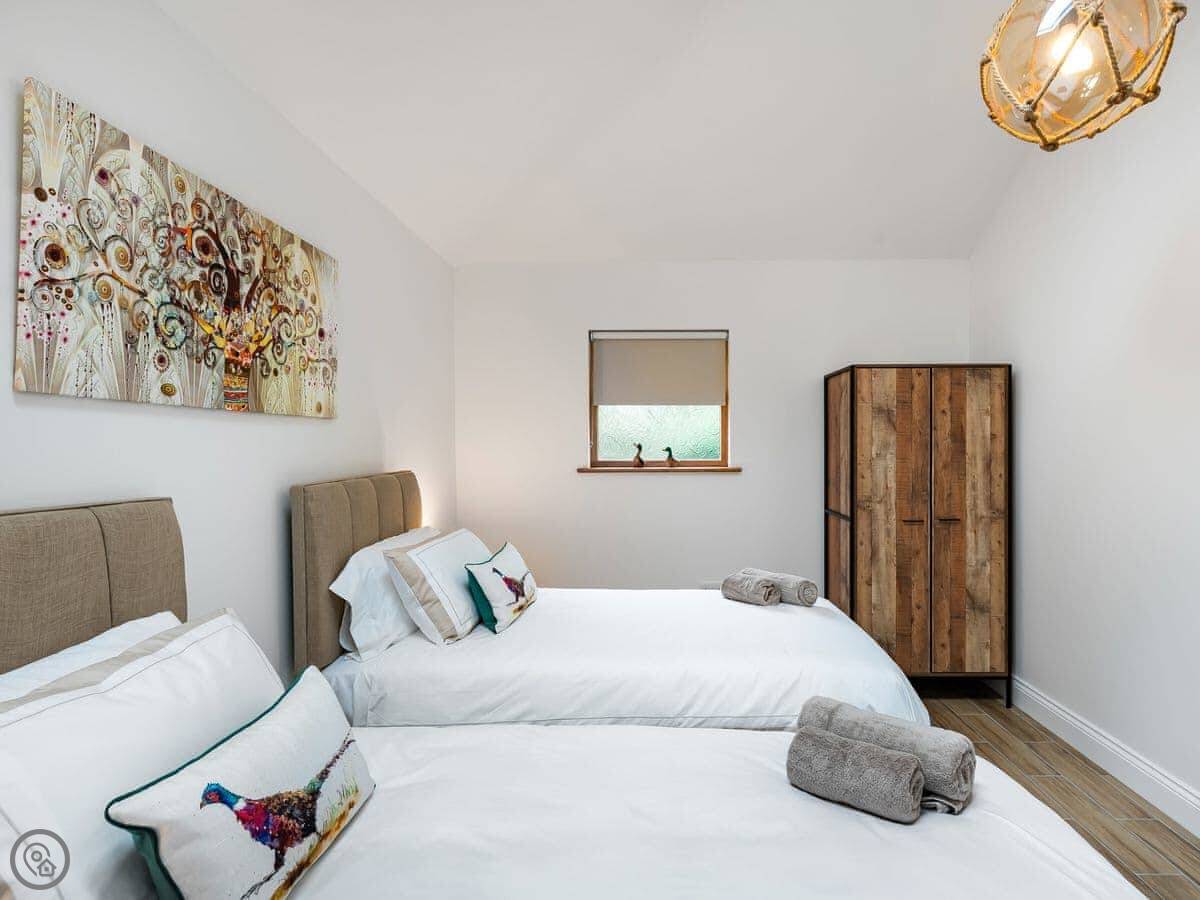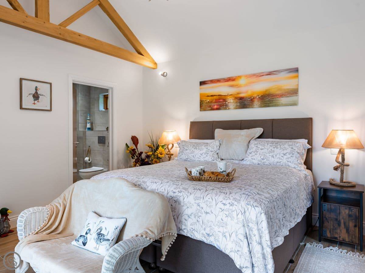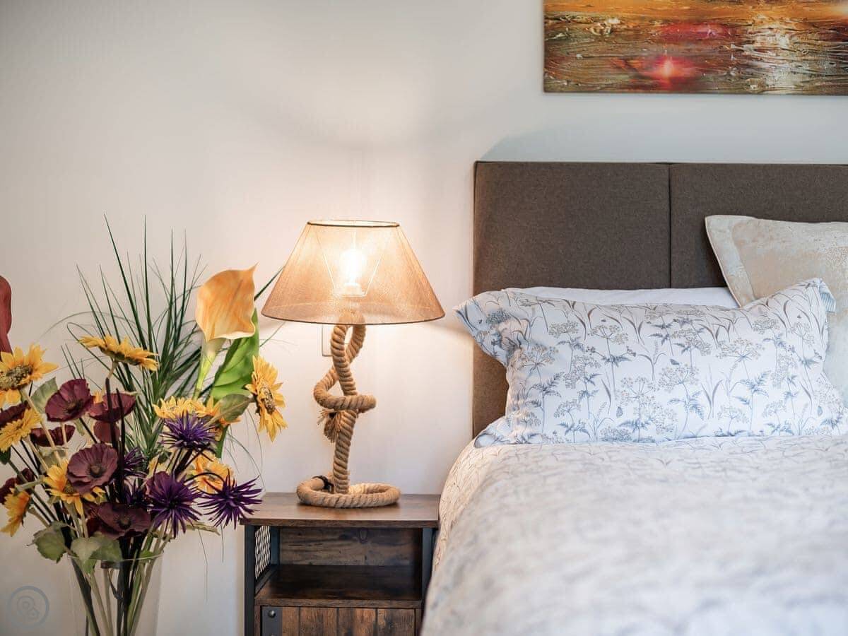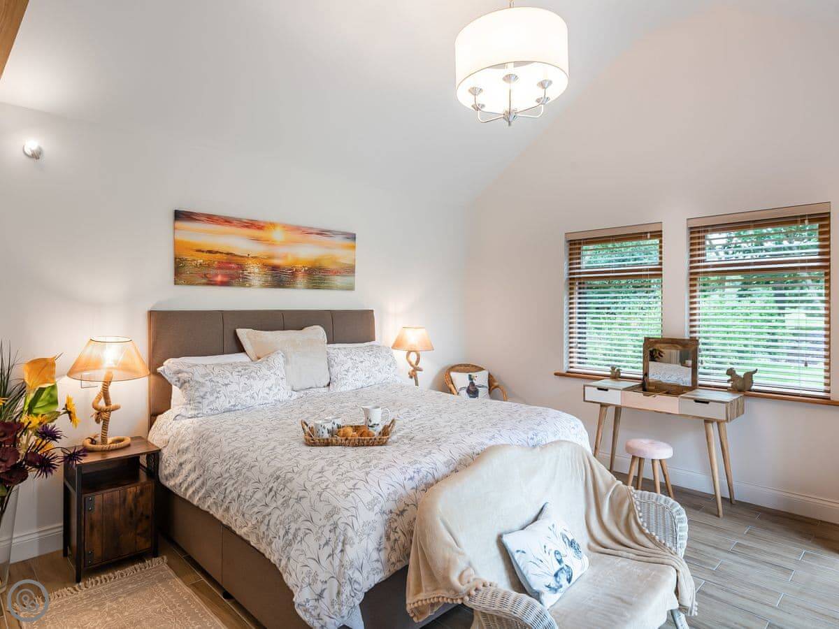 It’s done up to a 5 Star standard. It’s modern inside, open plan with high ceilings. Two bedrooms, both with their own ensuite shower room. Sleeps four.