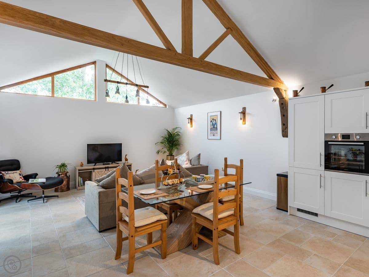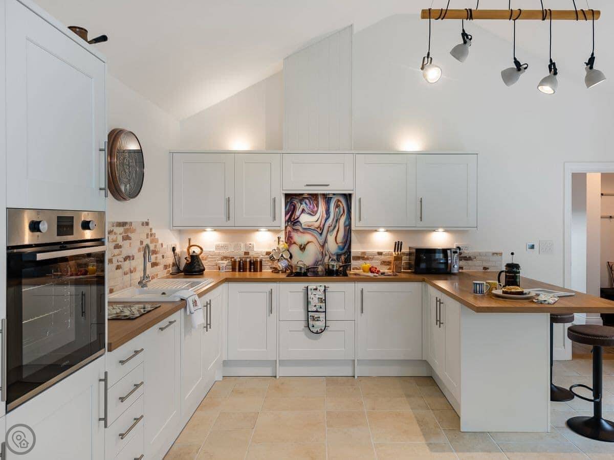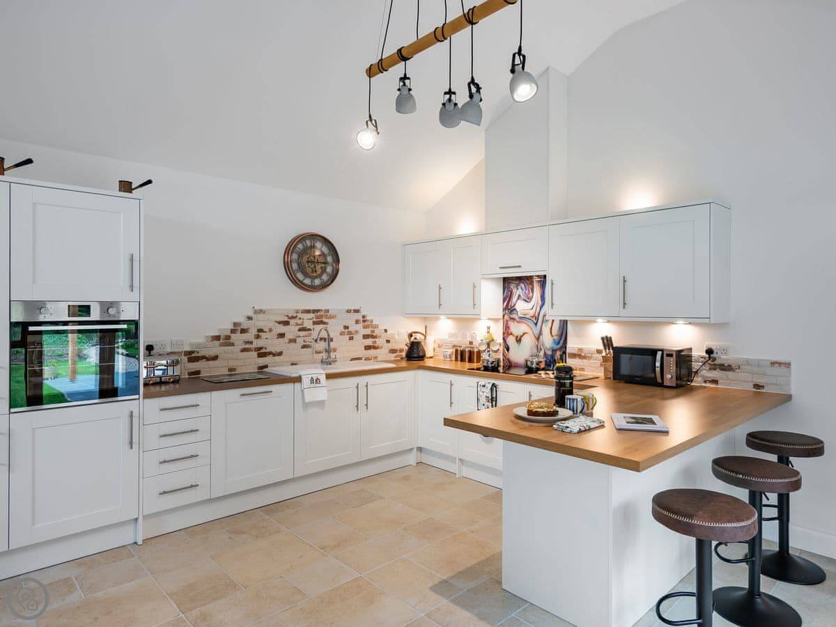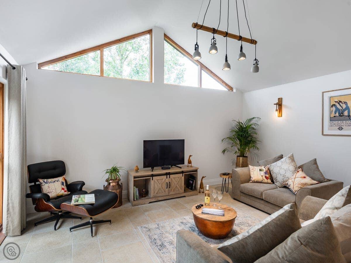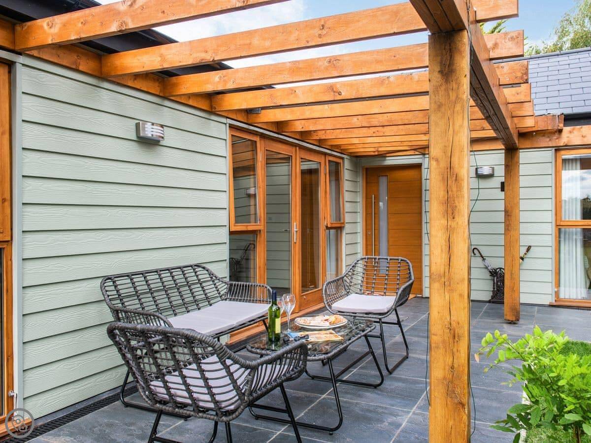It’s done up to a 5 Star standard. It’s modern inside, open plan with high ceilings. Two bedrooms, both with their own ensuite shower room. Sleeps four.