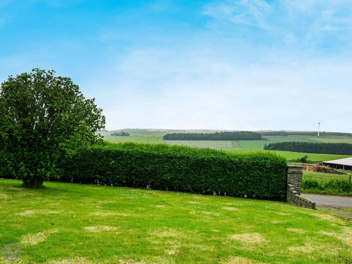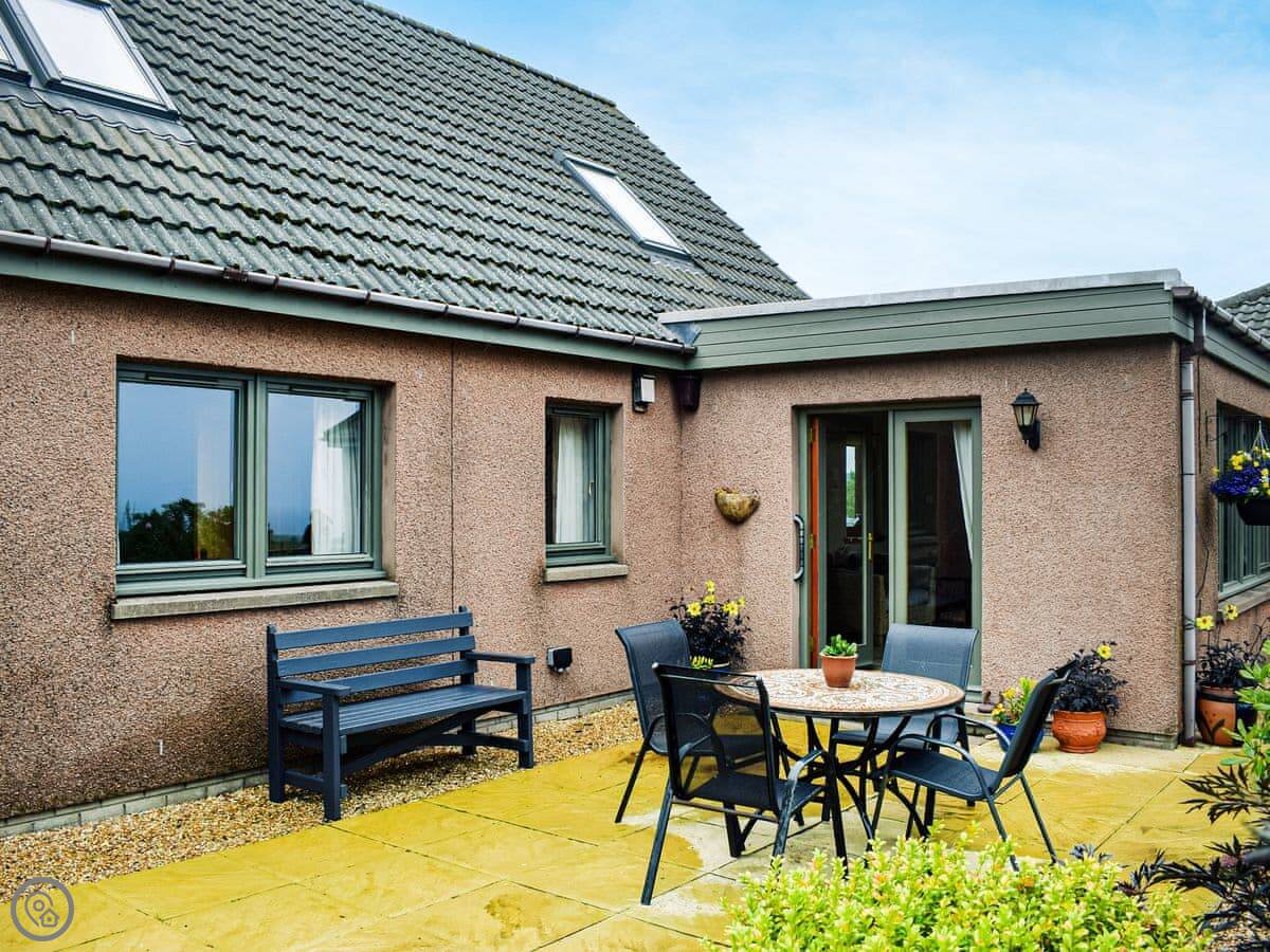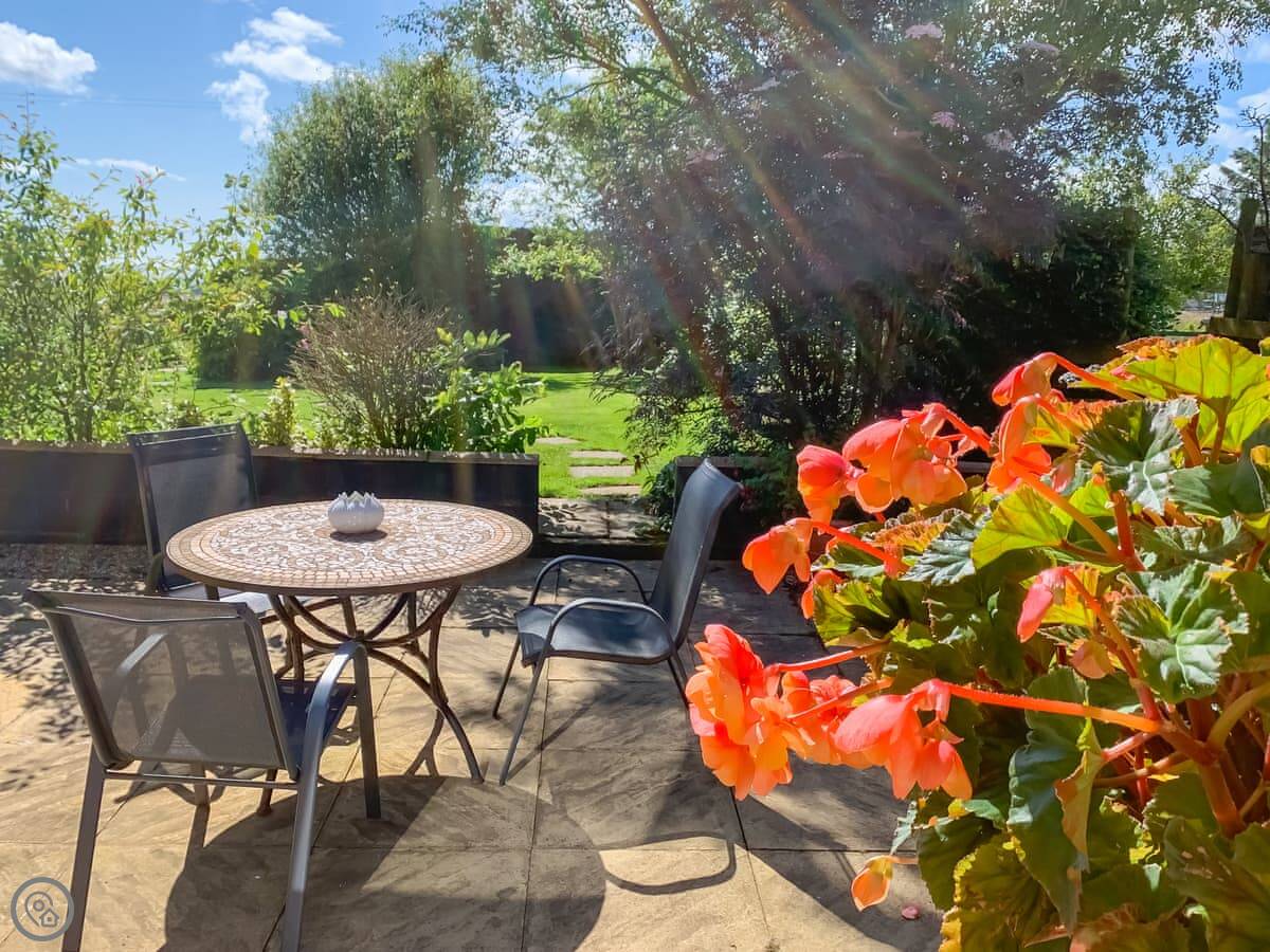 Outside, there's a patio with a table and chairs. It's enclosed, so it's safe for dogs. We allow up to two pets. The garden looks out over open fields. It's quiet.
