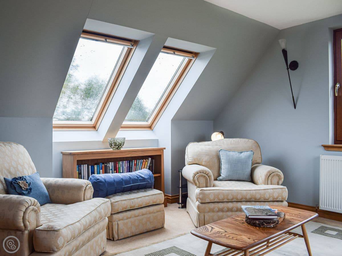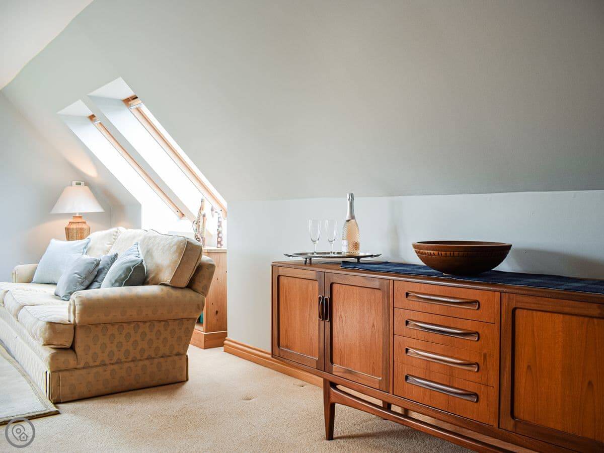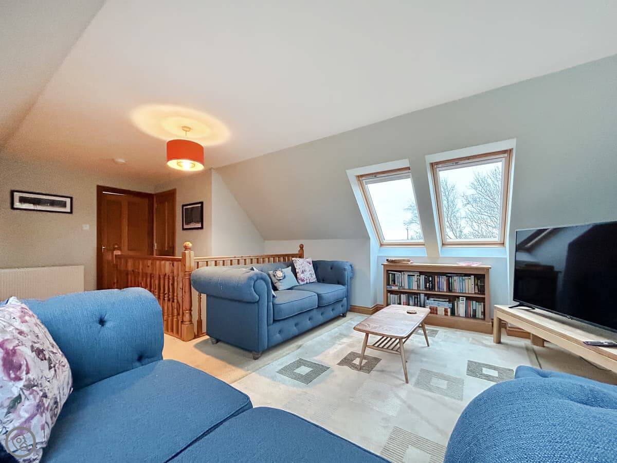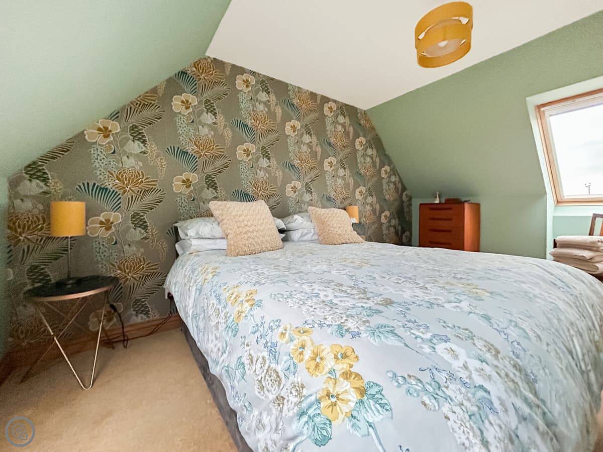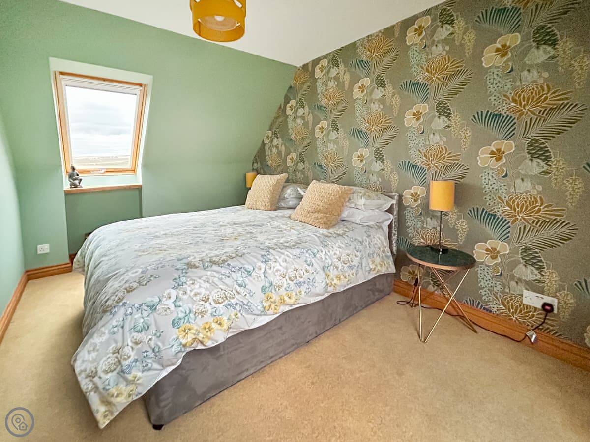 It sleeps four in two king size bedrooms. One bedroom and the shower room are on the ground floor. The other bedroom is upstairs. There's also a second living room upstairs with a sofa. The views from there are good. You can see the fields and a bit of the sea.