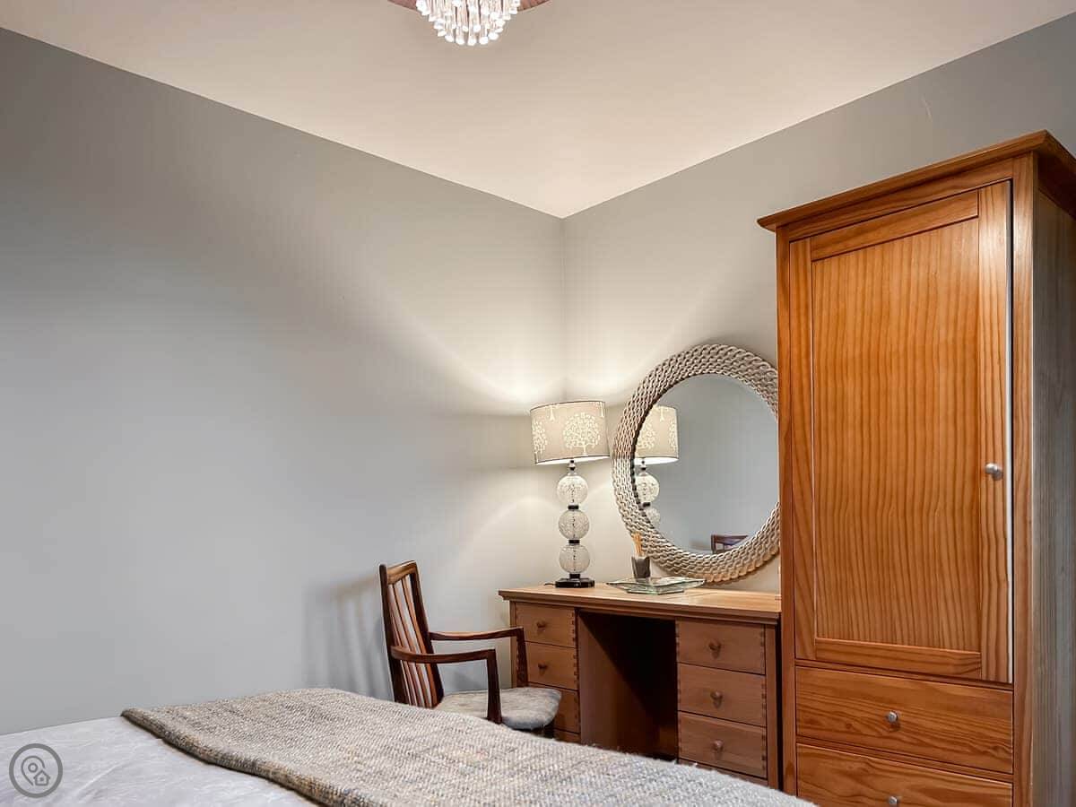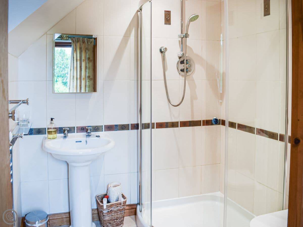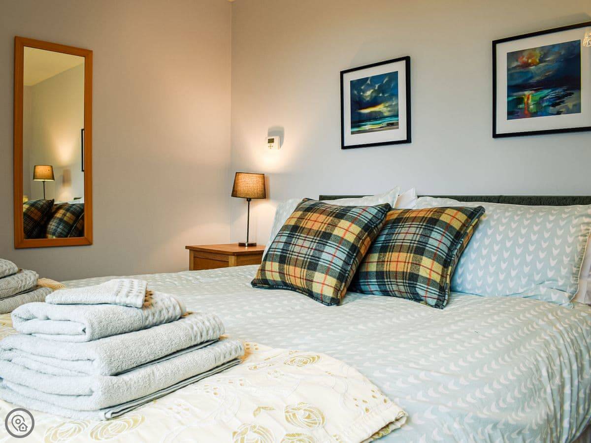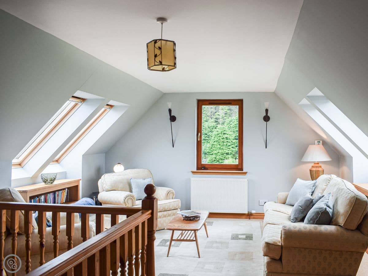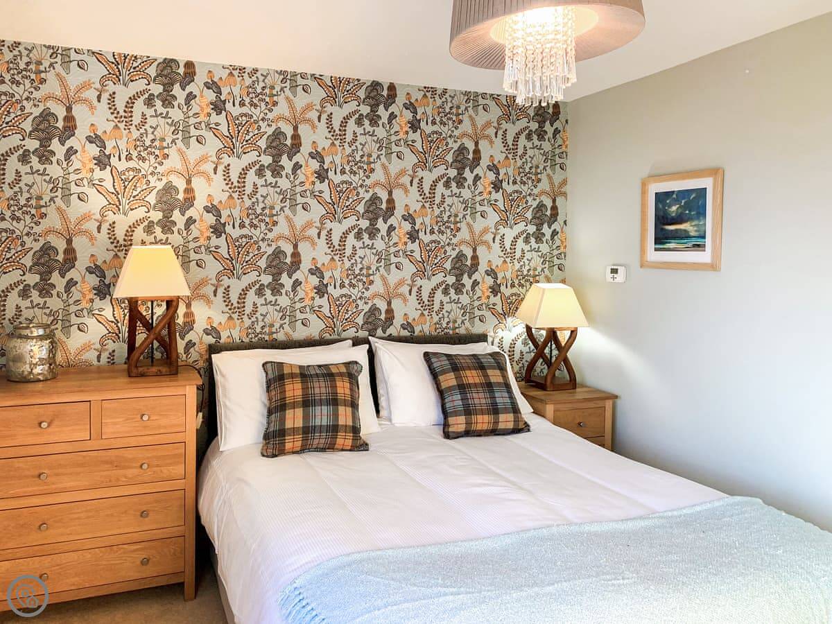 It sleeps four in two king size bedrooms. One bedroom and the shower room are on the ground floor. The other bedroom is upstairs. There's also a second living room upstairs with a sofa. The views from there are good. You can see the fields and a bit of the sea.