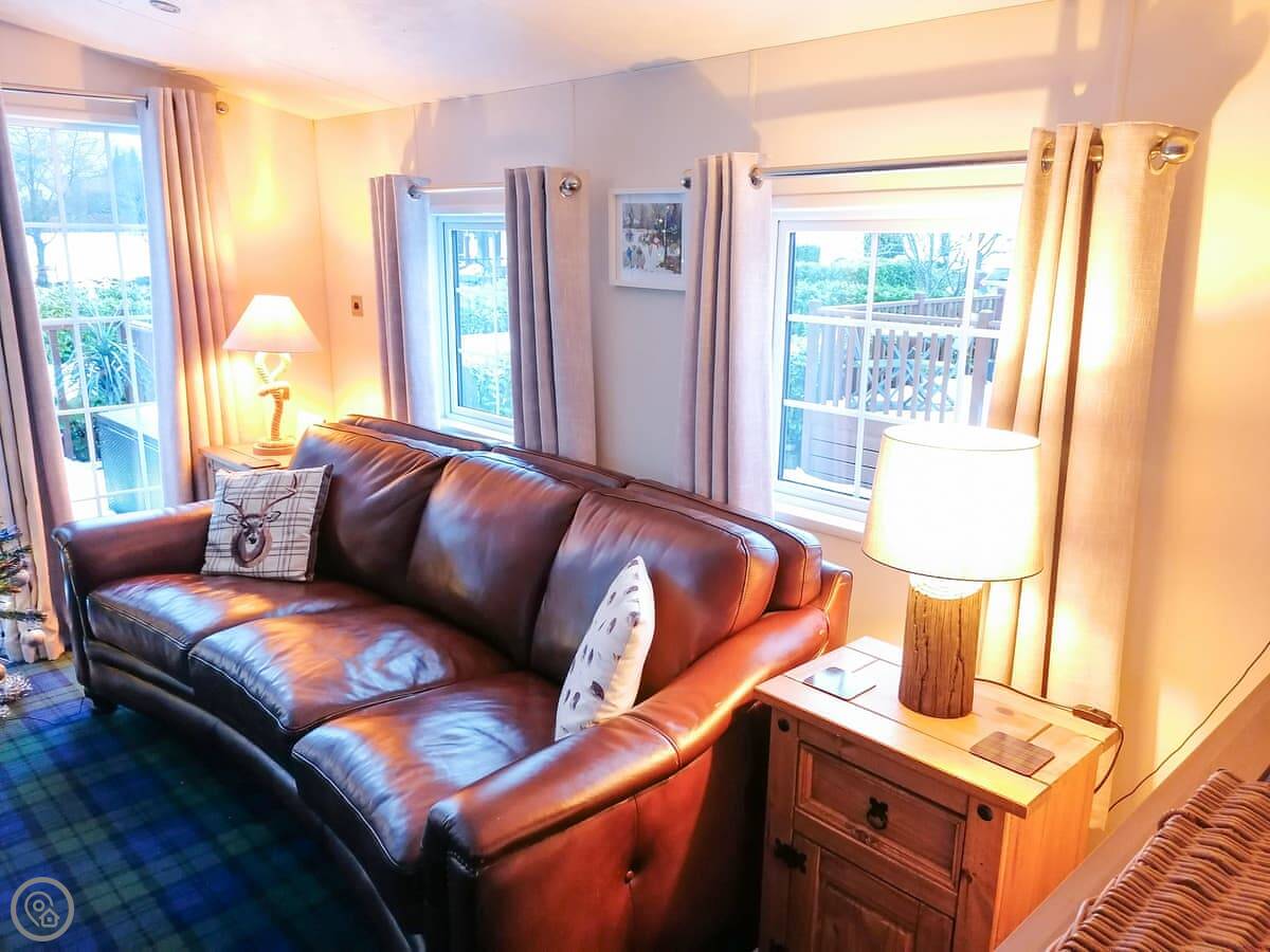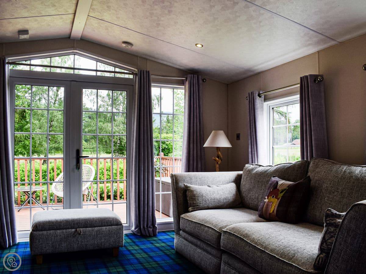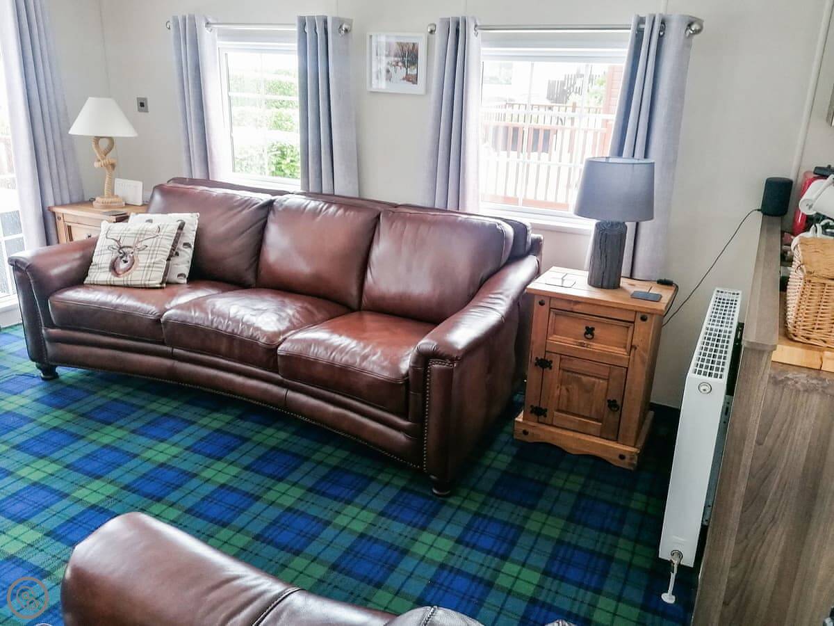 Salmon Leap Lodge is just outside Dollar, in Clackmannanshire. It's a detached lodge, all on one level. You get your own decking and a bit of lawn out the front, which looks out towards the Ochil Hills. You can hear the River Devon from the garden.
